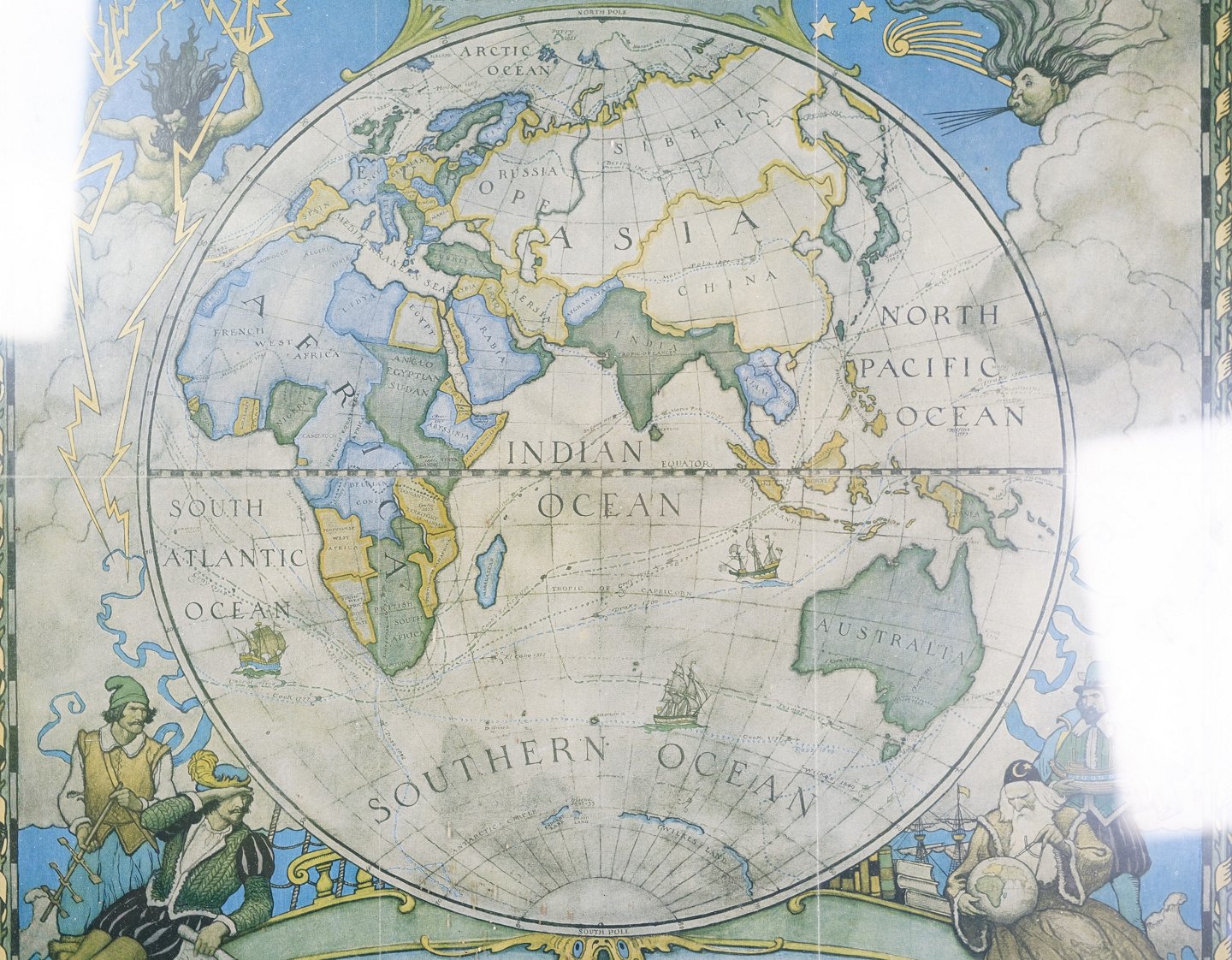 Et kort over den østlige halvkugle med titel ”Map of discovery” fra omkring 1920’erne.