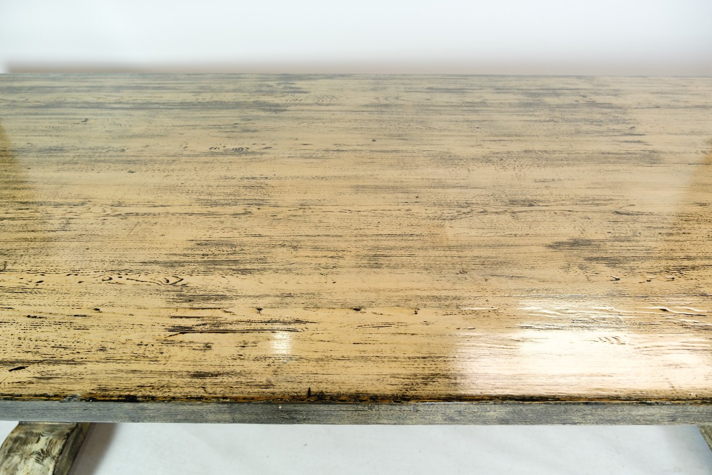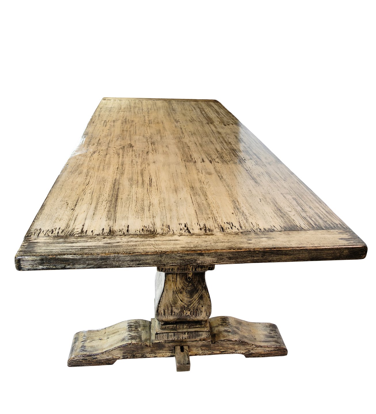 Langbordet er udført i en meget fin kvalitet, hvilket ses i både dets konstruktion og detaljer. Søjlekonstruktionen giver bordet en elegant og stabil base, der både er funktionel og æstetisk tiltalende. Den originale farve og patina tilføjer en unik charme og karakter til bordet, hvilket gør det til et enestående stykke i enhver indretning.