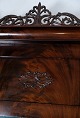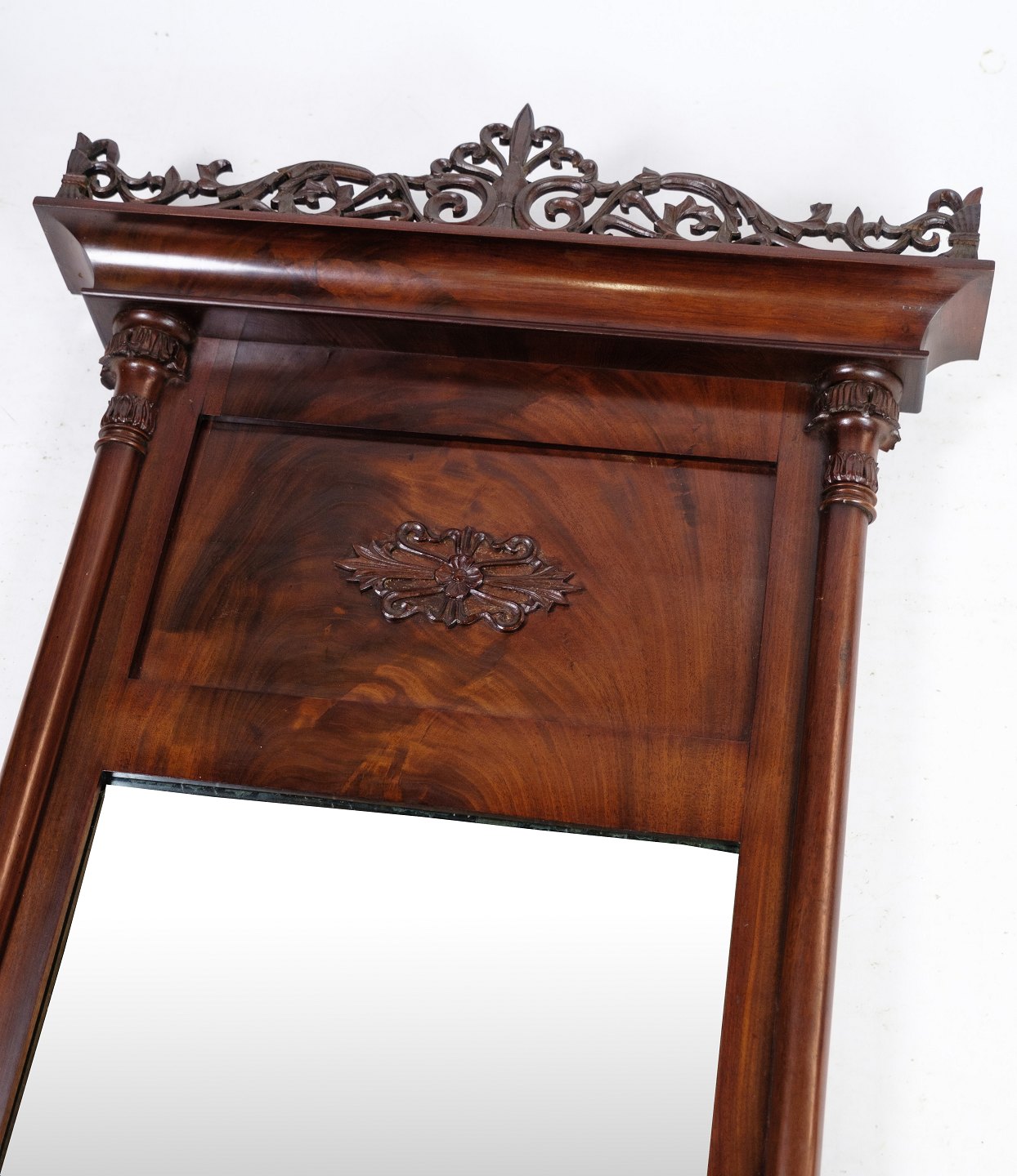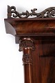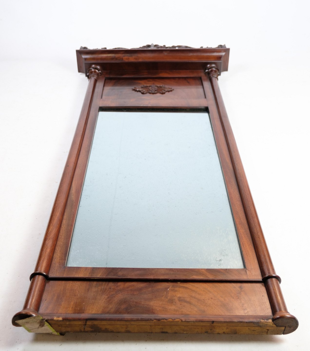 Spejl af hånd poleret mahogni, fra perioden sen empire med udskæringer lavet i Danmark fra omkring 1840'erne.