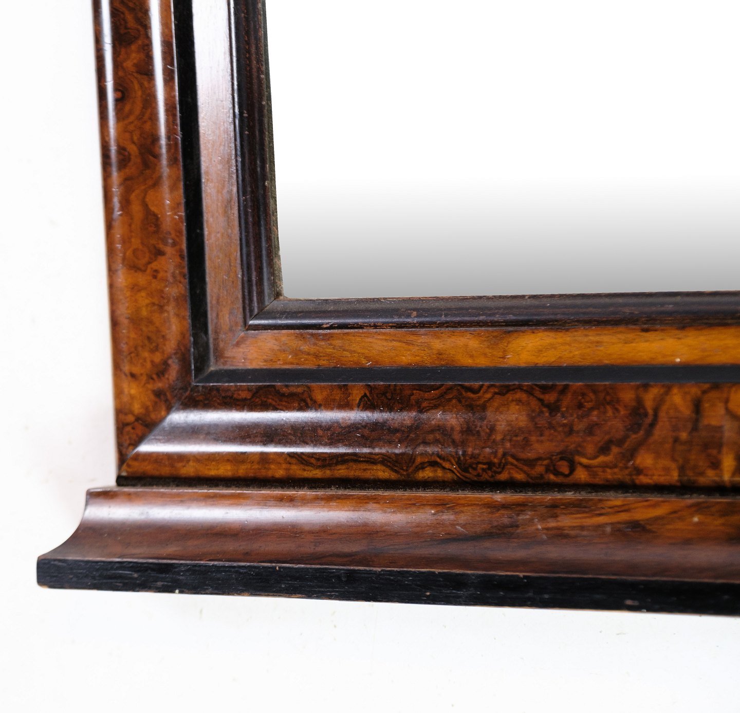 Spejl af hånd poleret mahogni, med udskæringer, lavet i Danmark fra omkring 1880'erne