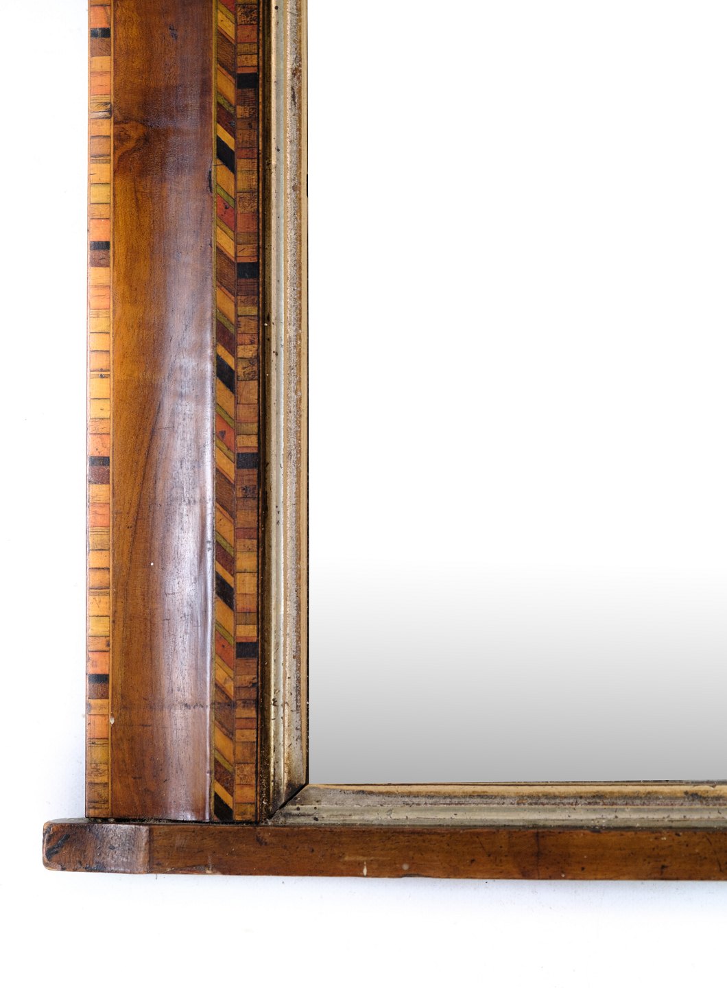 Antikt spejl i træsorten valnød med intarsia fra omkring 1880'erne.