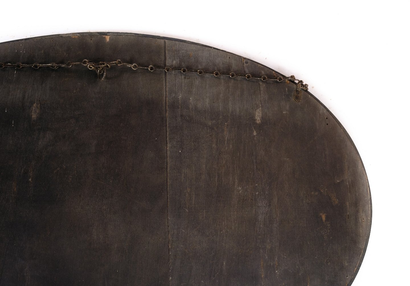 Ovalt spejl i mørkt træ fra omkring år 1920'erne. Vil blive istandsat inden eventuelt salg.