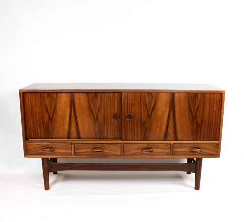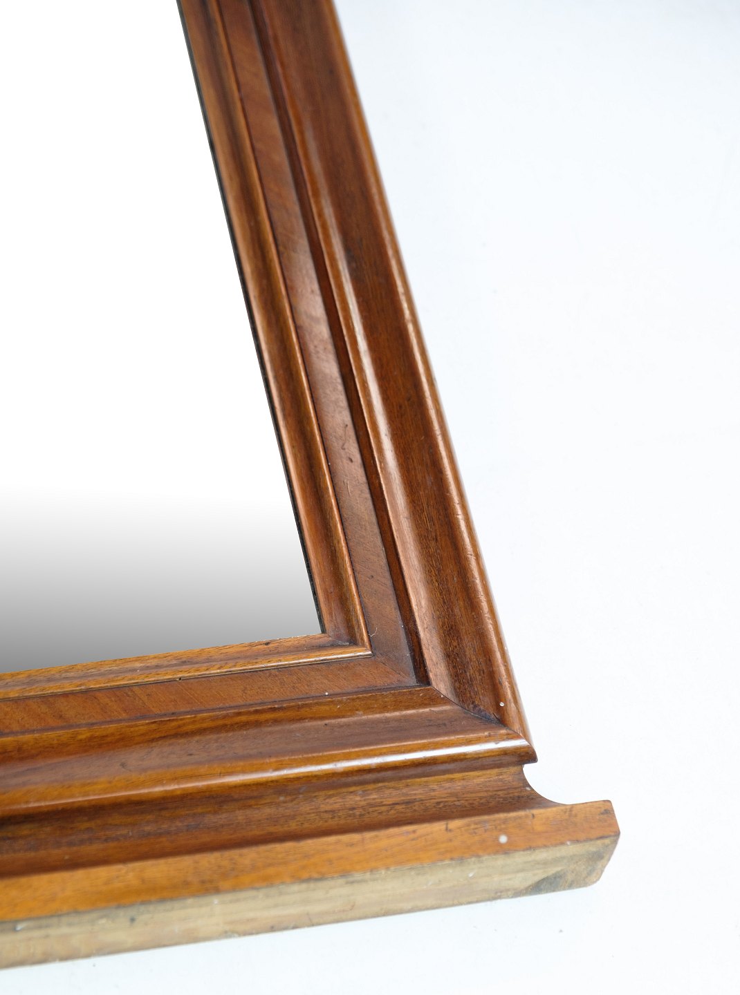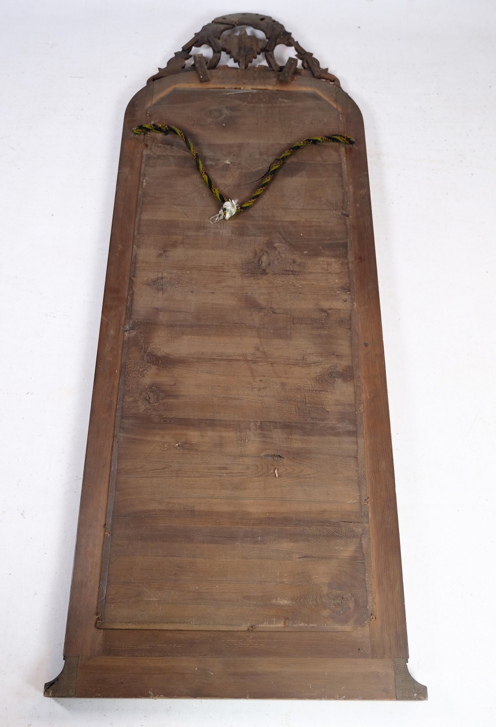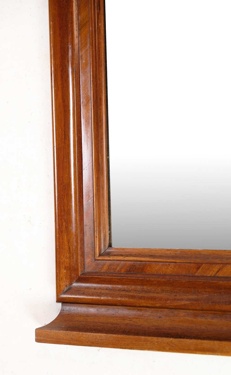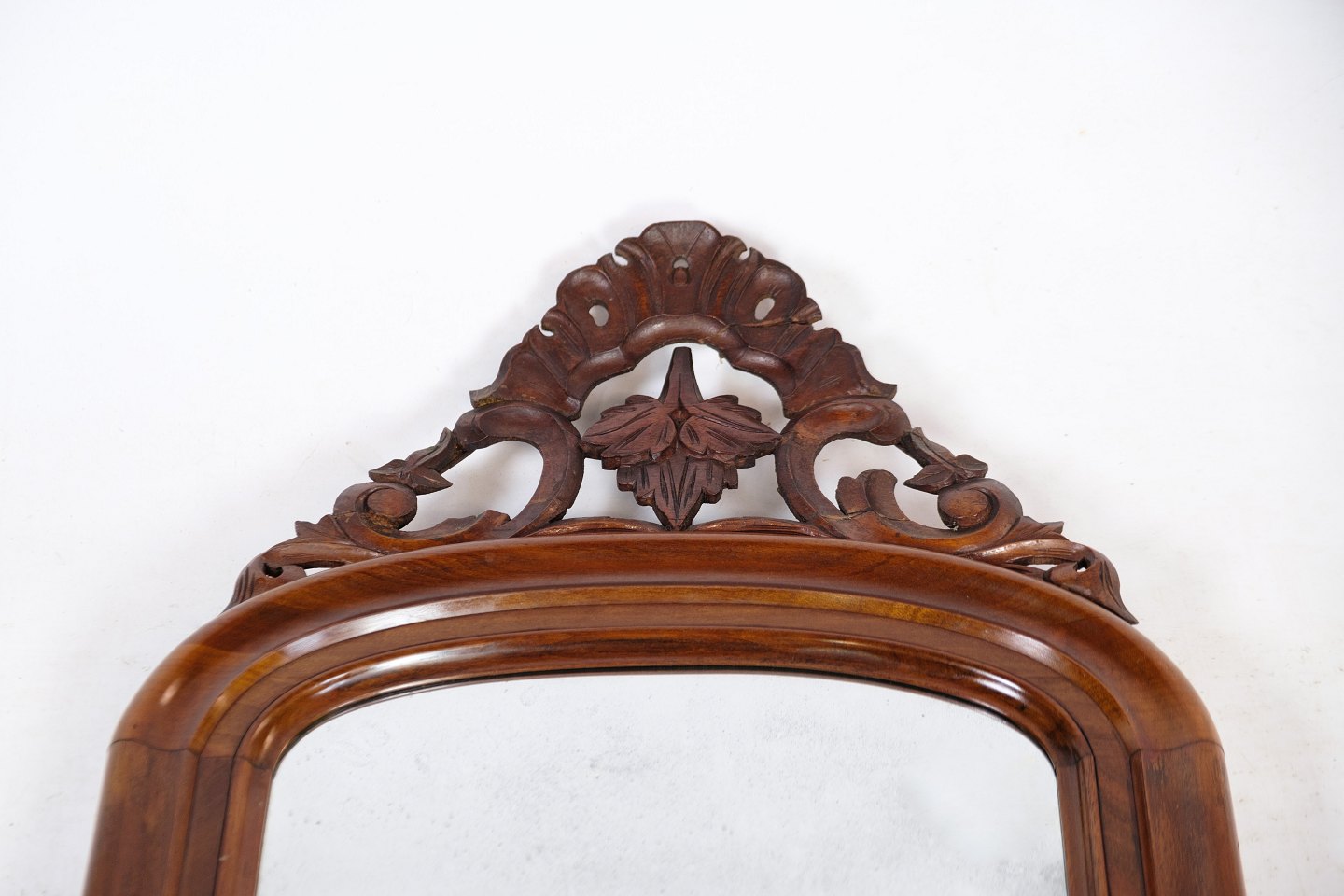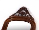 Antik spejl i træsorten mahogni, dekoreret med udskæringer fra omkring år 1860'erne.