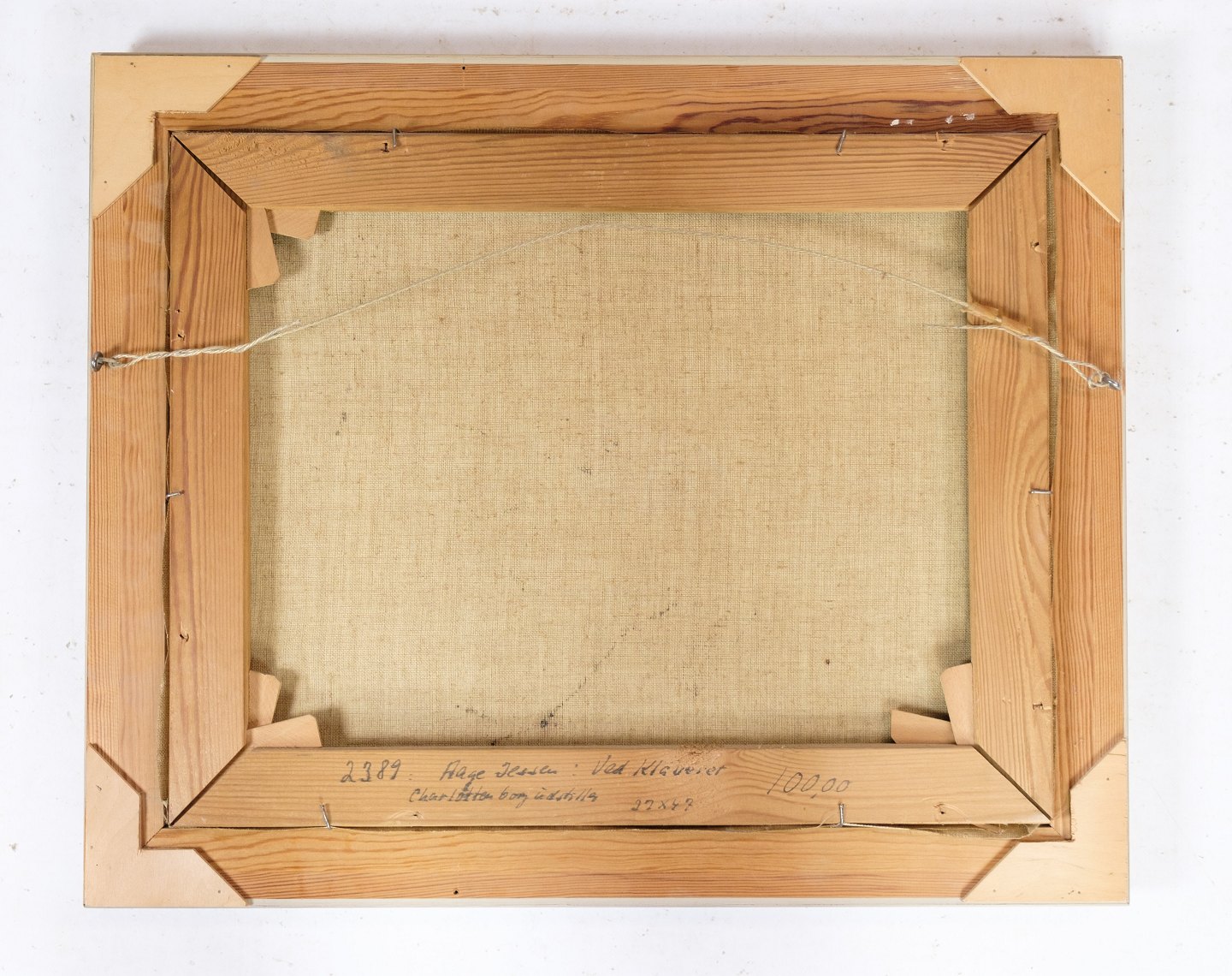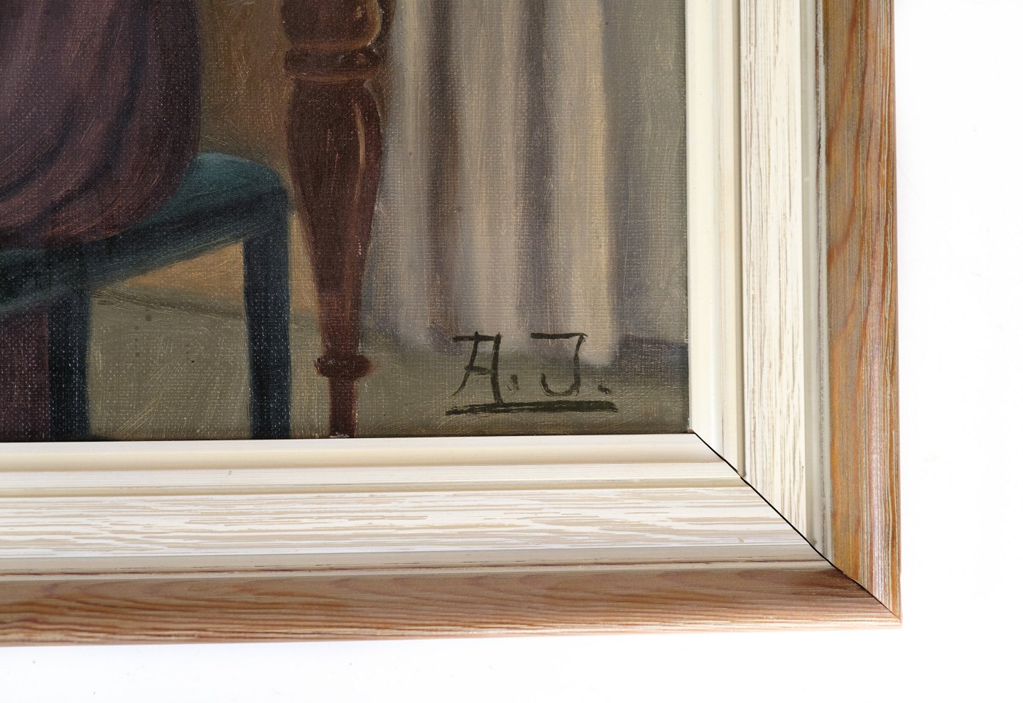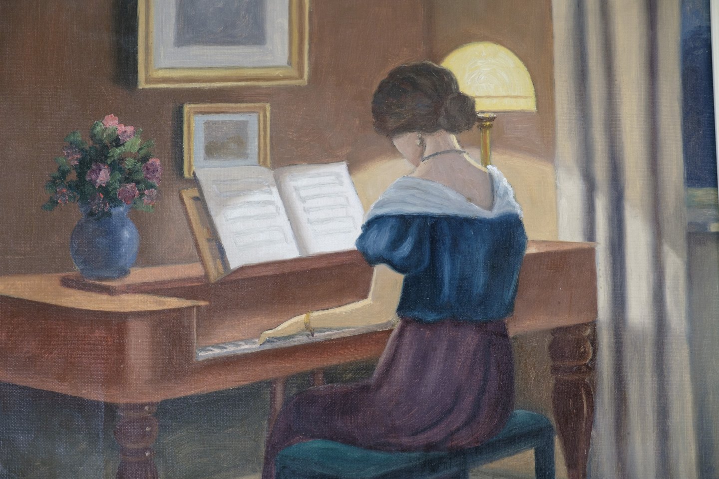 SoldOil painting on canvas by Aage Jessen, an interior picture with motif at the piano exhibited at Charlottenborg from around the 1950s.