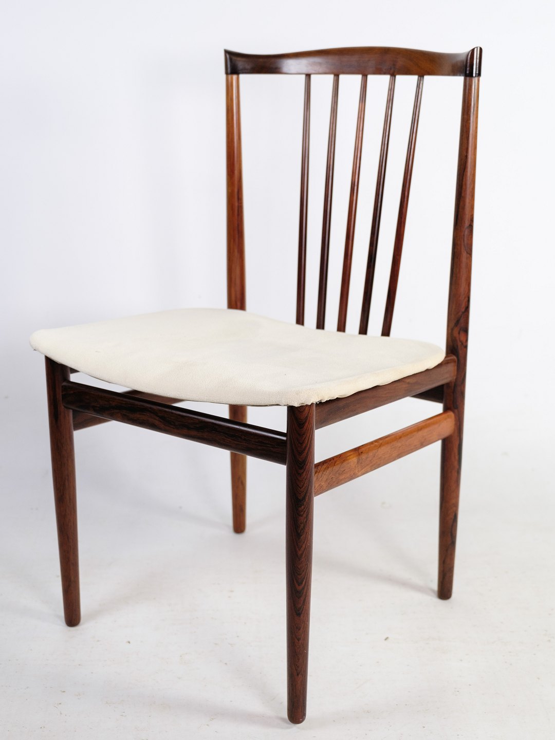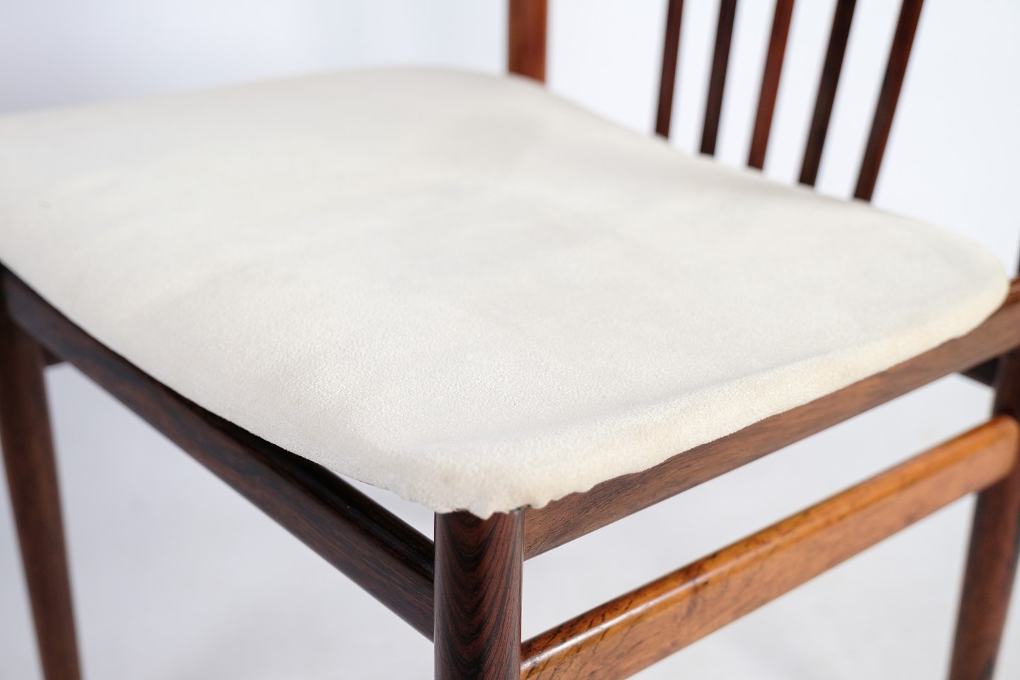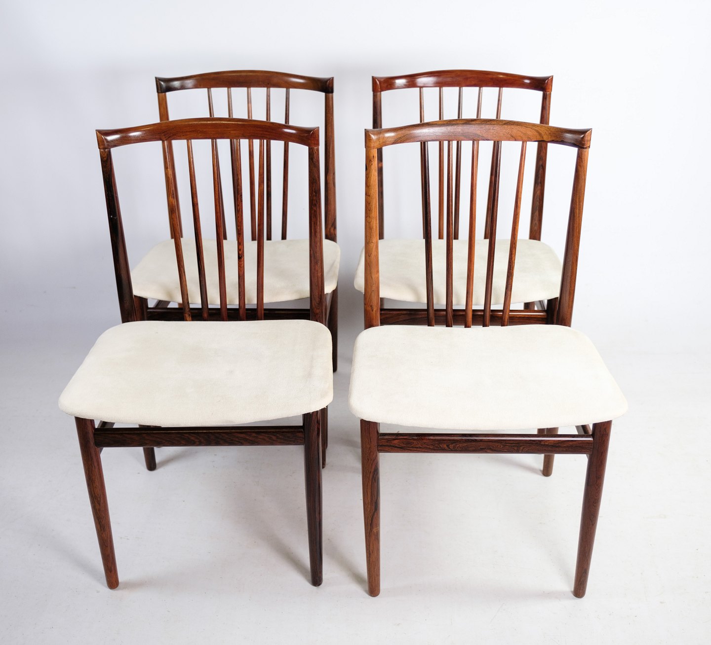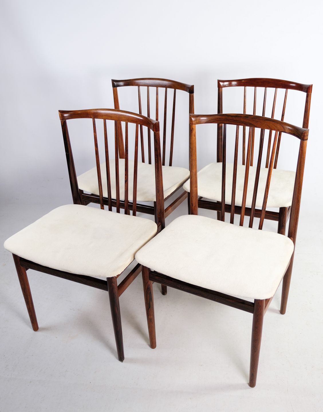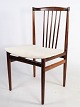 A set of four dining chairs in rosewood designed by Henning Sørensen in 1968. The chairs are in very good condition with light fabric.