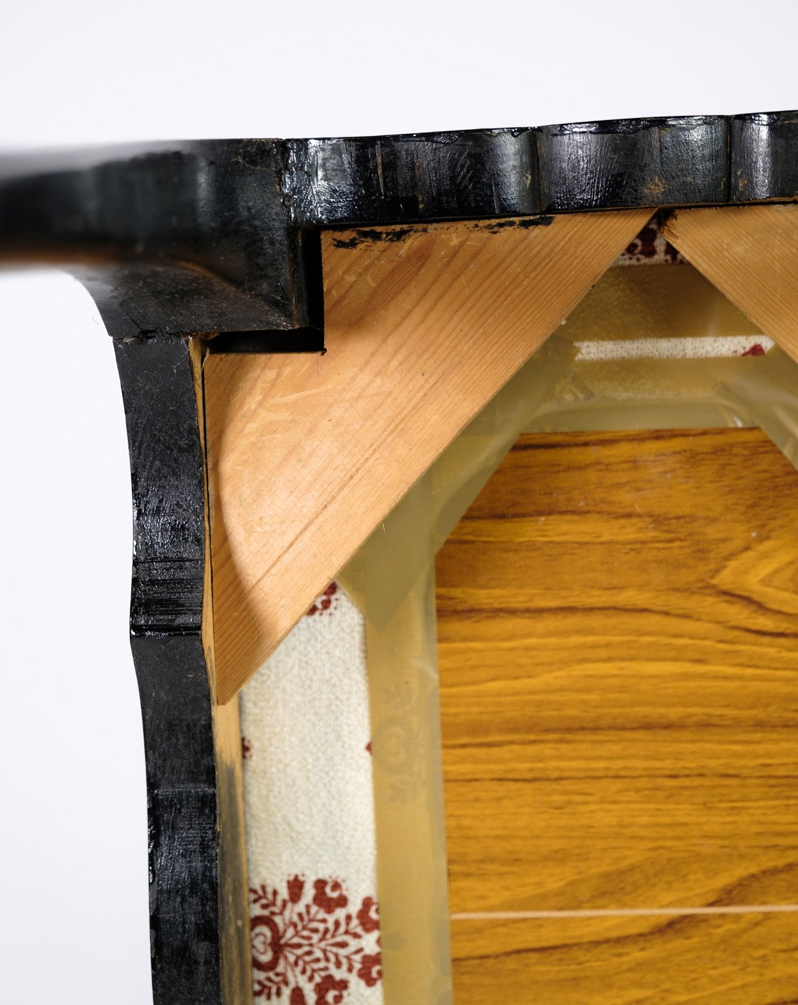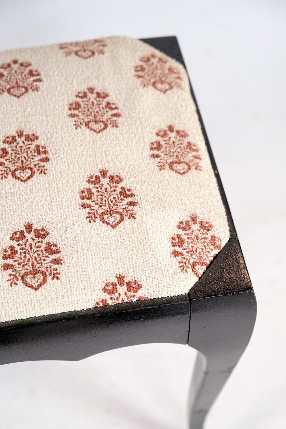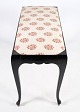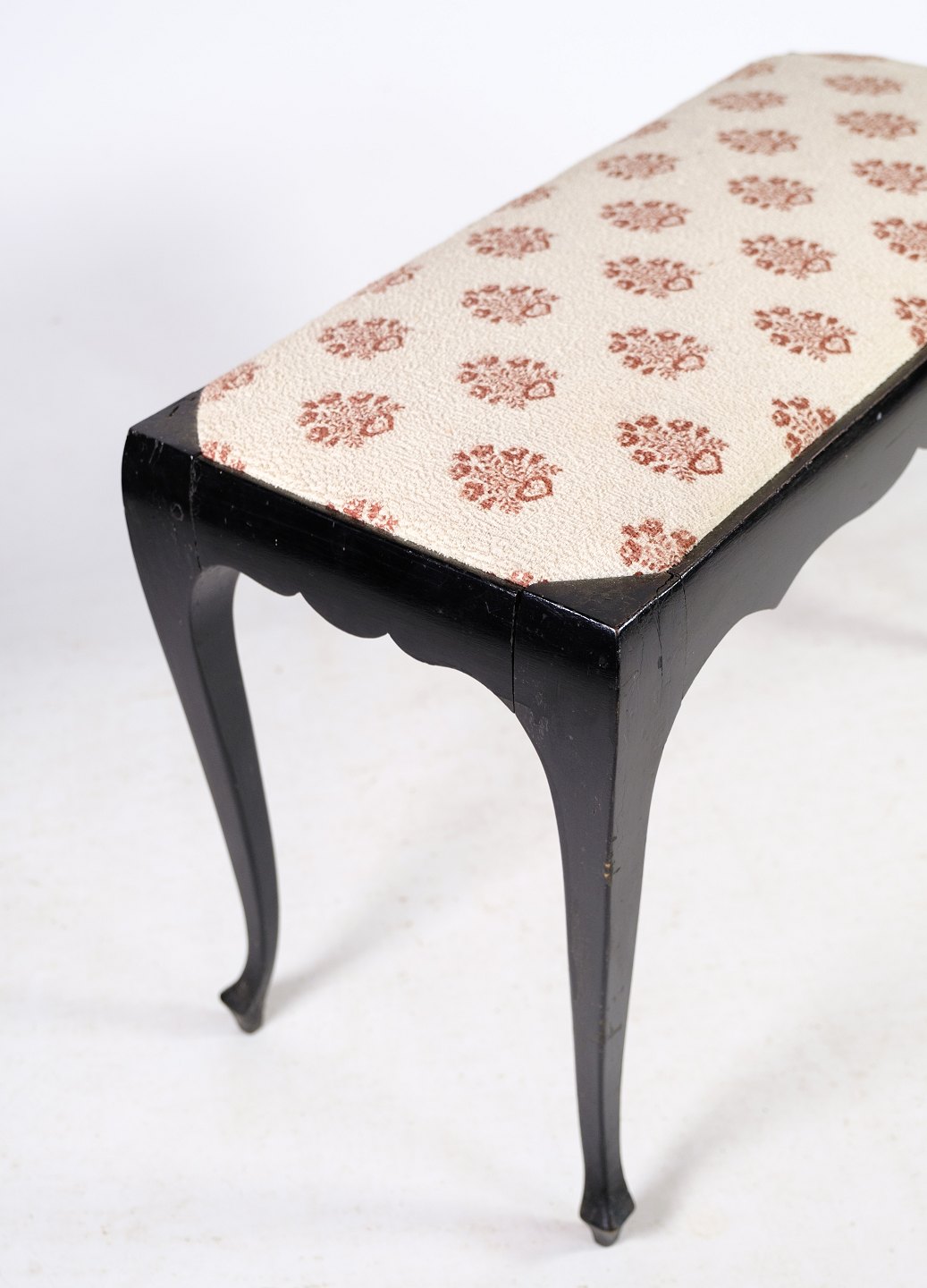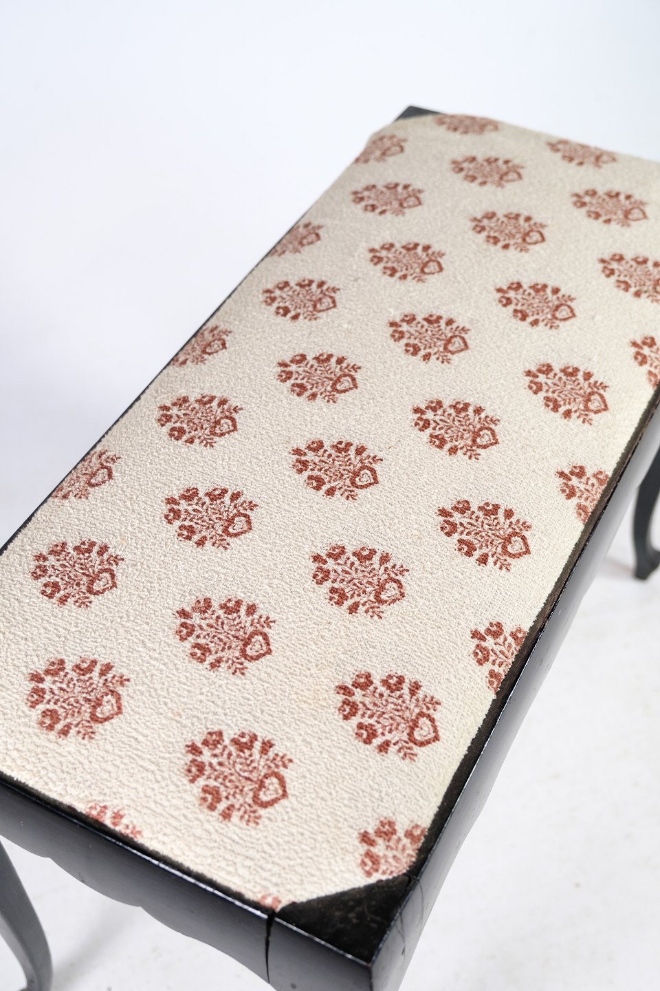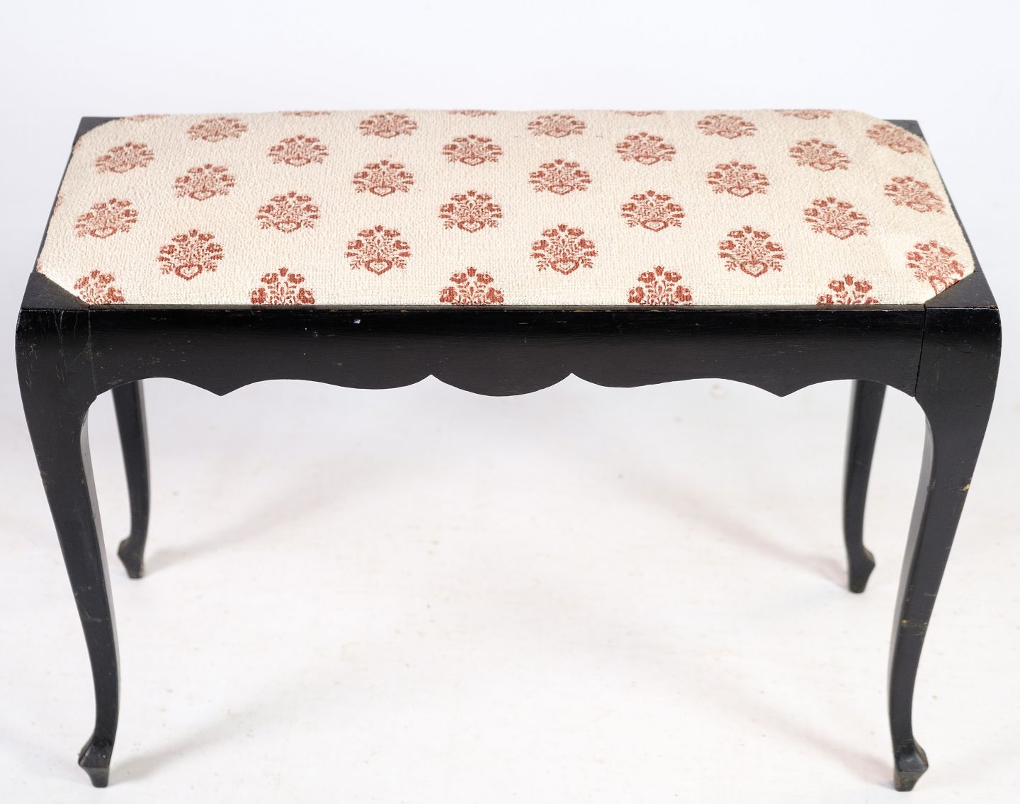 SolgtKlaverbænk i mørkt mahogni med lyst uldstof fra år 1930'erne.