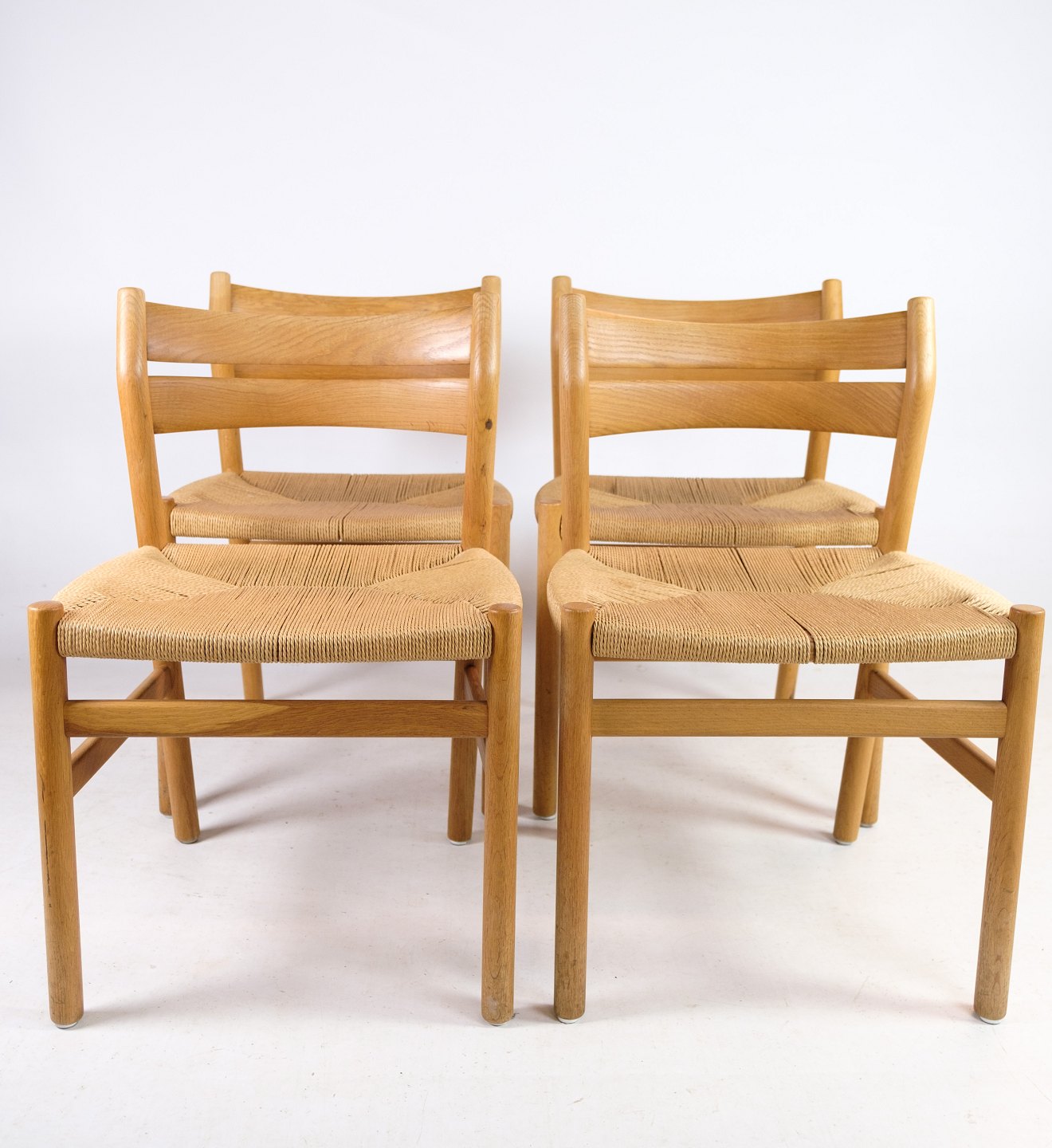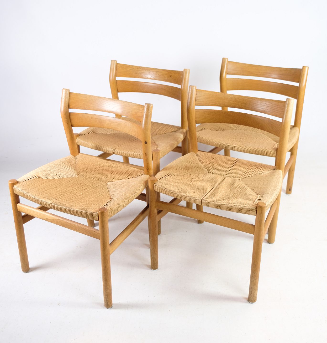 SolgtSæt af firespisestuestole, model BM1, i egetræ og flet designet af Børge Mogensen fra 1960erne. Stolene er i flot brugt stand.