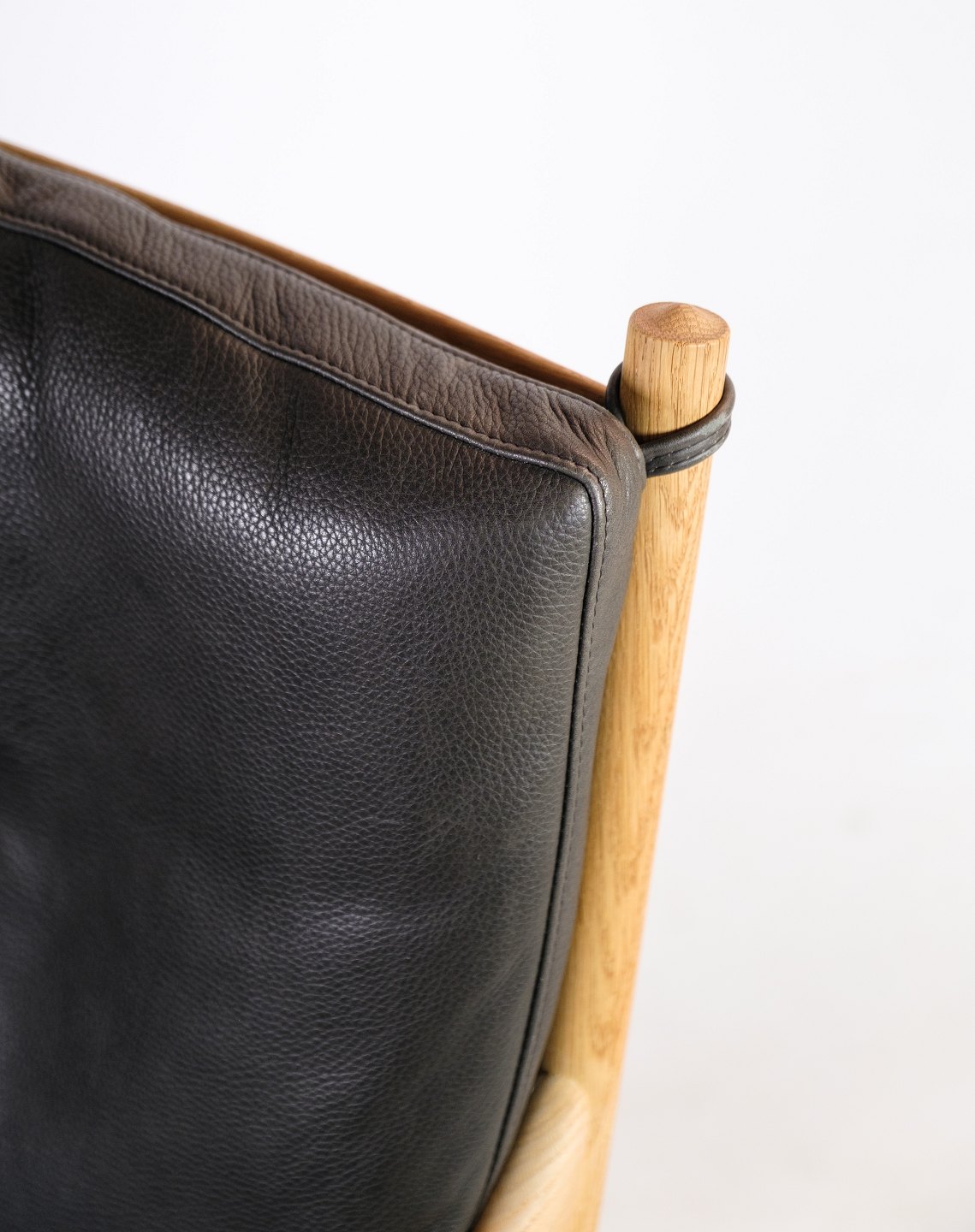 Stolene har flotte sorte læderhynder, der er polstret for optimal komfort. Læderet er af høj kvalitet og giver et klassisk og elegant look til stolene. Sædet på stolen er håndvævet i flet, hvilket giver en smuk og unik tekstur til stolen, og sædet er fastgjort til stellet med fine detaljer i messing, der tilføjer en ekstra touch af elegance.