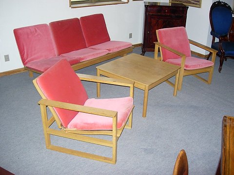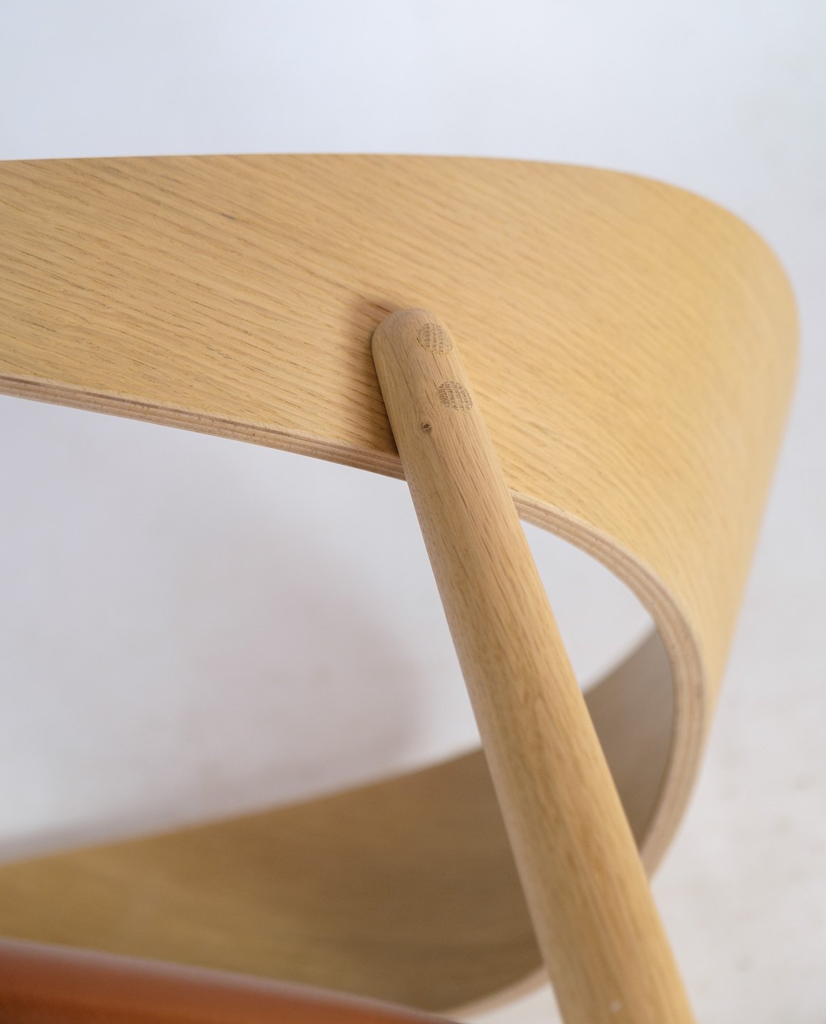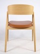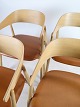 SolgtSæt af 4 spisestuestole, model AC2, af Andersen i sæbebehandlet egetræ. Står med flot betrukket sæder i cognac.