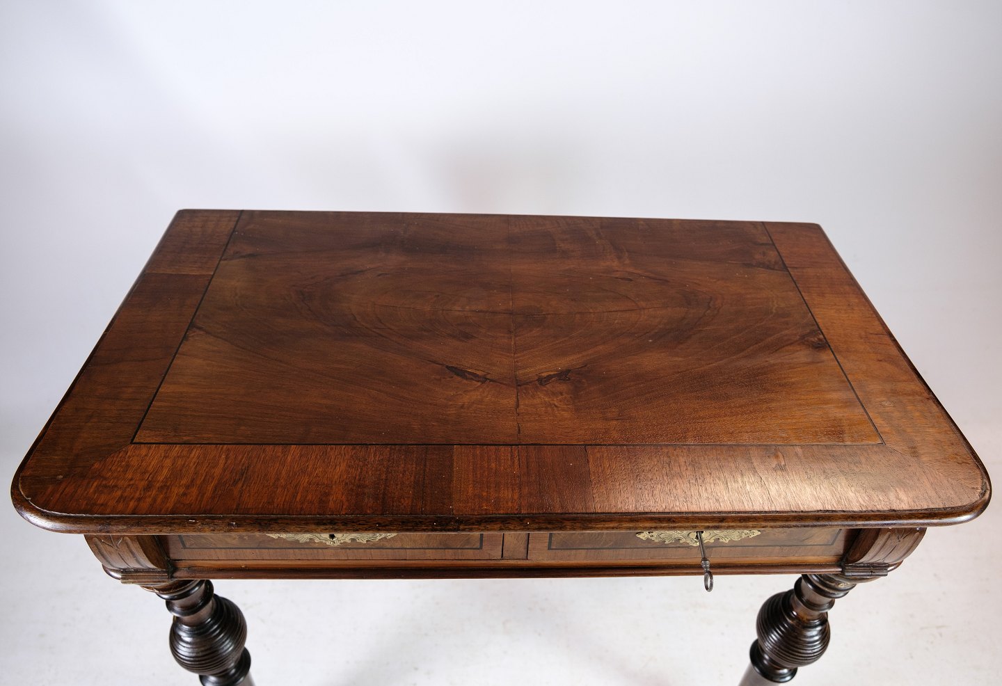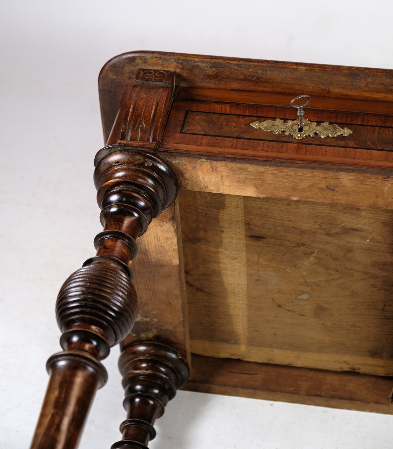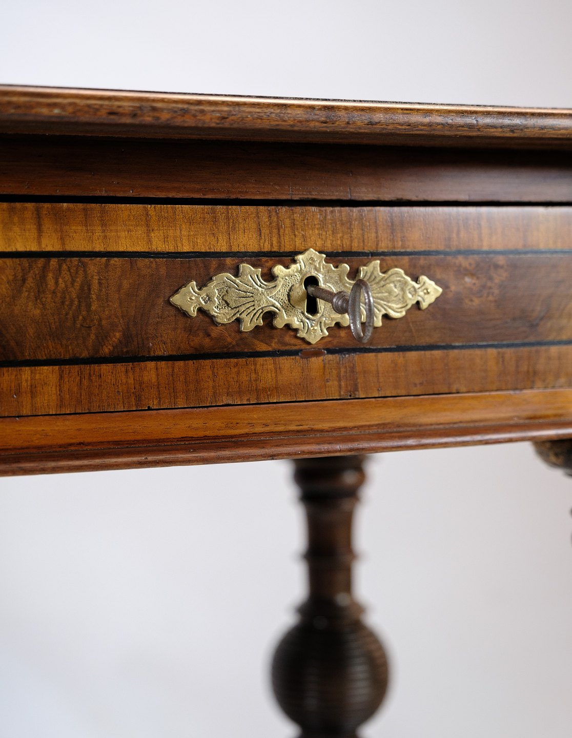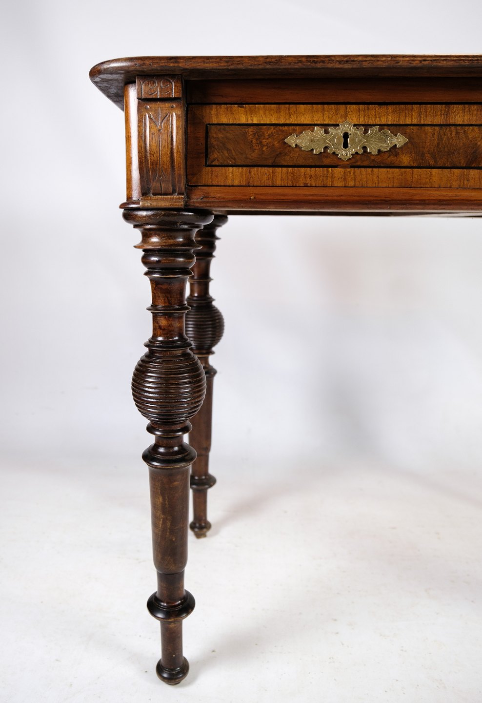 Skrivebordet er rig på detaljer, med delikate udskæringer og fine træmønstre, der fremhæver valnødtræets naturlige skønhed. De elegante ben og den forseglede overflade tilføjer både styrke og raffinement til møblet.