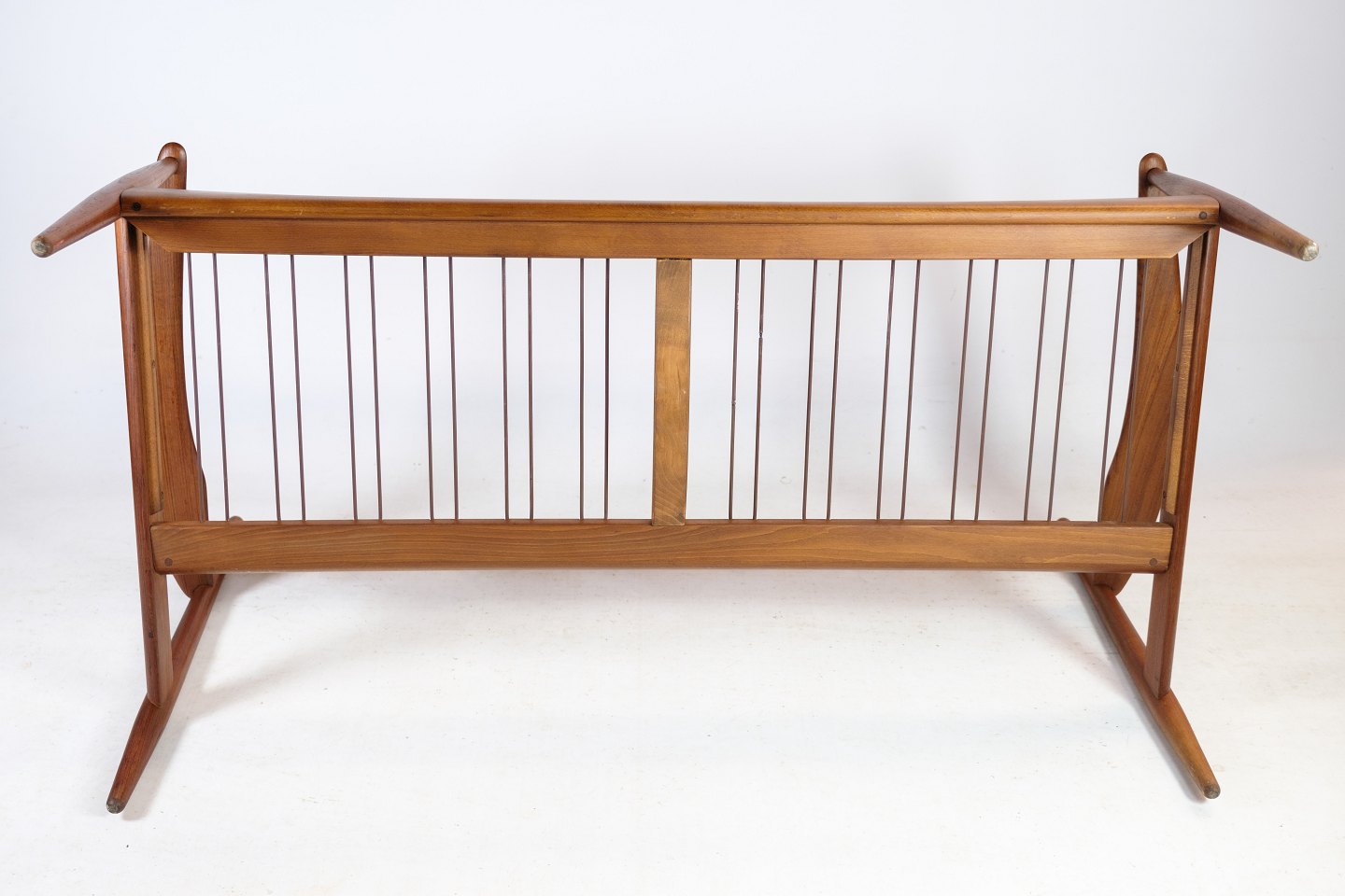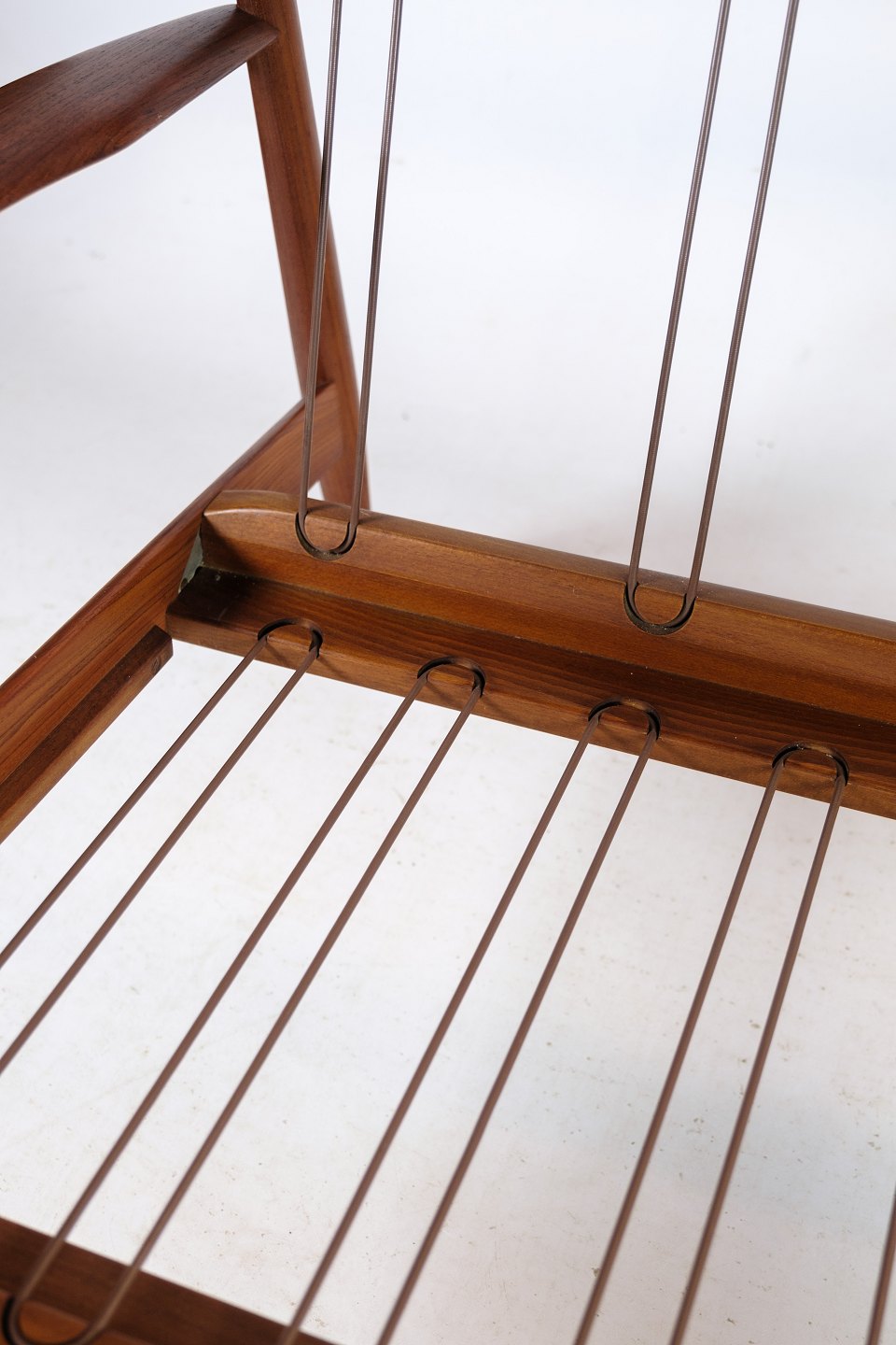 Denne 2-personers sofa fra omkring 1960'erne er en sjælden skønhed designet af Grete Jalk og fremstillet af France & Søn i Danmark. Den er udført i smukt teaktræ og har nybetrukkede hynder i elegant læder af den fineste kvalitet. Teakstellet på sofaen er blevet istandsat, så den står i fremragende stand og er klar til at pryde dit hjem.