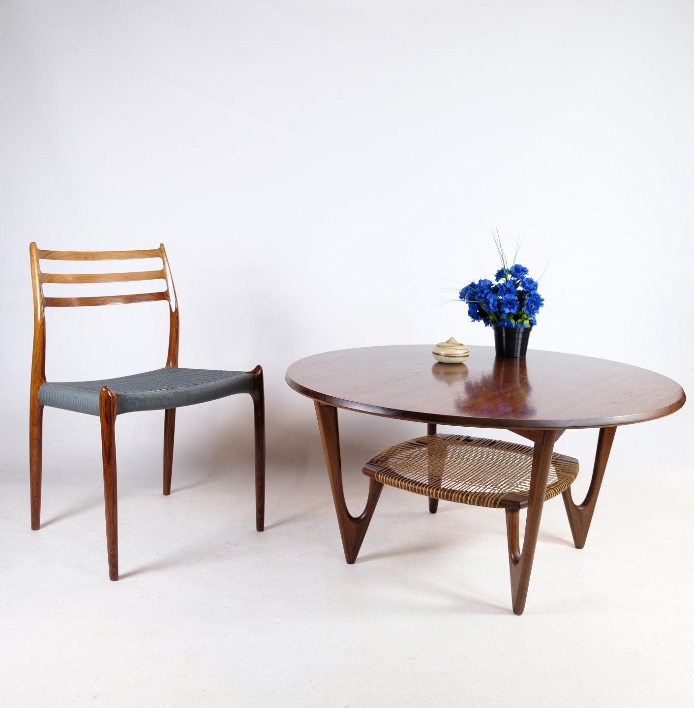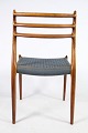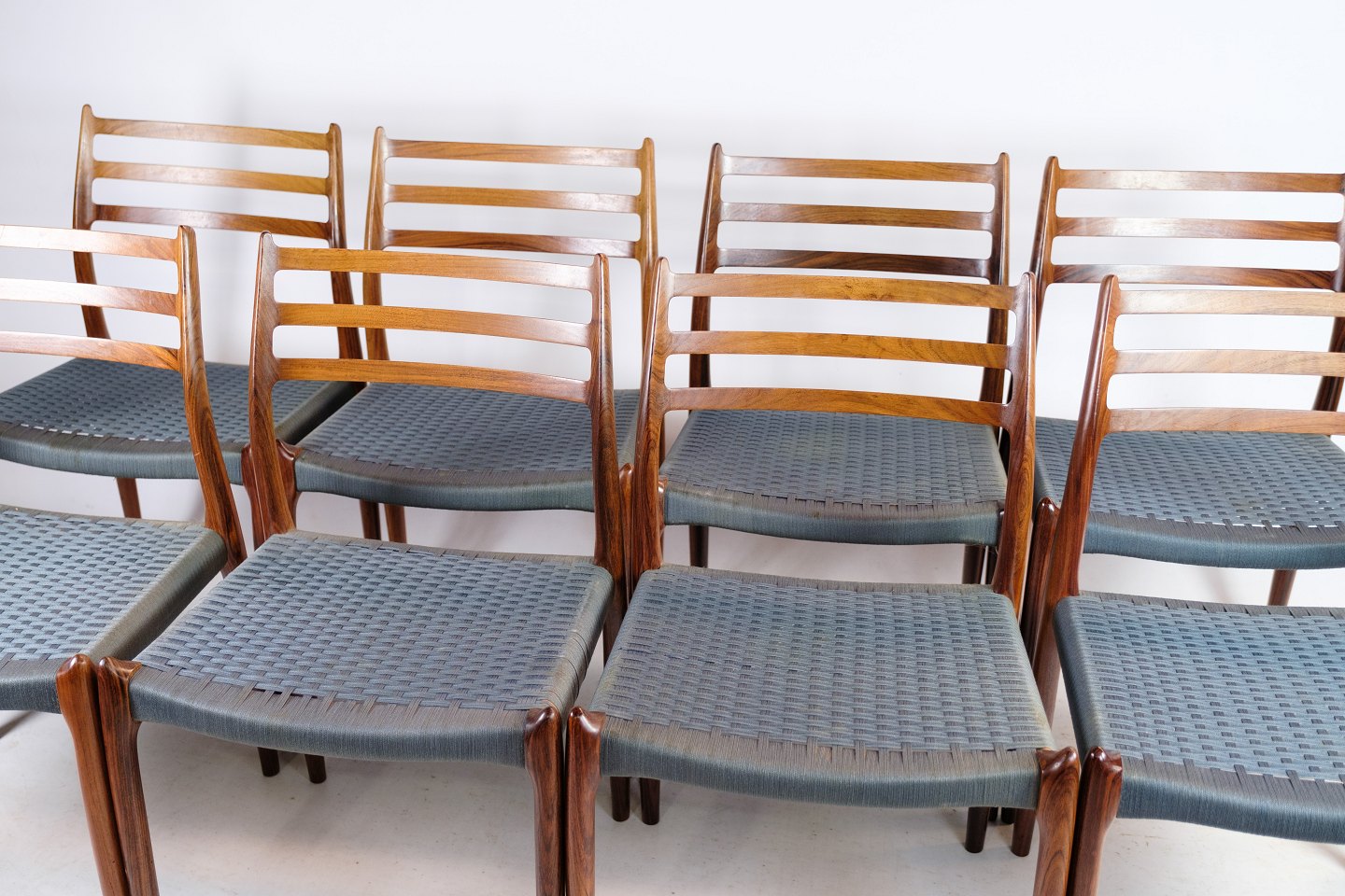 Sæt af 8 spisestuestole, model NO 78, designet af N.O Møller og fremstillet af J. L. Møller Møbelfabrik fra omkring 1960'erne. Stolene er i palisander med blåt flet. På vores eget værksted kan vi flette stolene eller betrækker med læder for en merpris. Skriv en mail til os og vi finder ud af det sammen. Info@osted-antik.dk