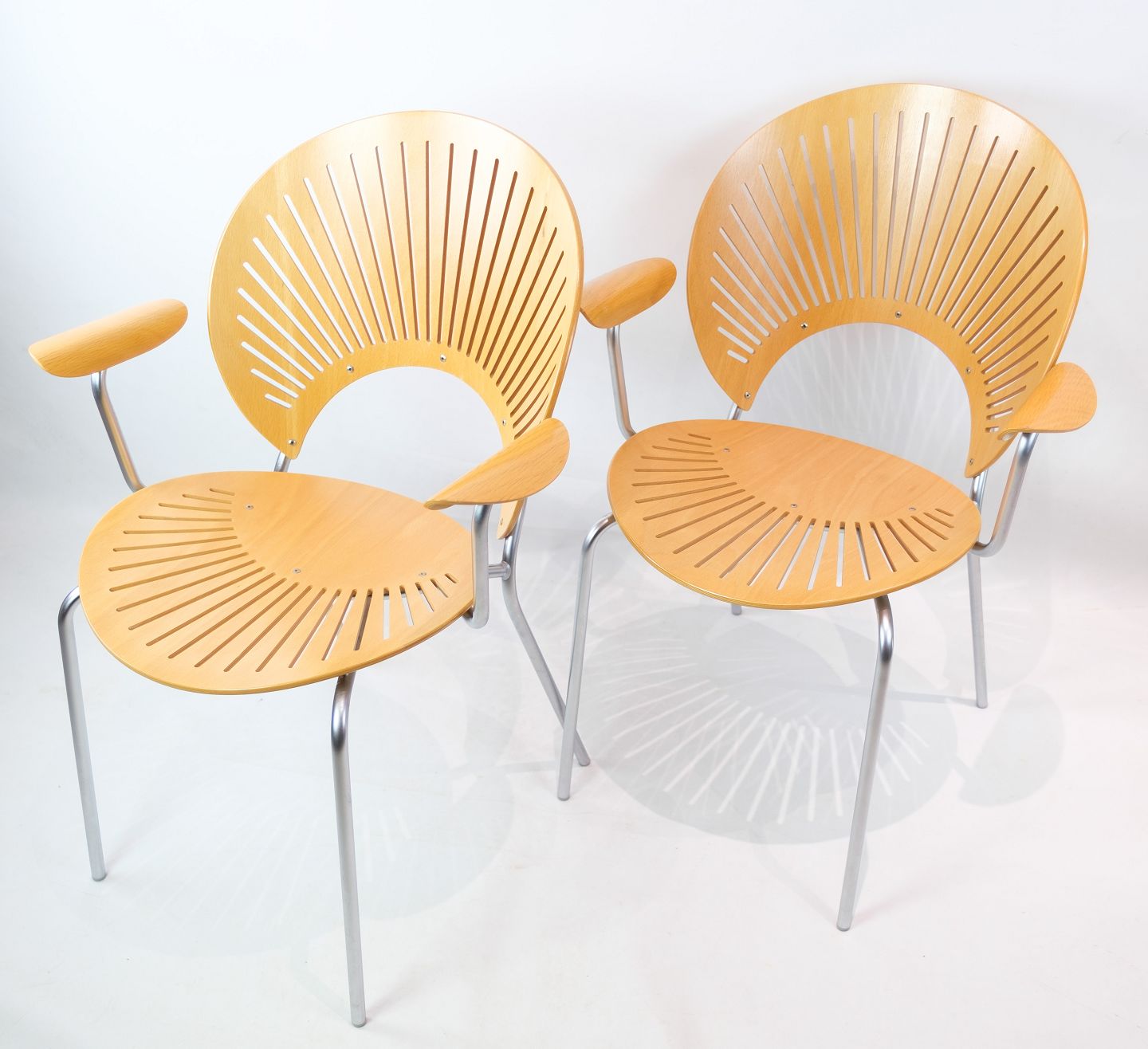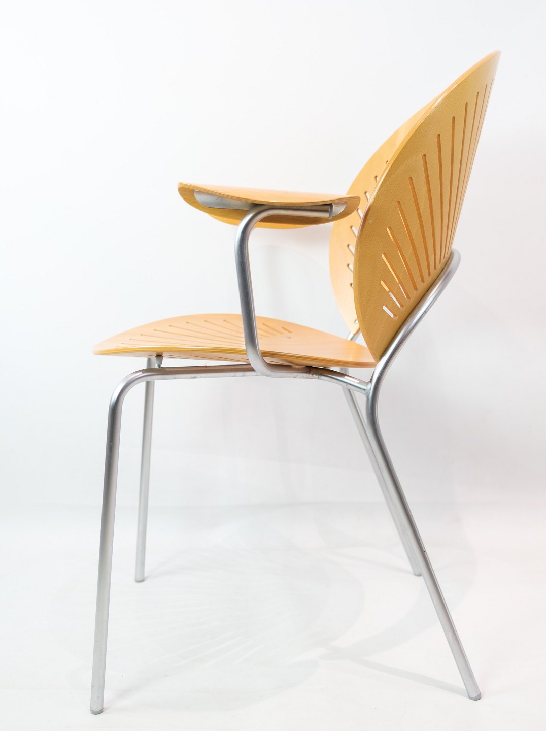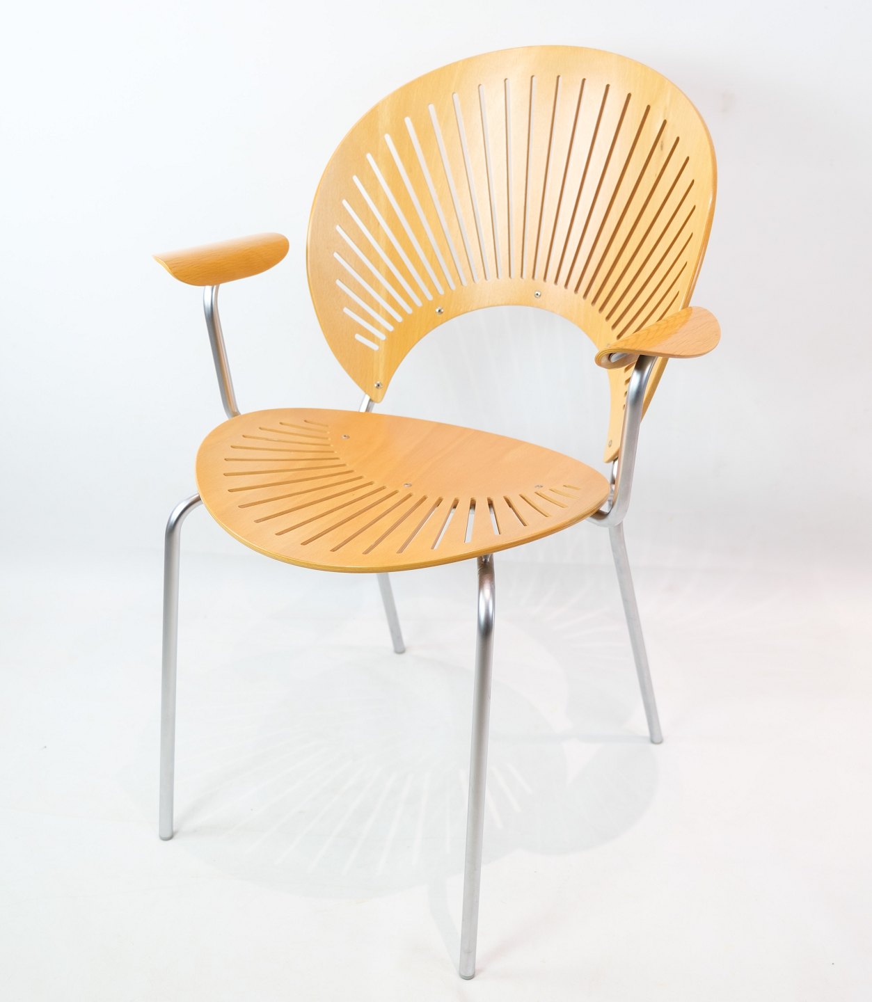 SolgtTrinidad Armstol, model 3297, designet af Nanna Ditzel (1923 - 2005) med skaller af bøgetræ med stel af forkromet stål fremstillet hos Fredercia Furniture.