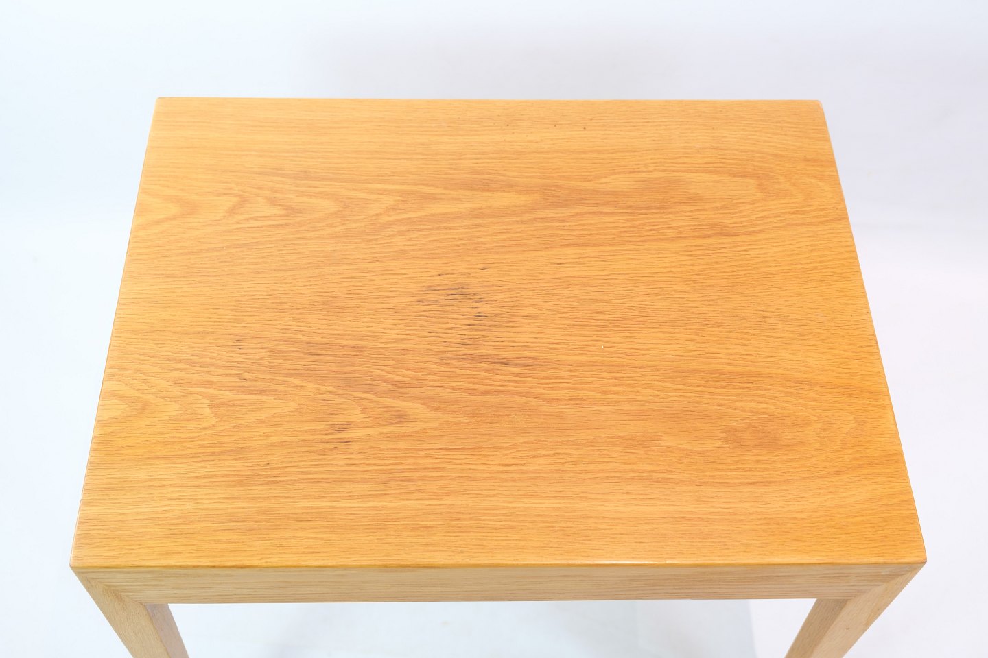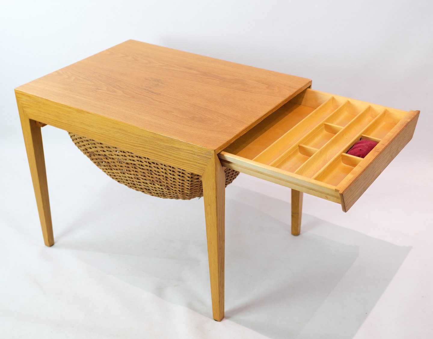 SolgtSybord / sidebord, designet af Severin Hansen i egetræ fremstillet af Haslev møbelfabrik fra 1957. Bordet har en skuffe med små rum, samt en udtrækskurv med flet.