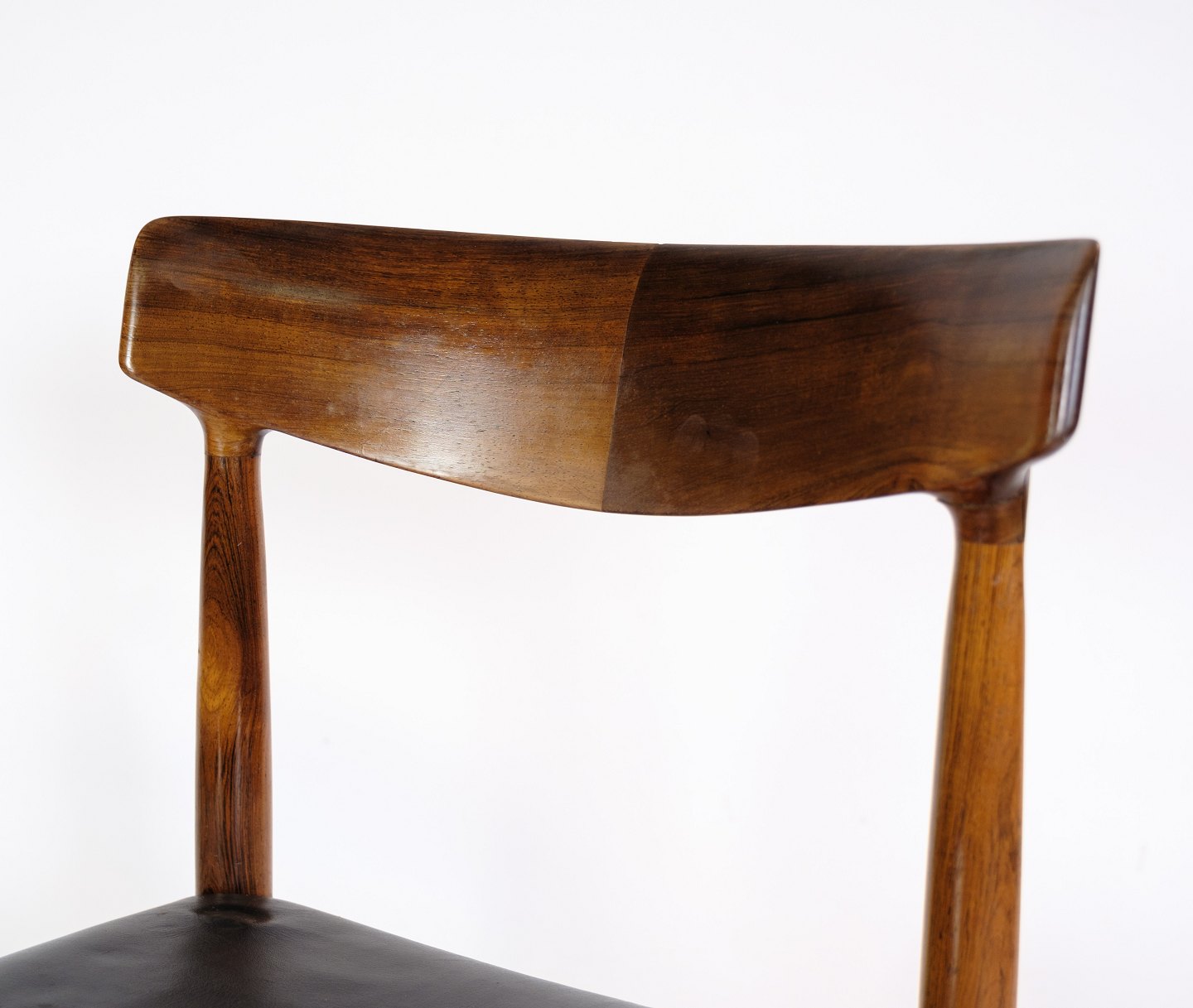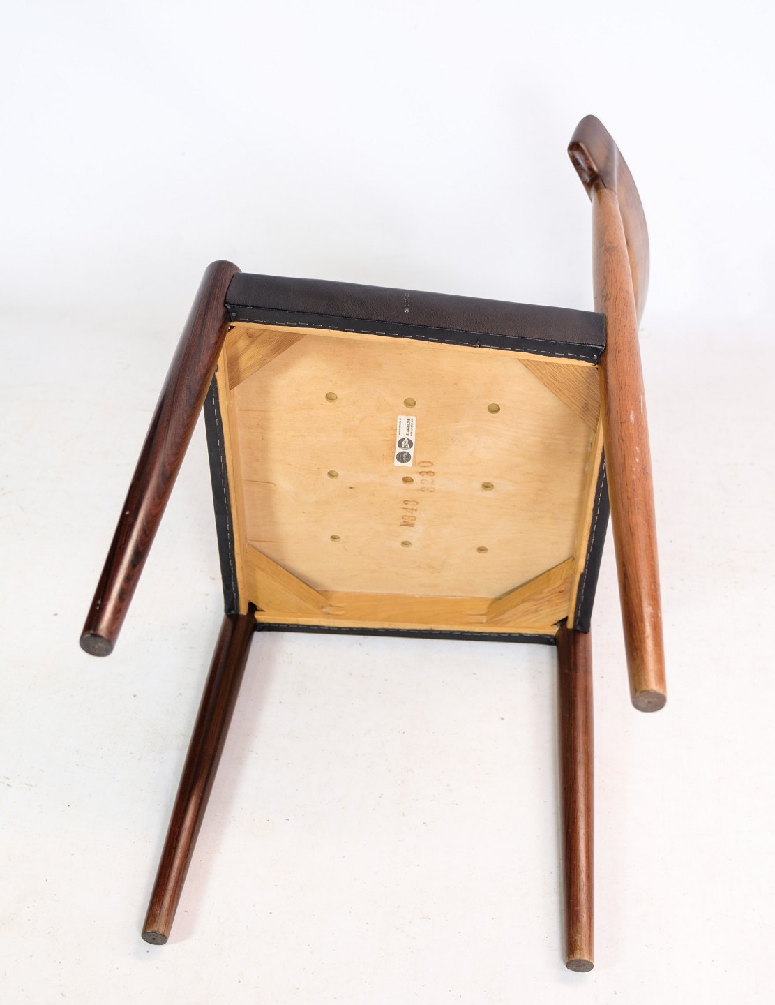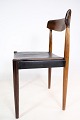 Sæt af 8 spisestuestole, model 343, designet af Knud Færch og produceret af Slagelse møbelfabrik fra omkring 1960'erne. Står med brugt sort læder. Vi har mulighed for ompolstre stolene i både læder og stof efter ønske.