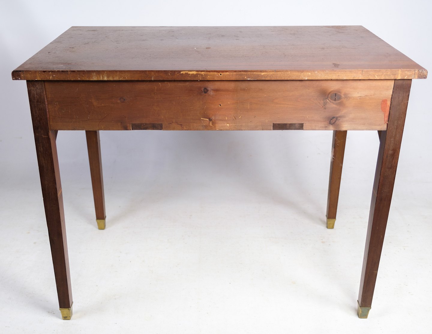 SolgtLille dame skrivebord i mahogni med udskæringer og dekoreret med messing nøglehuller, samt intarsia rundt på skuffen fra omkring 1920'erne.