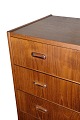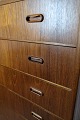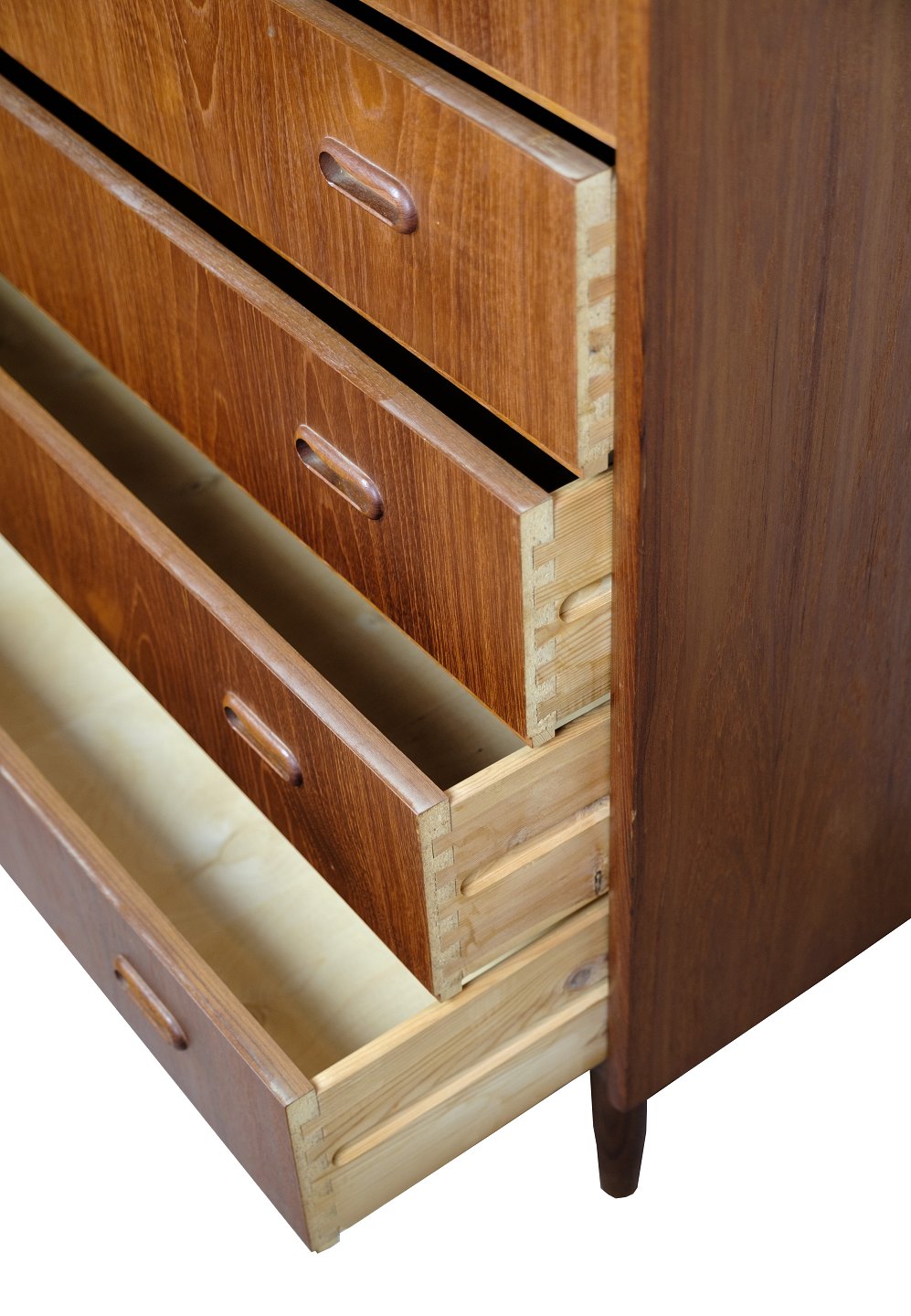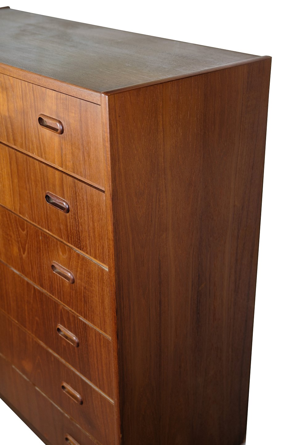 Denne teaktræskommode med seks skuffer er et eksempel på dansk design fra omkring 1960'erne. Fremstillet af teaktræ udstråler kommoden varme og naturlig skønhed, karakteristisk for denne æra. Med seks rummelige skuffer tilbyder den ikke kun praktisk opbevaringsplads, men også en æstetisk appel med sit enkle og funktionelle design.