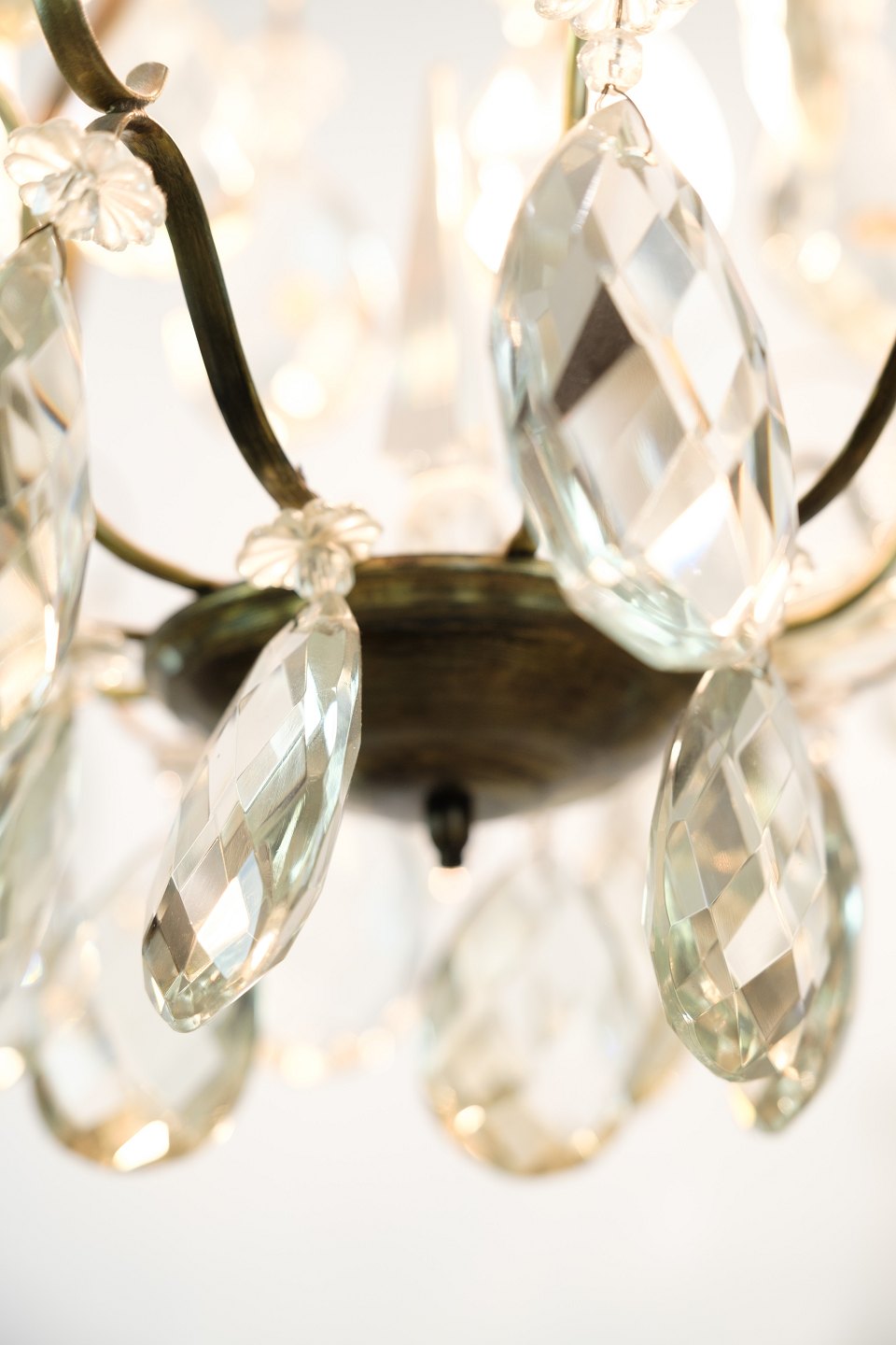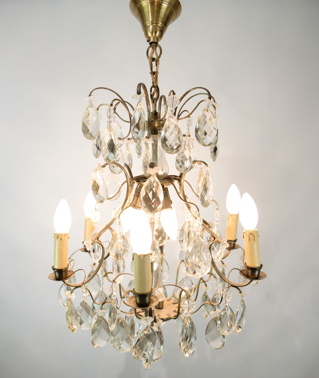 SolgtPrismekrone af messing og slebne prismer fra Frankrig omkring 1920erne. Til lampen medfølger en baldakin i messing.