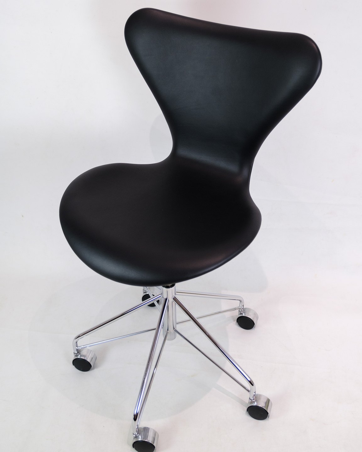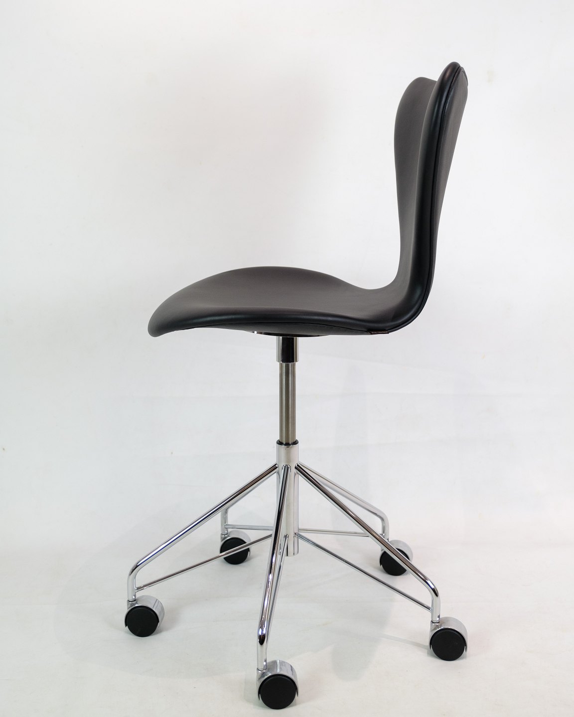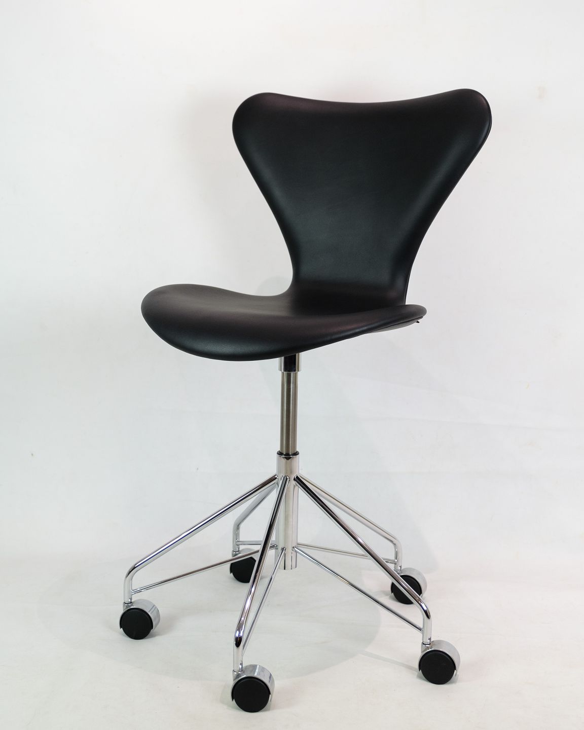 Serie 7™ 3117 drejestolen er fremstillet af det verdensberømte danske møbelfirma Fritz Hansen. Stolen er lavet af sort læder og har et elegant design med ben i forkromet stål. Den er fuldpolstret for ekstra komfort, så du kan sidde behageligt i den i længere tid. Designet er lavet af den kendte danske arkitekt og designer Arne Jacobsen, så du kan være sikker på, at stolen er både smuk og funktionel. Det er en perfekt stol til ethvert kontor, stue eller spisestue, og vil helt sikkert tilføje en touch af elegance til dit hjem eller kontor.