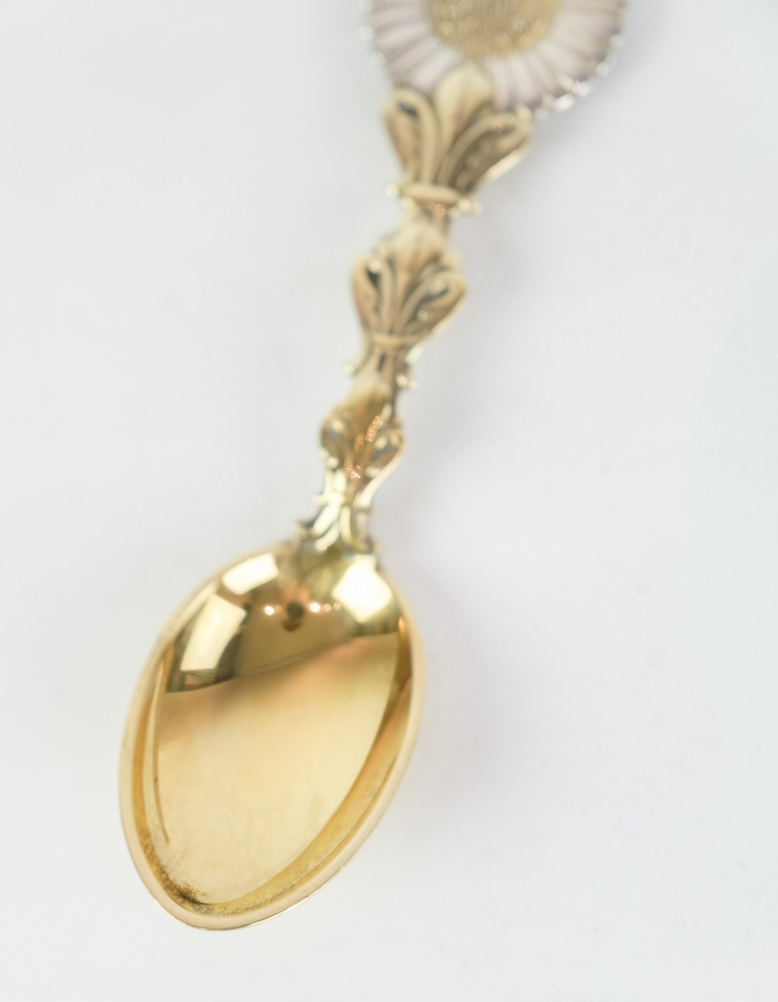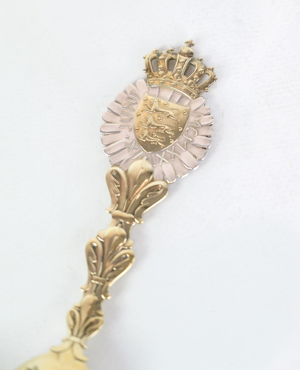 Jubilæumsske / mindeske forgyldt sterlingsølv af Anton Michelsen i anledning af Prinsesse Margrethes og Rene af Bourbon-Parmas bryllup d. 9 Juni 1921.