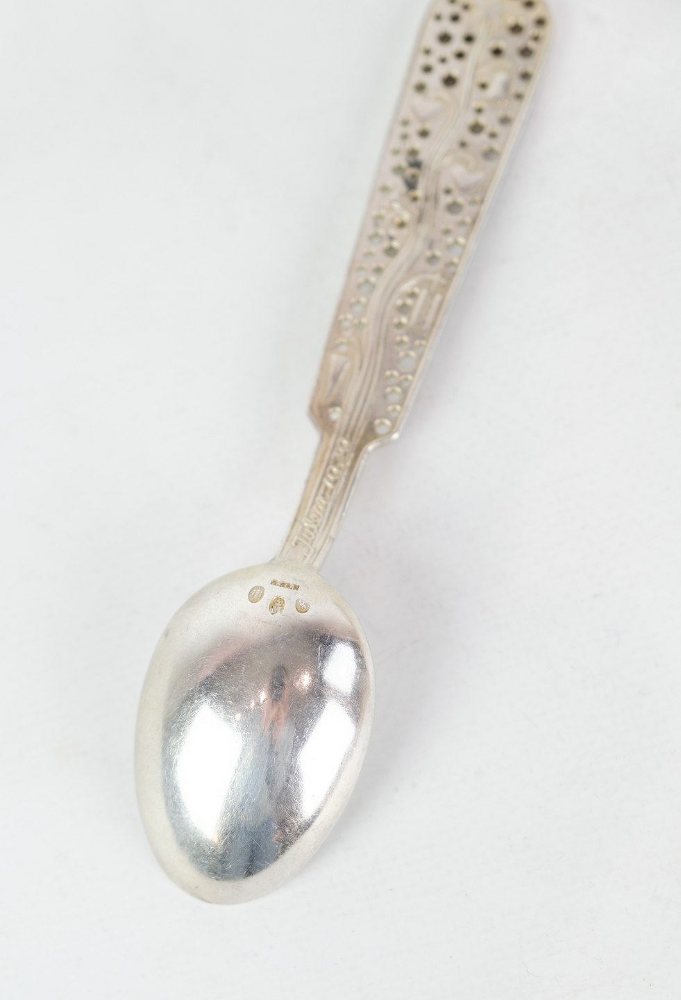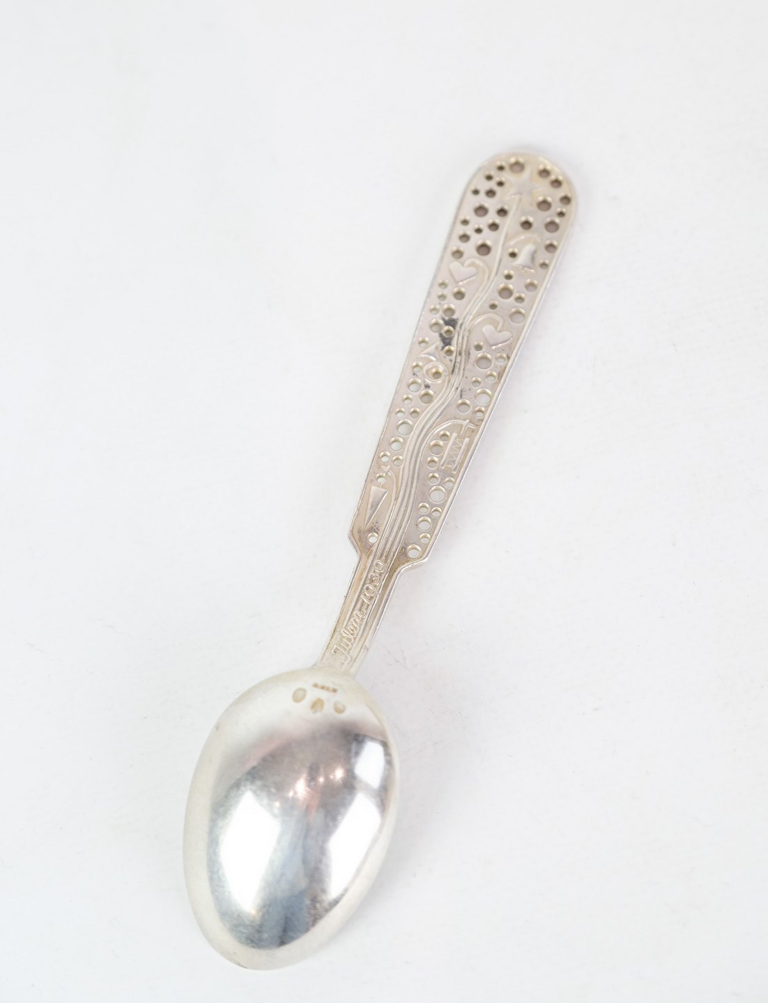 Jubilæumsske i tretårnet sølv med flot dekoreret mønster. I fin brugt stand