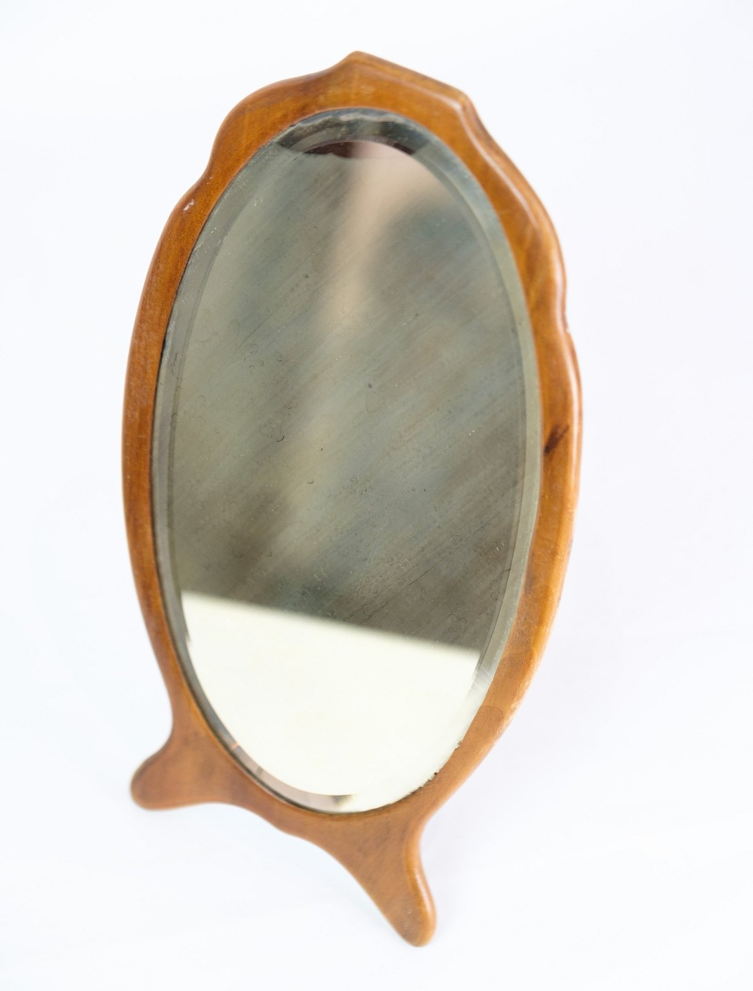 Lille bordspejl i nøddetræ med lille metal fod fra omkring 1880'erne.