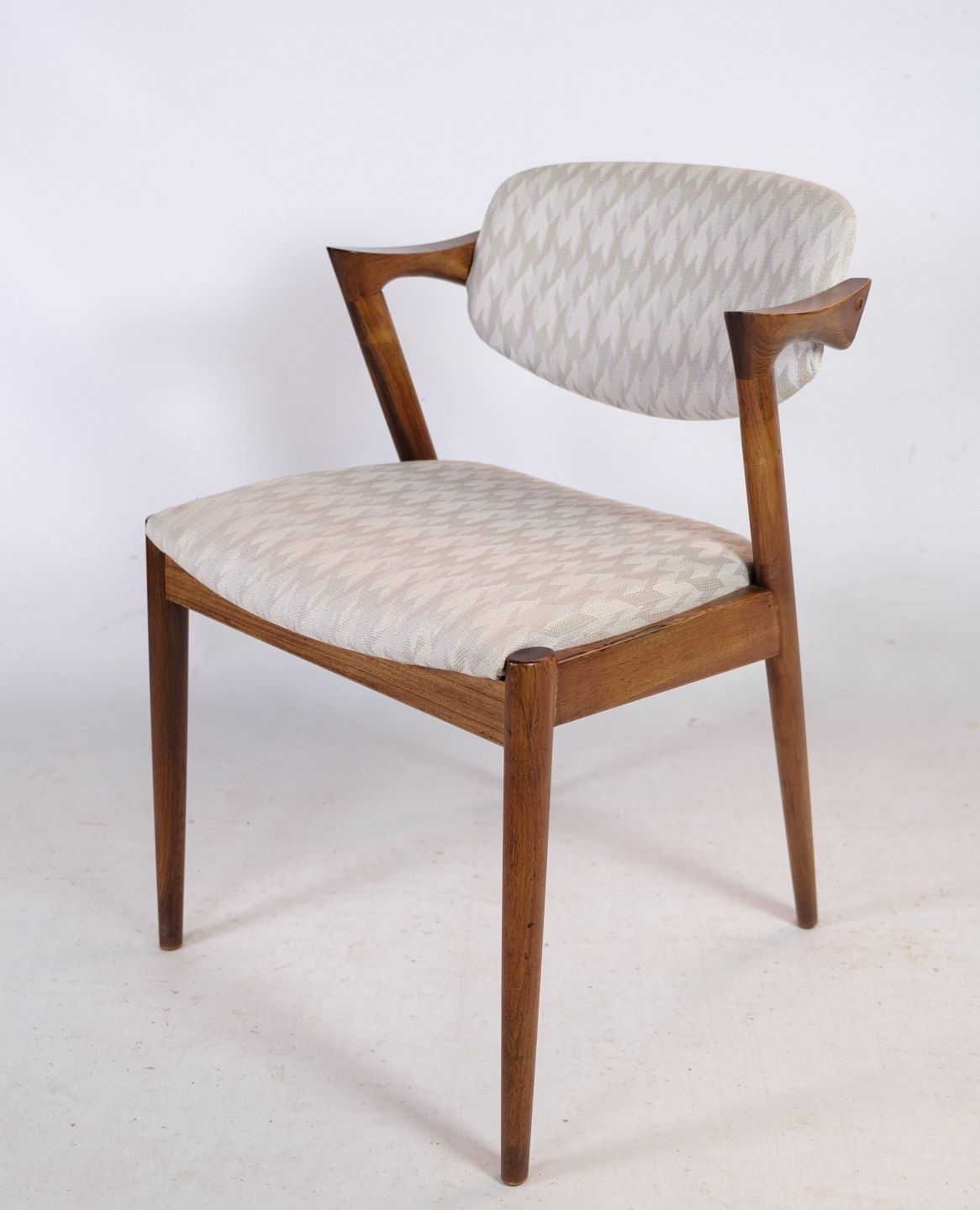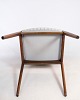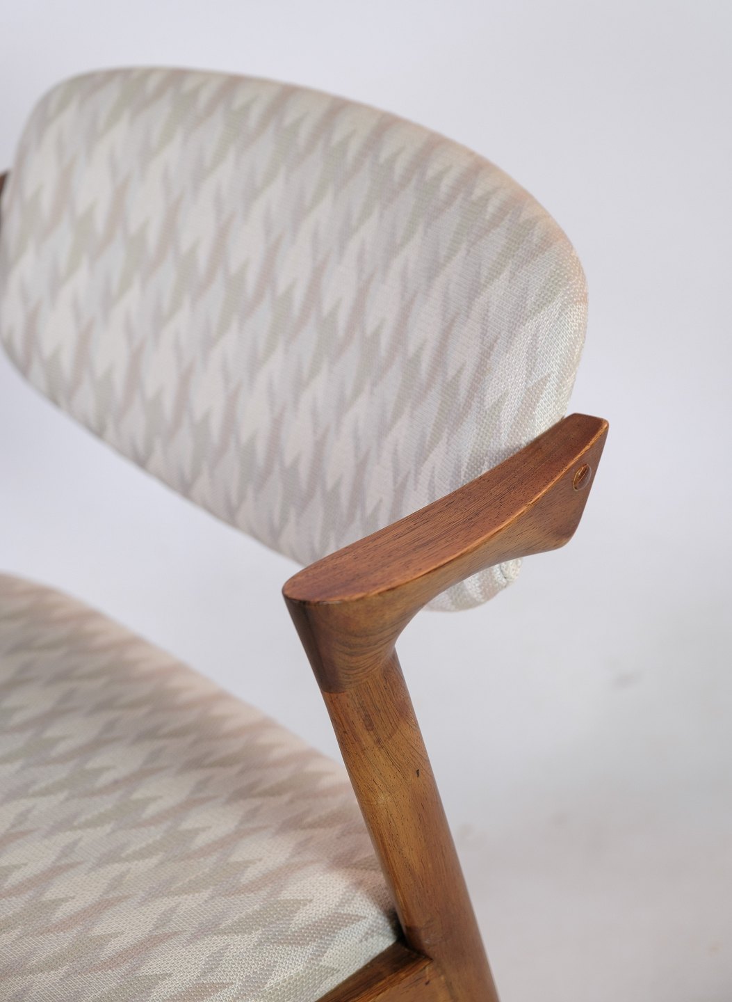 Stolens polstring er udført i et lyst mønstret stof, der giver en blød og behagelig overflade at sidde på. Polstringen er fastgjort til sædet og ryglænet ved hjælp af diskrete, sorte nitter, der giver en stilfuld kontrast til det lyse stof.