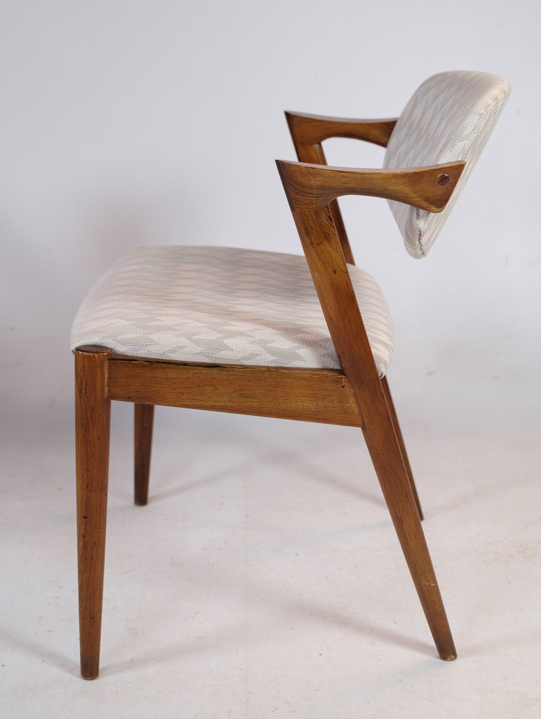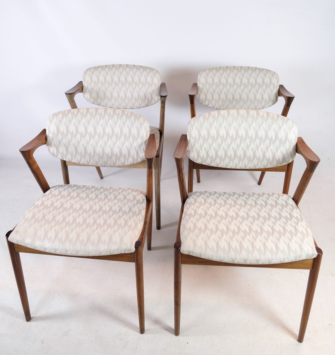 Dette sæt af 4 spisestuestole er en fremragende repræsentation af den tidløse og elegante stil, der kendetegner dansk møbeldesign fra midten af det 20. århundrede. Stolene er model 42, designet af den anerkendte danske designer Kai Kristiansen og fremstillet hos Schou Andersen i 1960'erne.