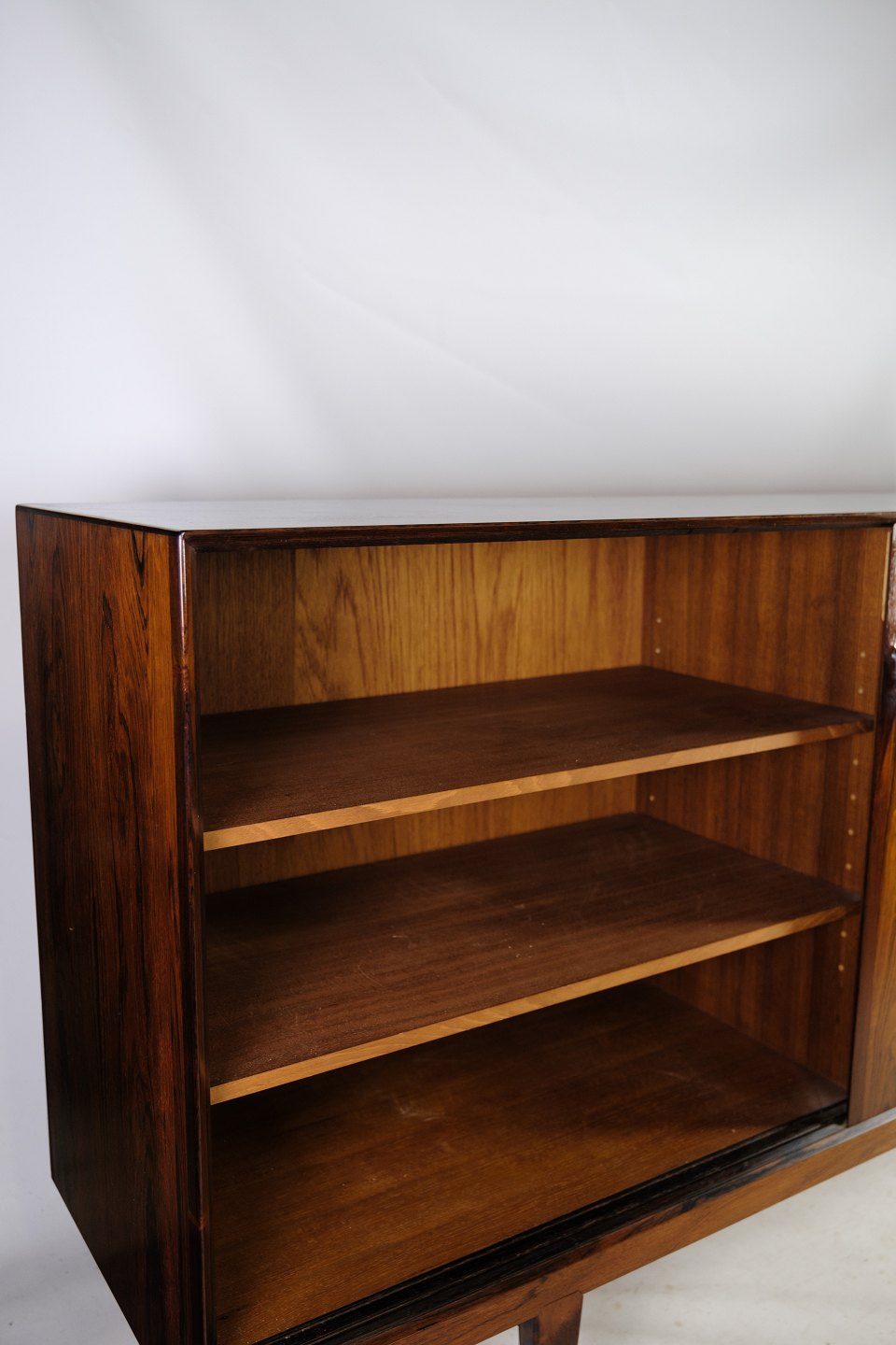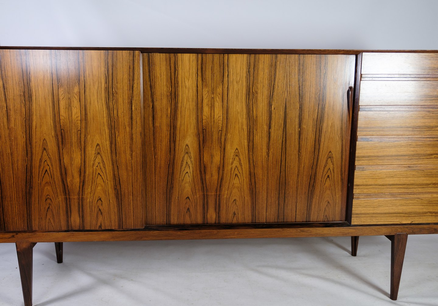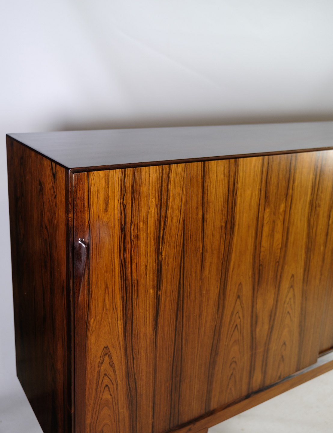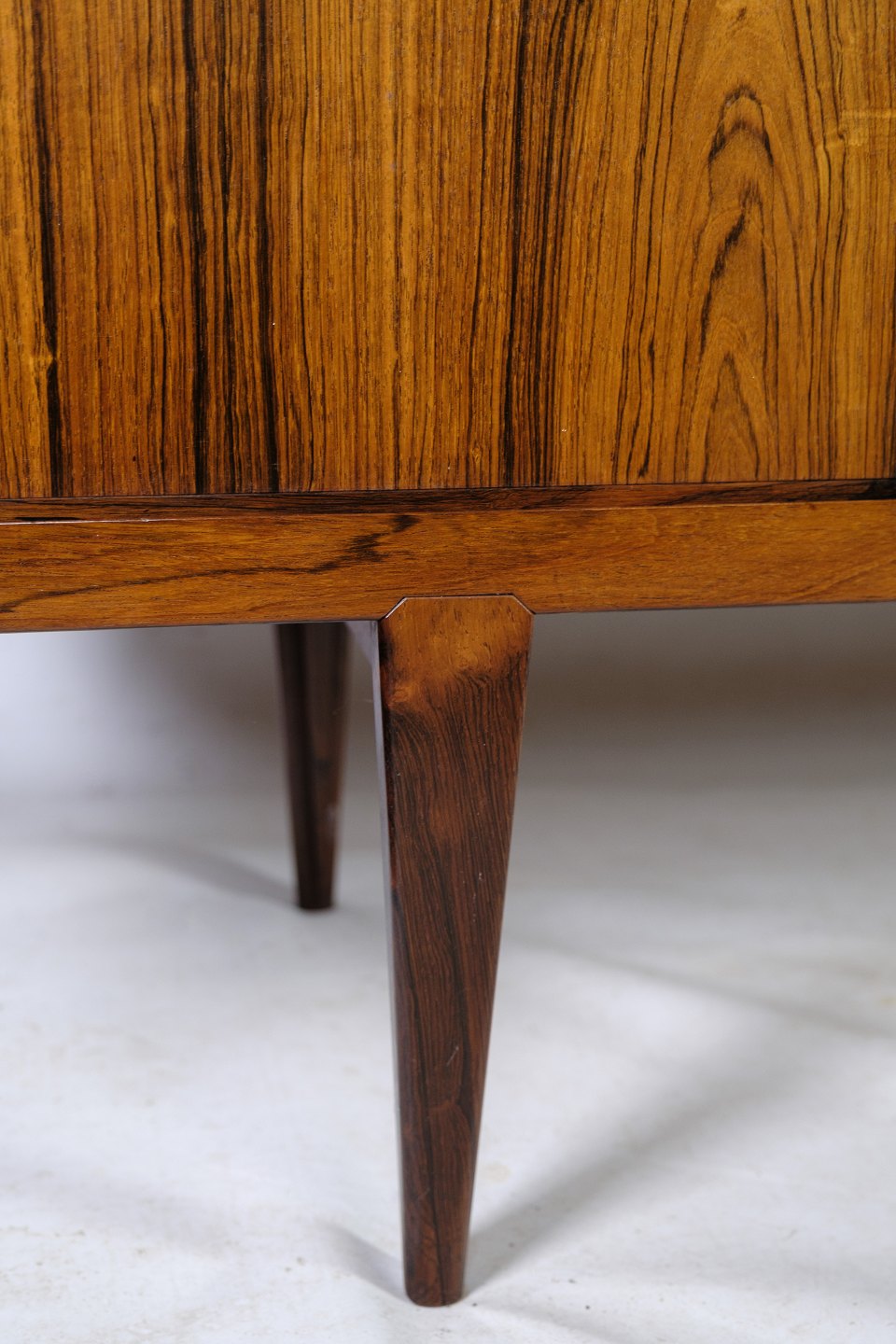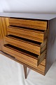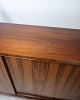 Skænken i palisander, designet af Henry Rosengren Hansen og produceret af Brande Møbelindustri i 1960, er et pragteksempel på dansk møbelkunst fra midten af det 20. århundrede. Denne skænk udstråler en tidløs elegance med sit smukke palisandertræ, der giver en varm og luksuriøs atmosfære til ethvert rum.