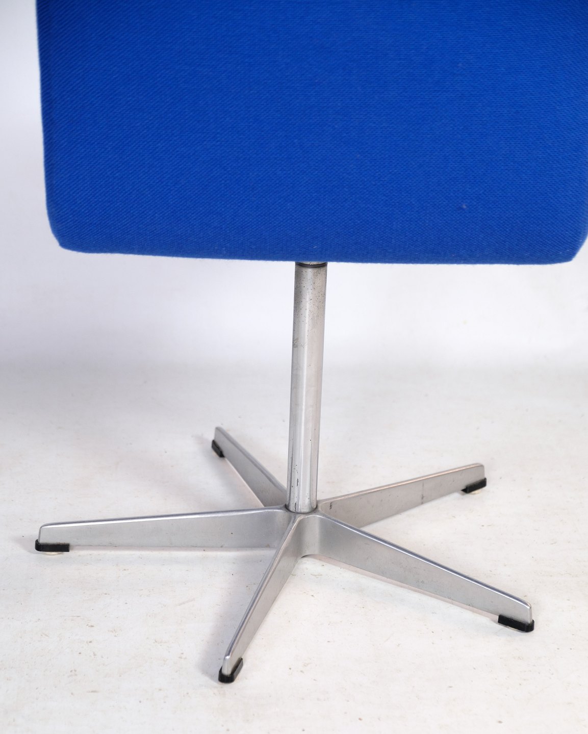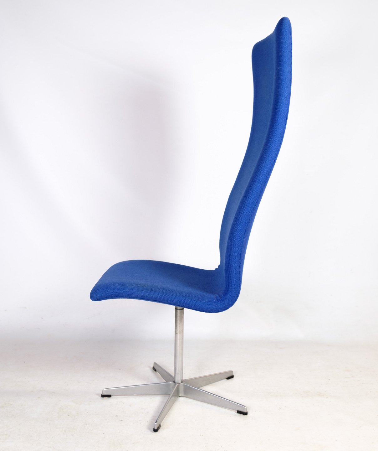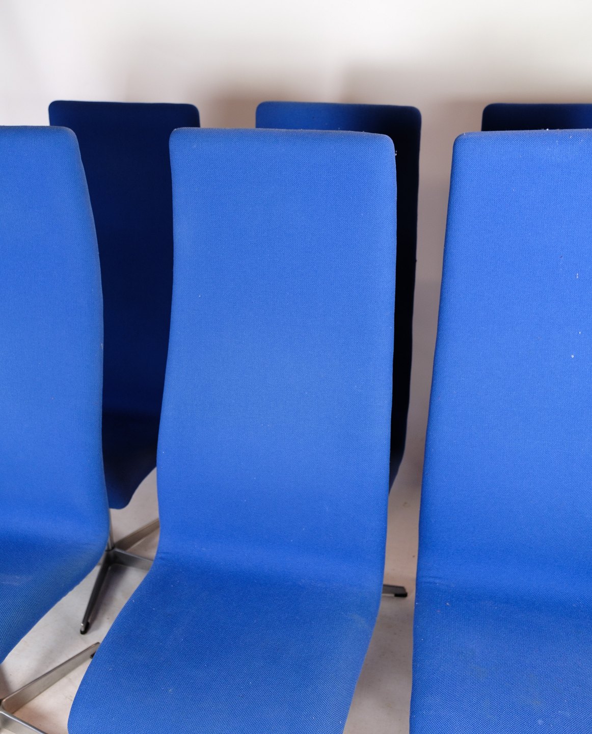 SolgtSæt af 6 oxford stole, designet af Arne Jacobsen og produceret hos Fritz Hansen. En eksklusiv udgave med en høj ryg og 5 benet metal fod. Stolene er polstret i flot blåt stof og vil blive grundigt renset på vores værksted inden levering. Stoffet står pænt med normalt brugsspor.