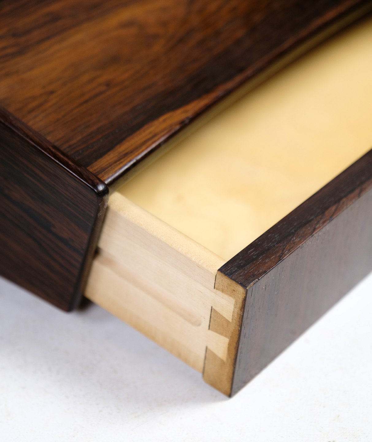 SolgtEt sæt væghængte natborde i palisander med skuffer fremstår med stempler af Ølholm Møbelfabrik, Horsens fra omkring 1960'erne.