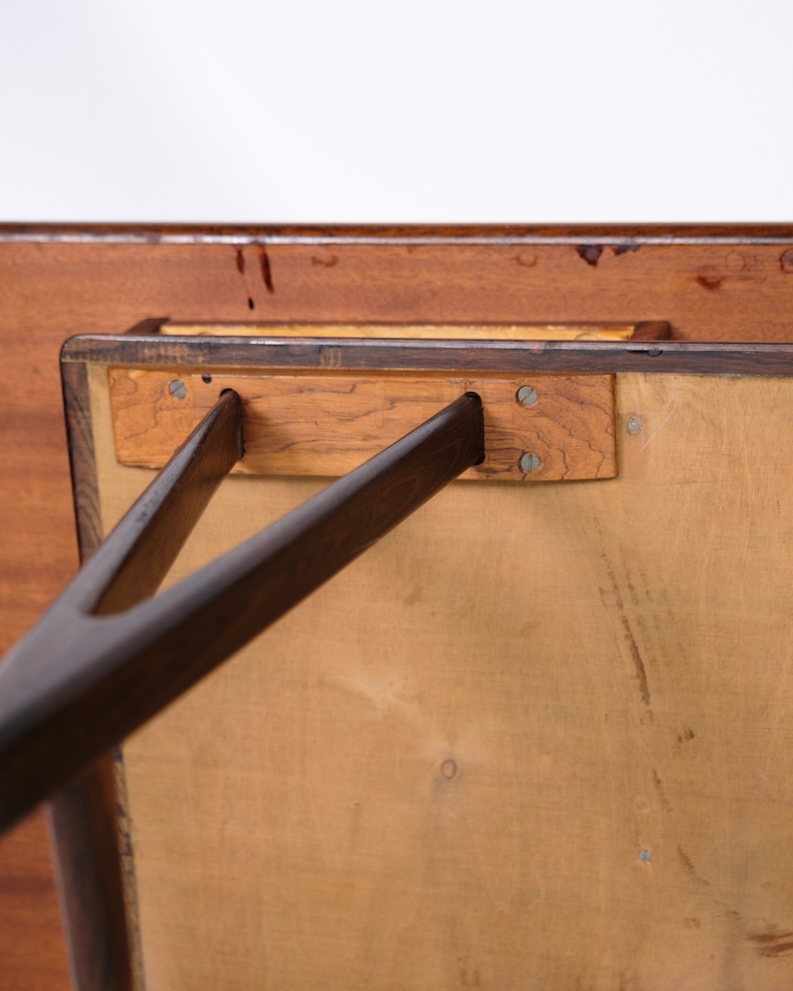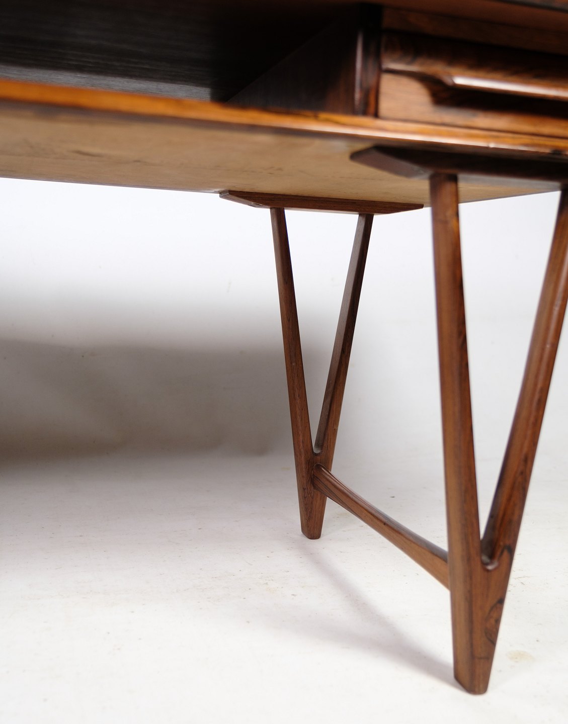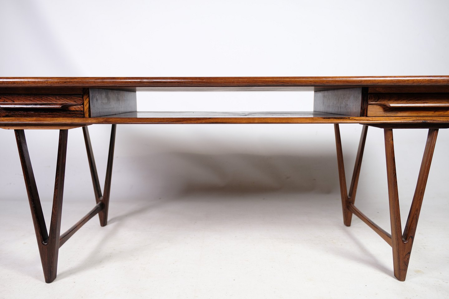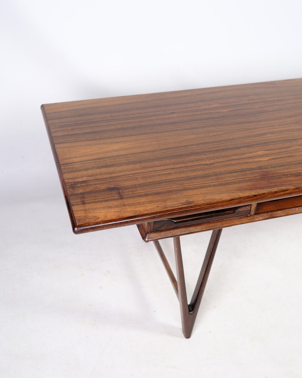 SolgtSofabord, Model 32, designet af E. W. Bach. i fineret og massiv palisander, plade hvorunder avishylde samt to skuffer, monteret på V-formede ben fremstillet hos Møbelfabrikken Toften fra omkring 1960'erne.