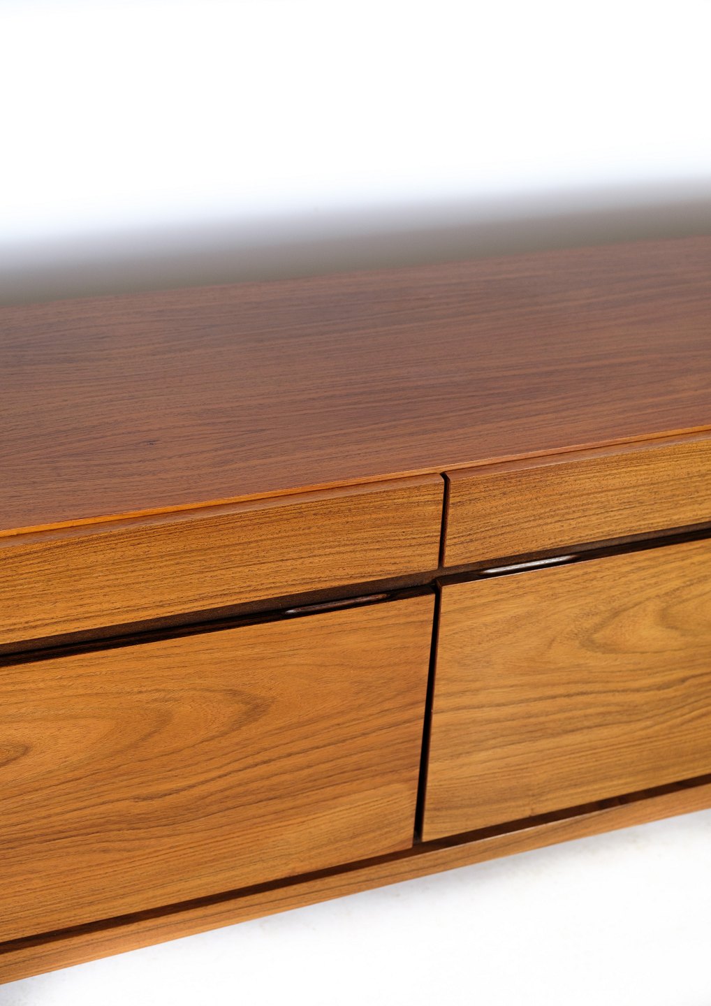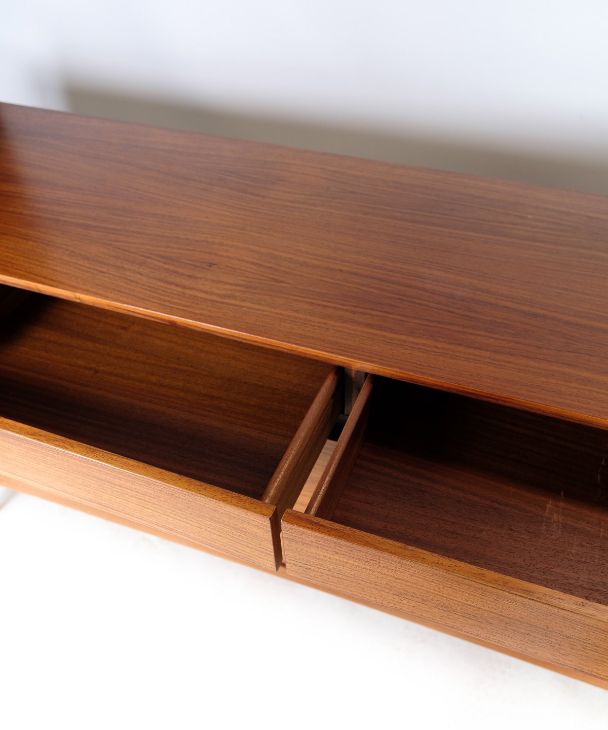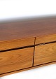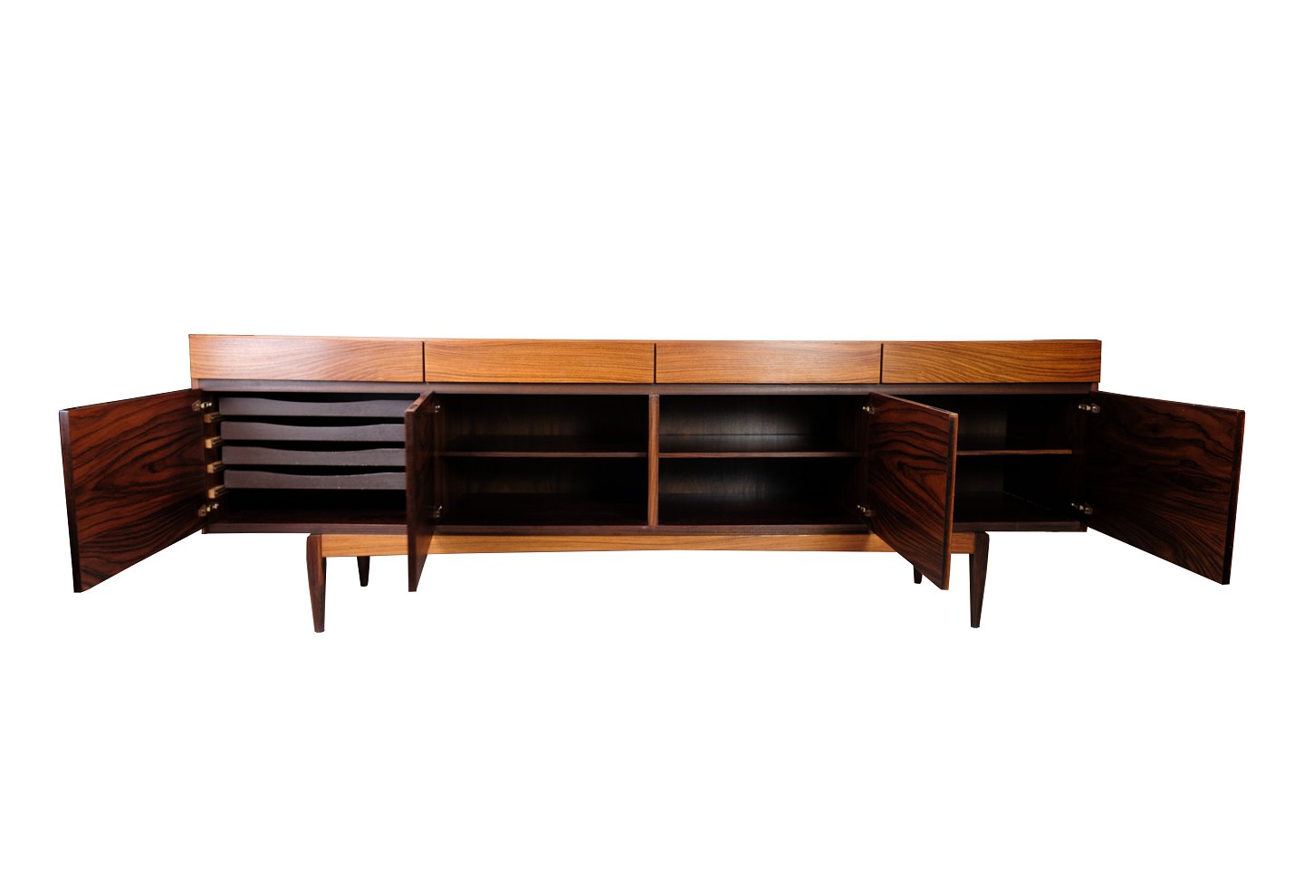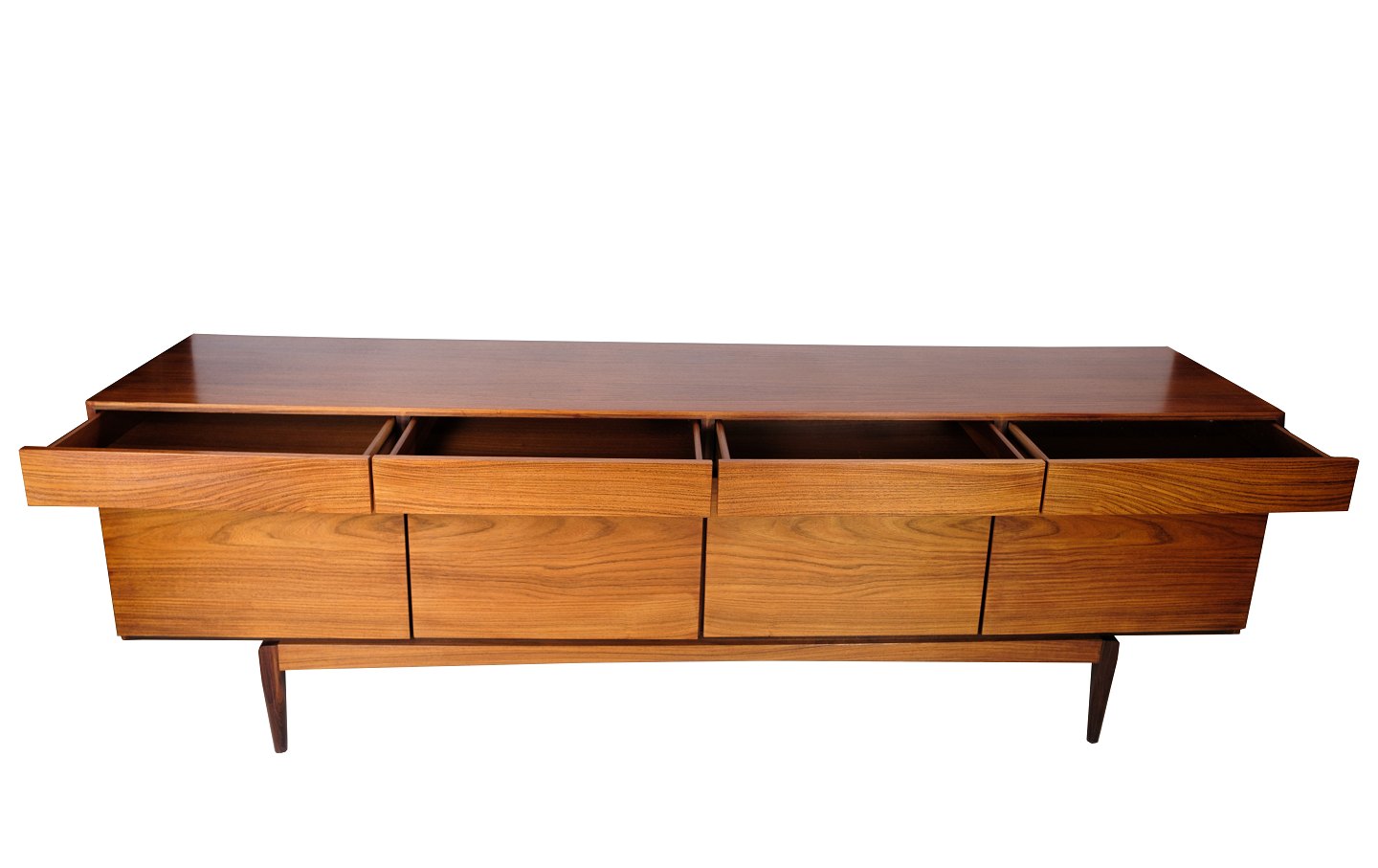 SolgtSkænk i palisander designet af Ib Kofod-Larsen, model FA66 fremstillet hos Faarup Møbelfabrik i 1960'erne. En lav fritstående skænk af den højeste kvalitet. Den er fineret med palisander med en meget smuk struktur. I fronten har den fire skuffer, samt fire låger, hvor der er både hylder og udtræksbakker.