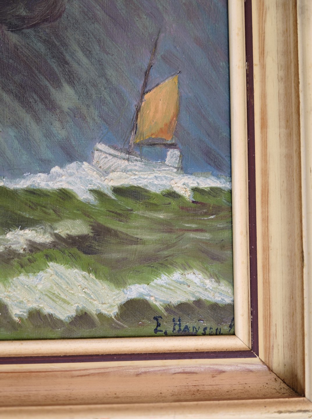 Maleri på lærredet i guldramme med marine motiv i røde og blå farver, signeret E. Hansen fra omkring 1930'erne