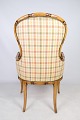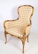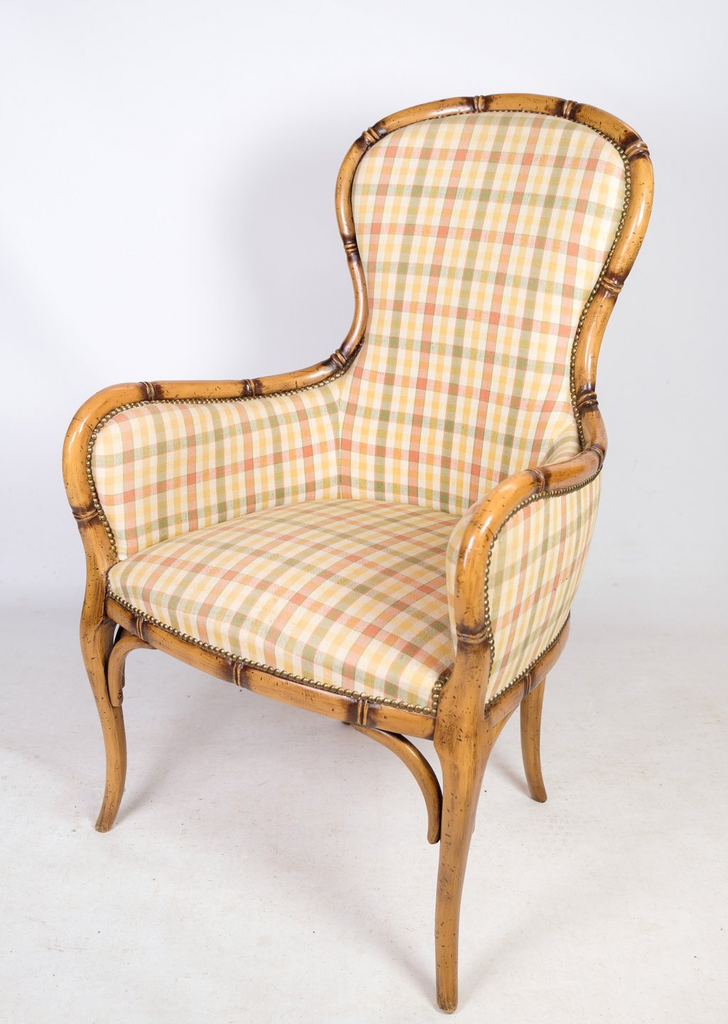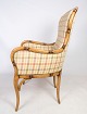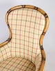Et par af to lænestole i ternet stof med stel af træ fra omkring 1920'erne.