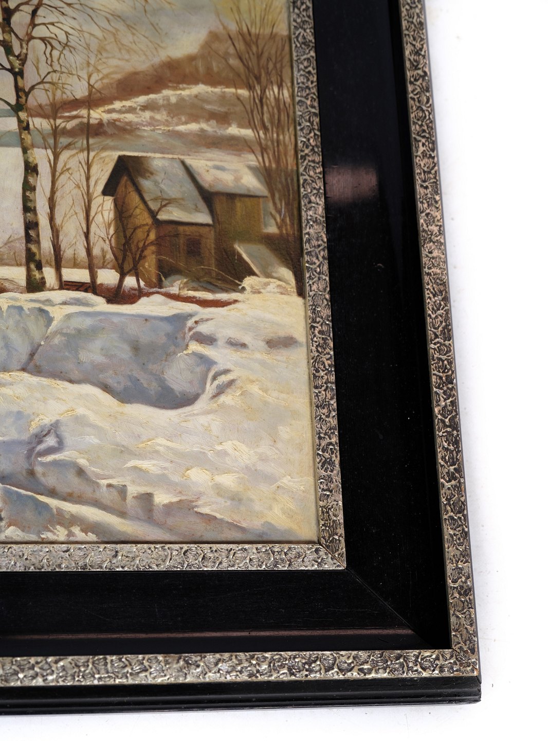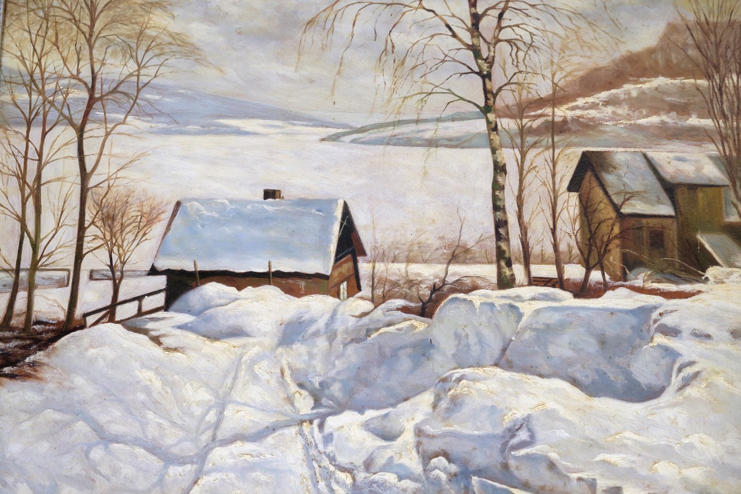 Maleri på træpladen i antik ramme af små huse og landskab med sne fra omkring 1930'erne