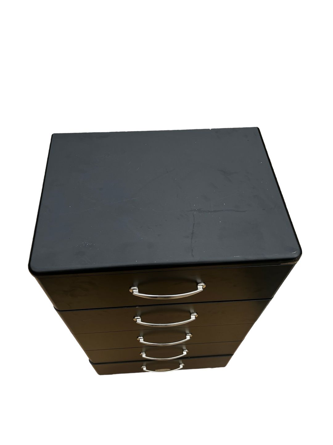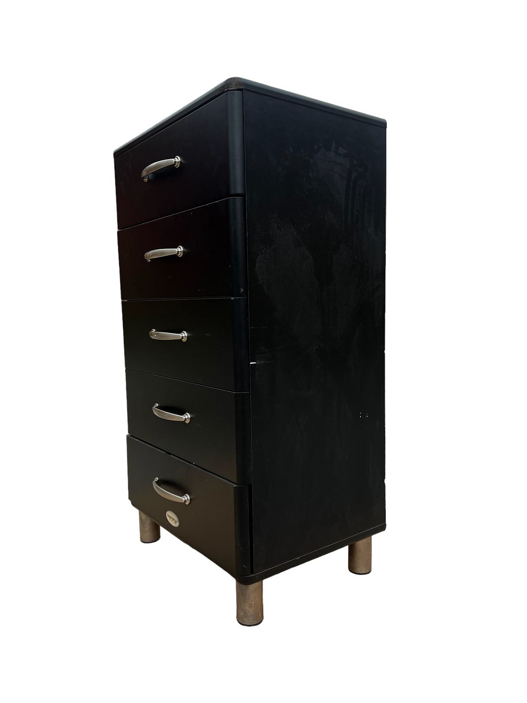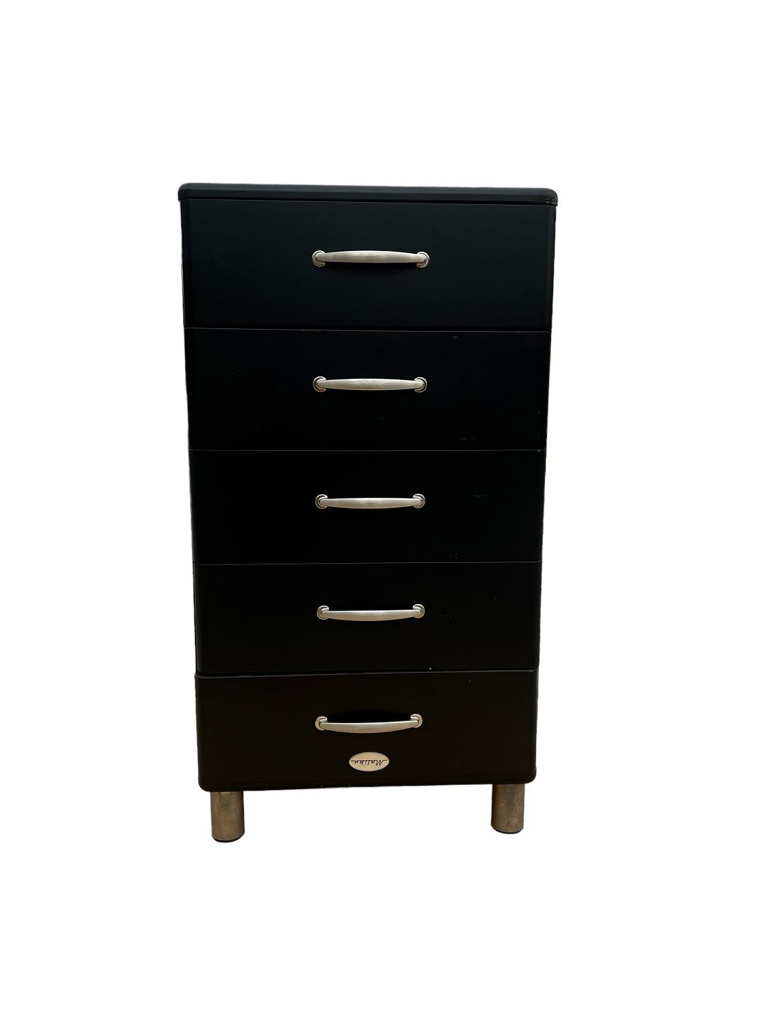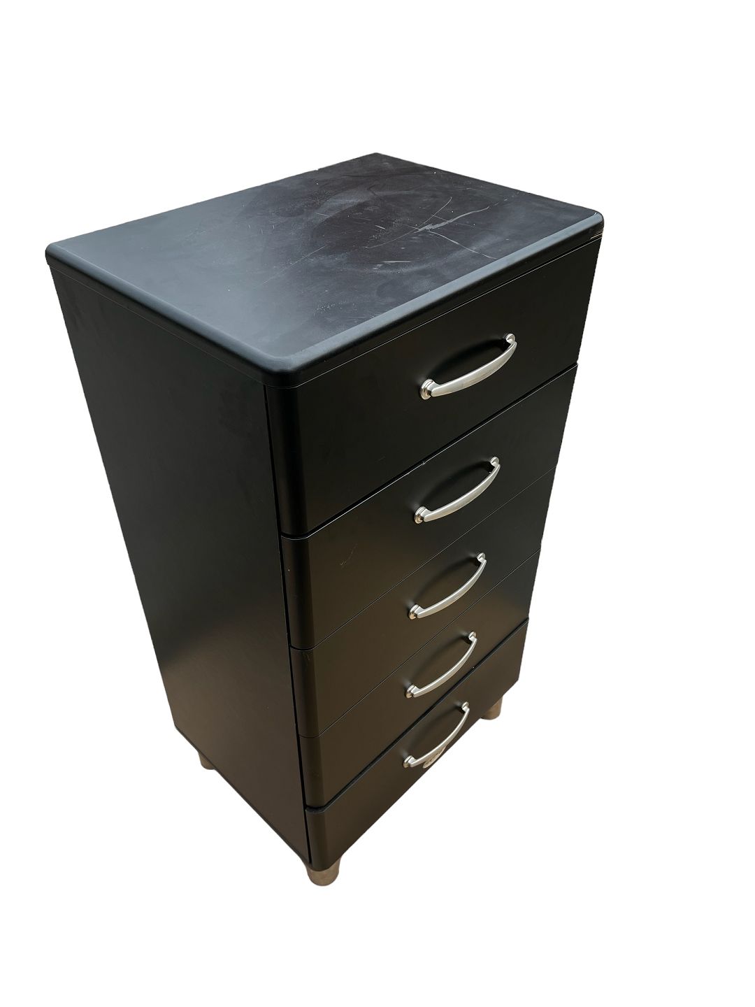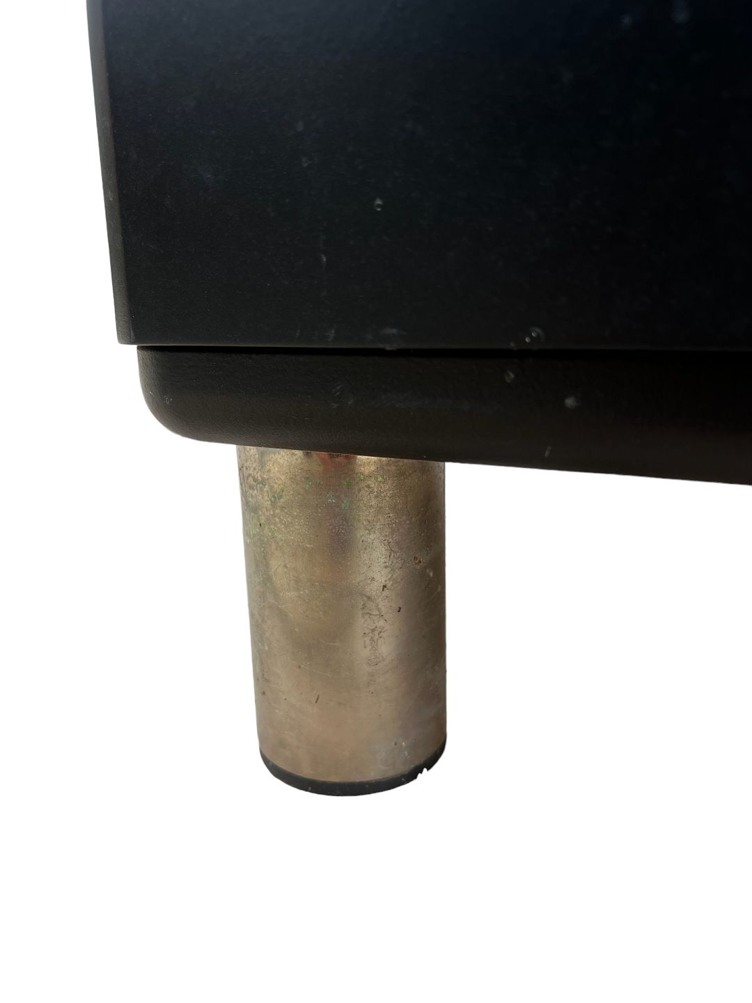 Denne sort metal kommode fra omkring 1980'erne udstråler en moderne æstetik med sit enkle og strømlinede design. Med metalhåndtag og ben tilføjer den et subtilt industriel præg til rummet.