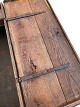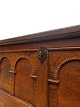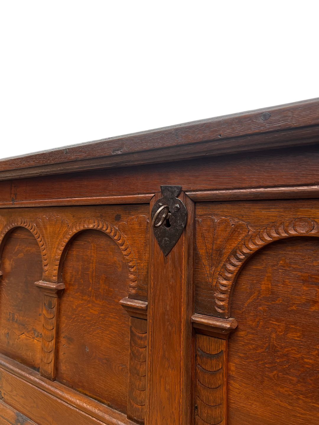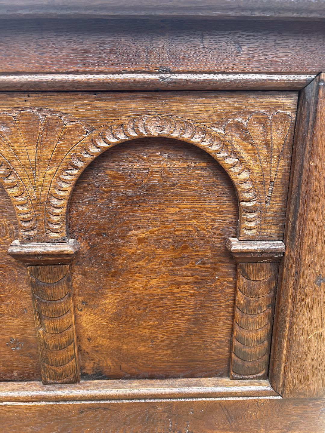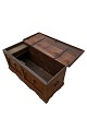 Kiste i egetræ med et fladt låg, samt 3 buede fronter og udskæringer fra år 1760'erne.