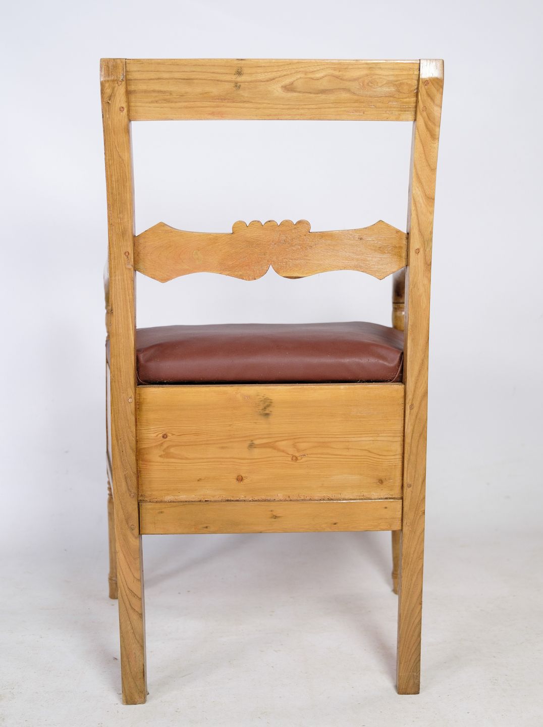 Bonde stol / armstol i fyrretræ med brunt læder fra omkring år 1840'erne. Står i flot istandsat.