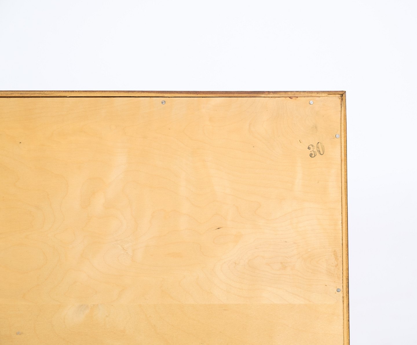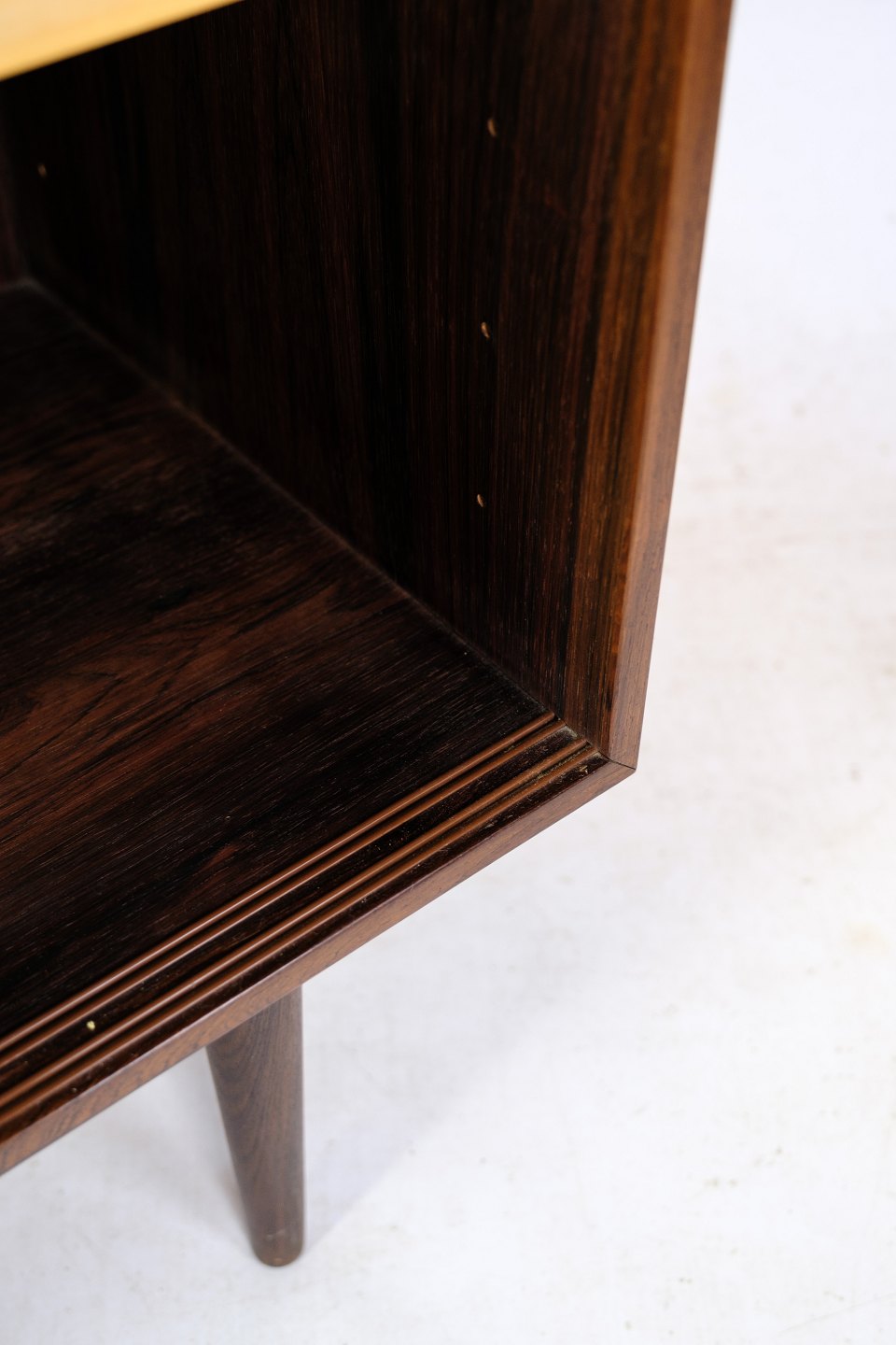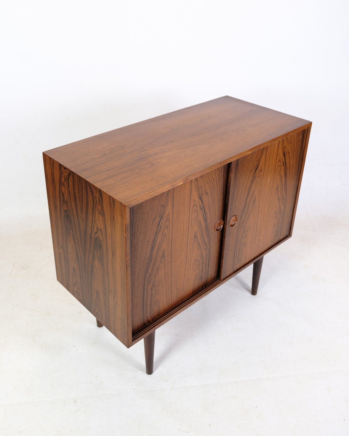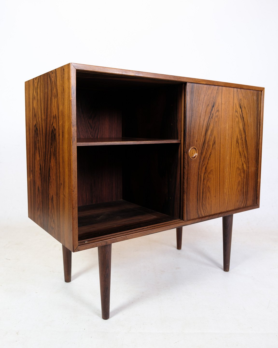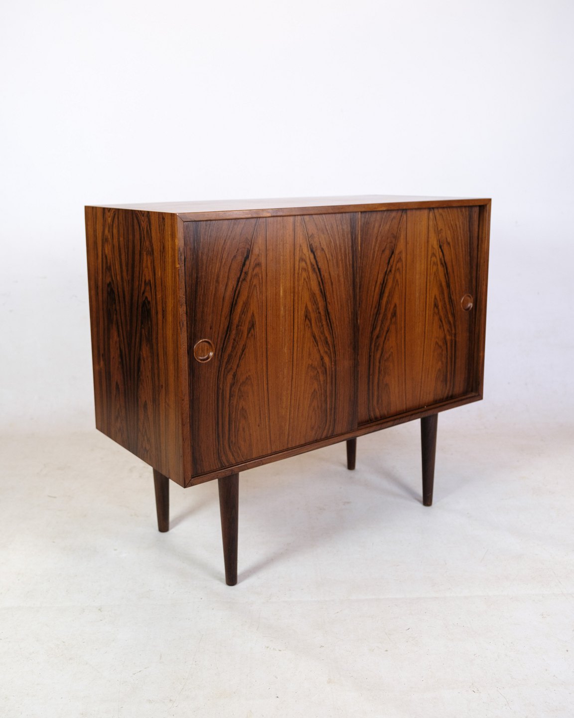 SolgtEn lille kommode med front af to skydedøre bag med hylder og skuffer i palisander med tilspidsede ben fremstillet af Dansk Møbelproducent omkring 1960'erne.