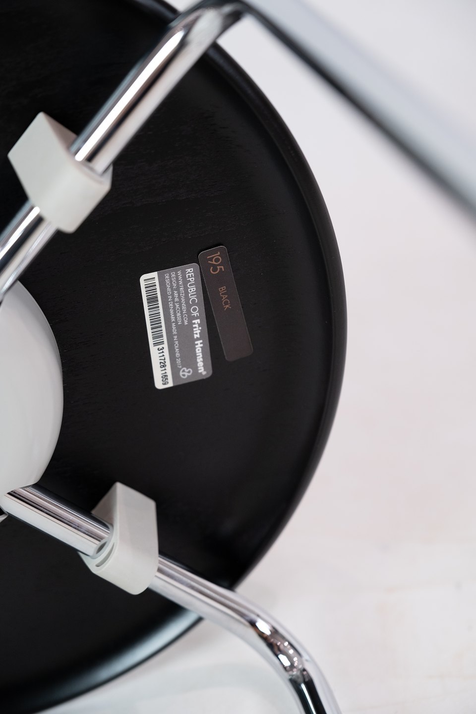 Skamlerne har en stel af forkromet stålrør, der giver dem en let og elegant fremtoning. Sædet er lavet af sort askefiner, der tilføjer varme og kontrast til det strømlinede stålstel. Den enkle og funktionelle form gør disse skamler velegnede til en lang række indretningsstile og anvendelsesformål.
