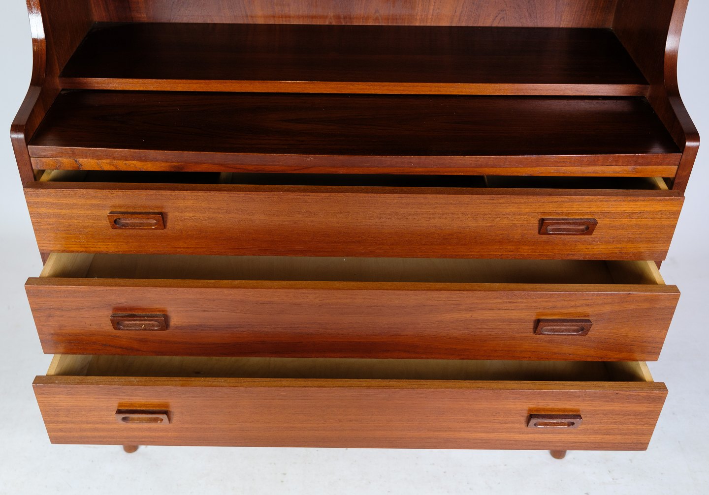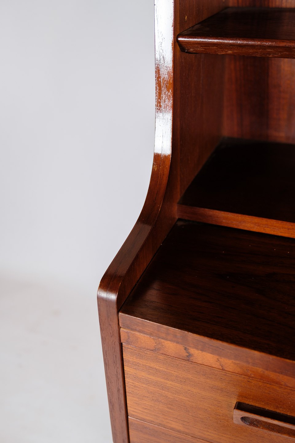 Den kombination af funktionalitet og æstetik, som er karakteristisk for dansk design fra denne æra, er tydeligt til stede i dette møbel. Teaktræets varme farver og naturlige skønhed tilføjer en indbydende atmosfære til ethvert rum, samtidig med at den robuste konstruktion sikrer holdbarheden. Med sin tidløse elegance vil denne teakreol være et smukt og funktionelt tilføjelse til dit hjem.