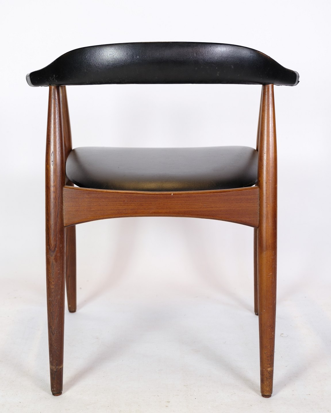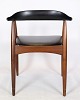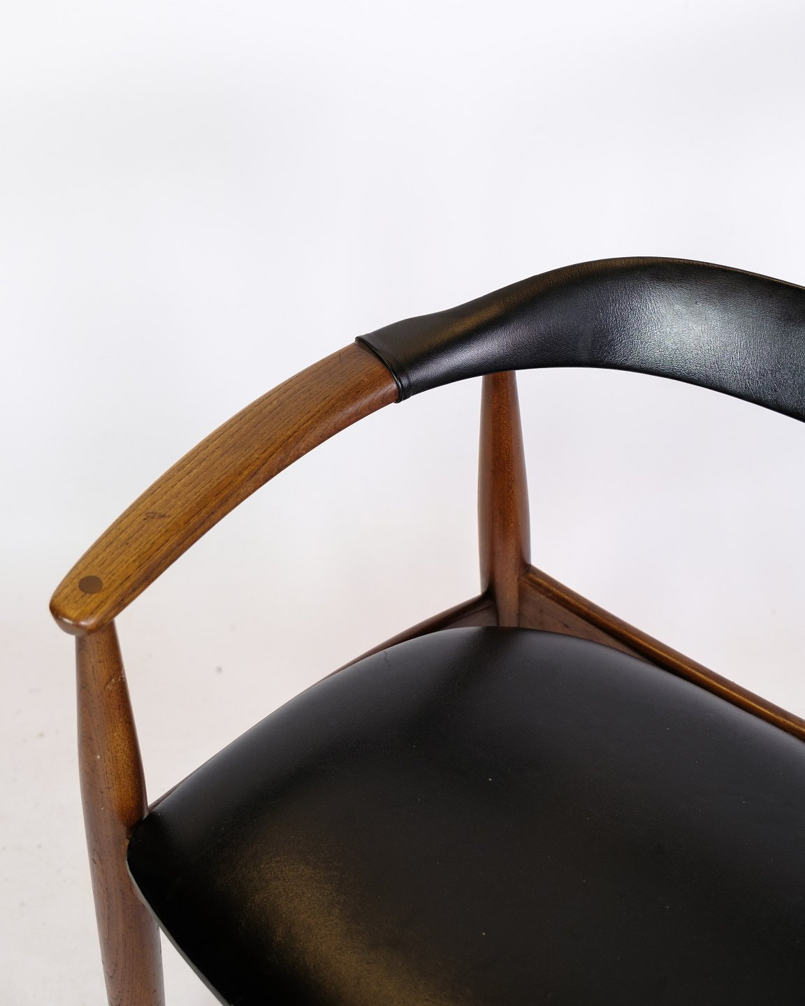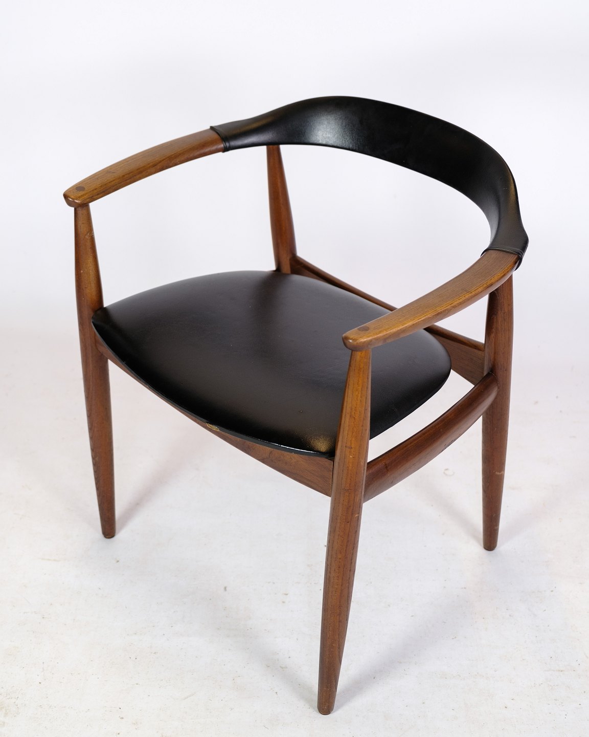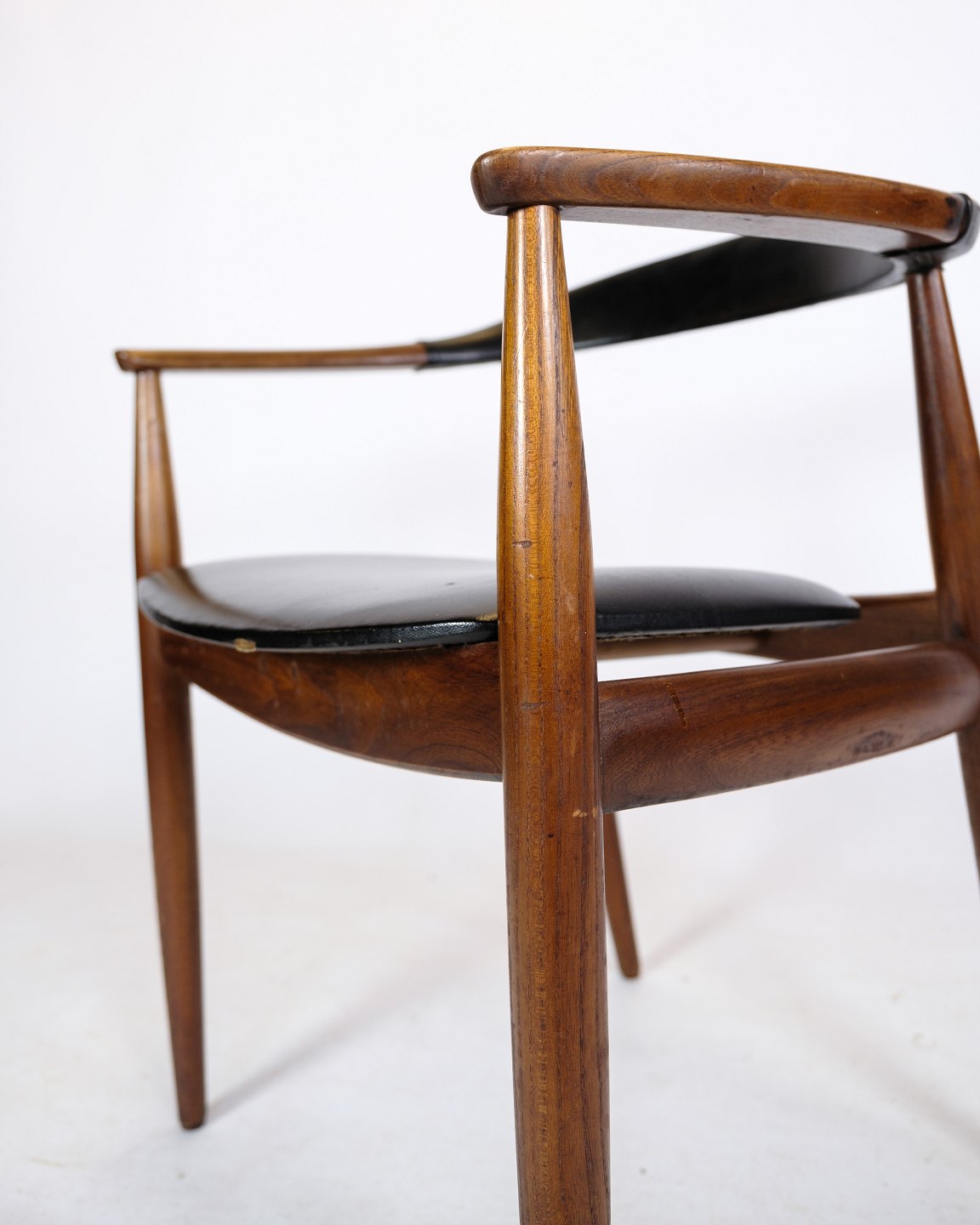 SolgtArmstol i teaktræ og sort kunstlæder, designet af Illum Wikkelsø for Niels Eilersen fra omkring 1960'erne.