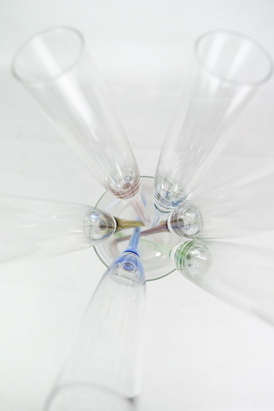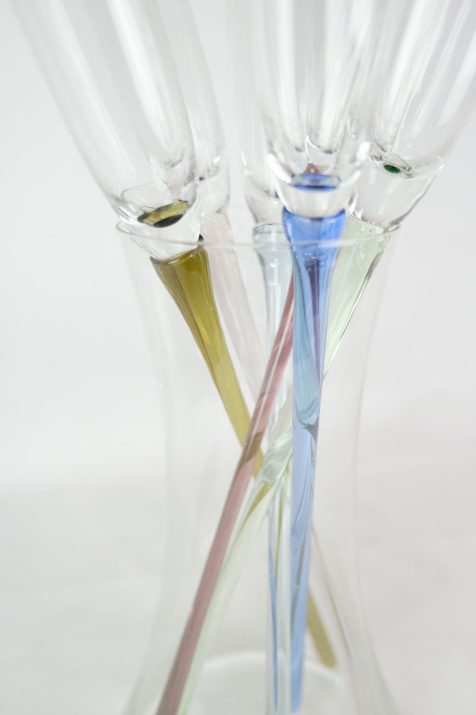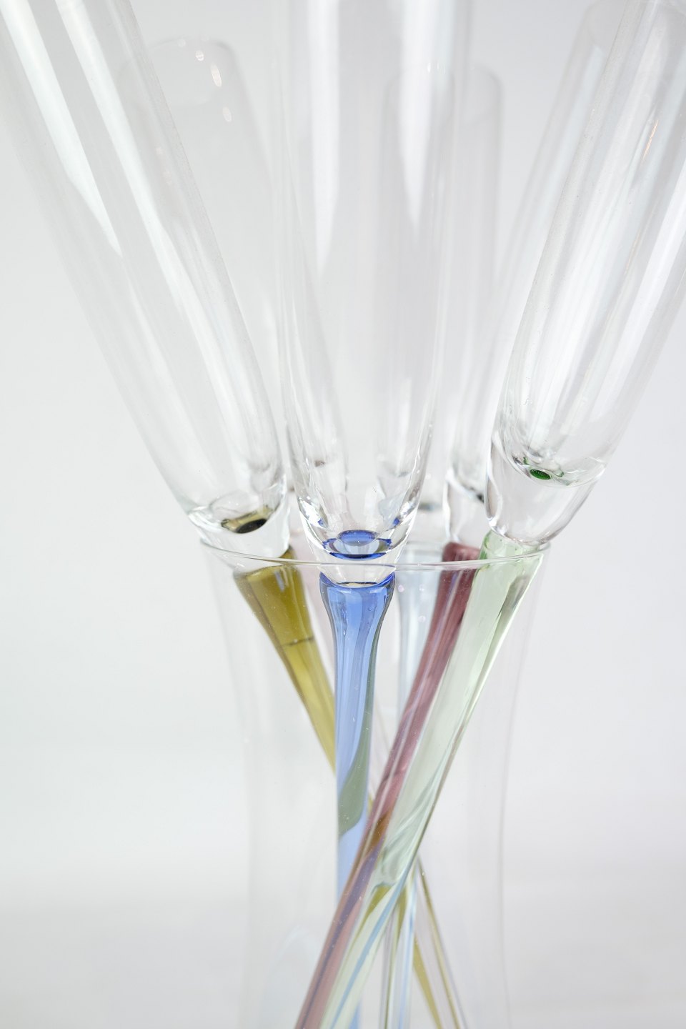 Serverings glas vase med champagne glas på stilk med forskellige farver. Sælges som sæt.