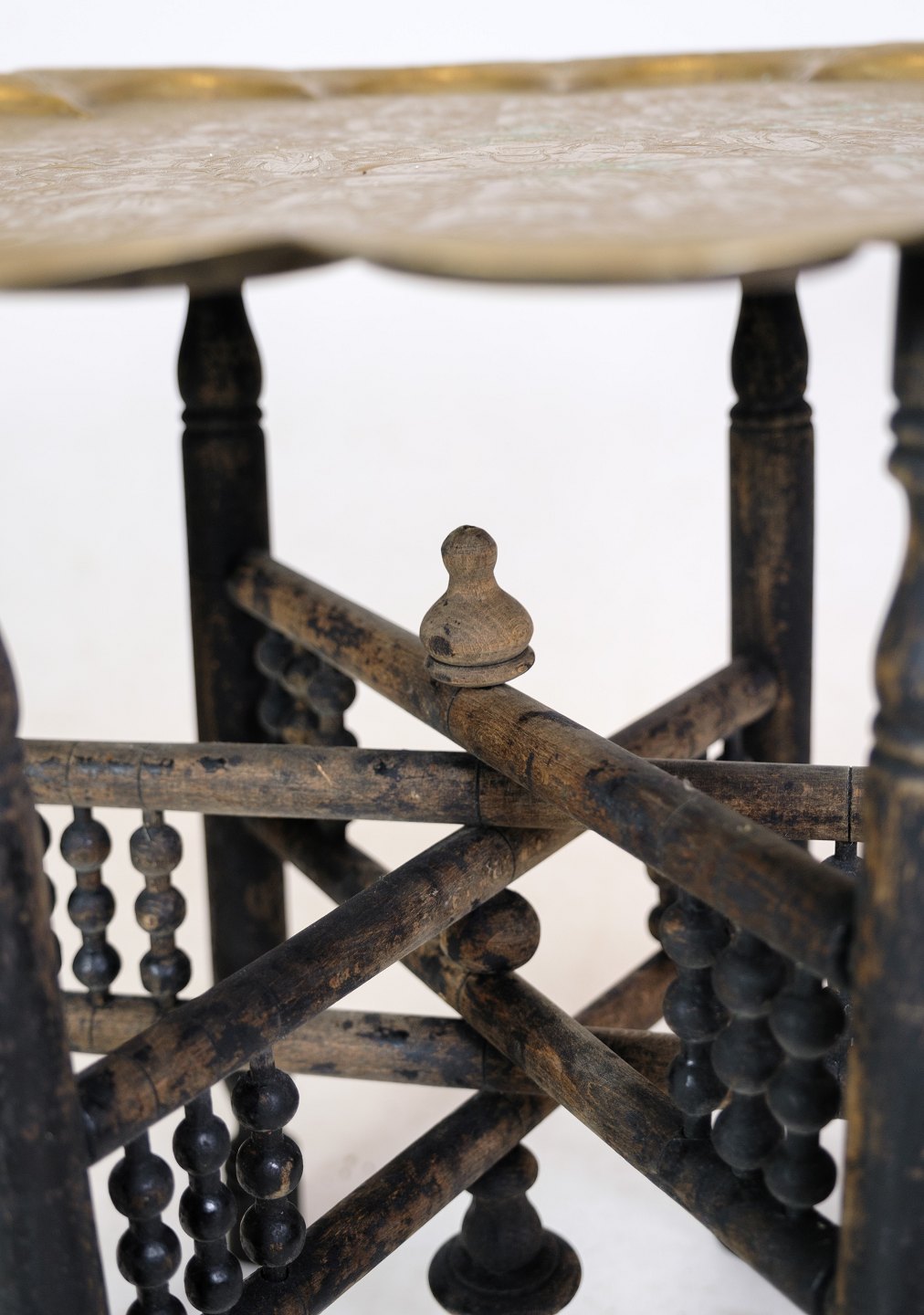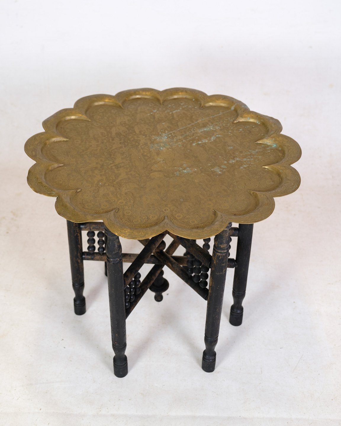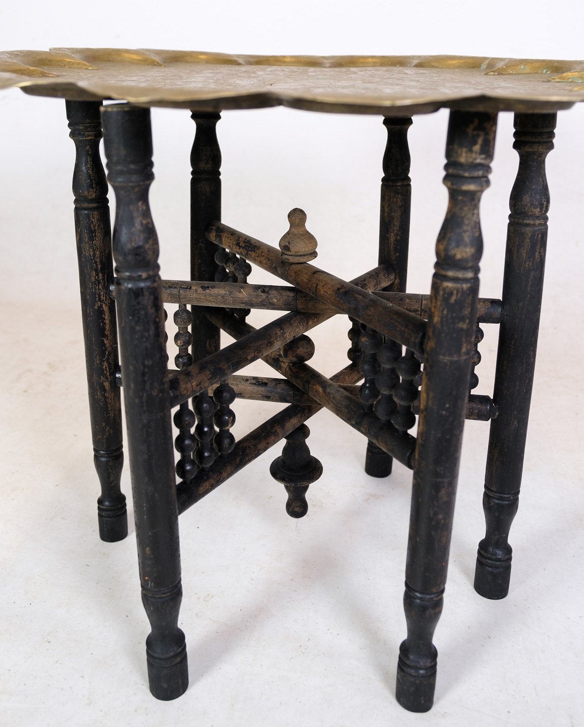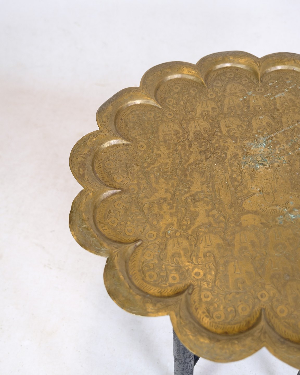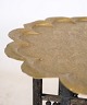 Indisk bakkebord i form af messing bakke og understel af træ med udskæringer fra omkring år 1950'erne.