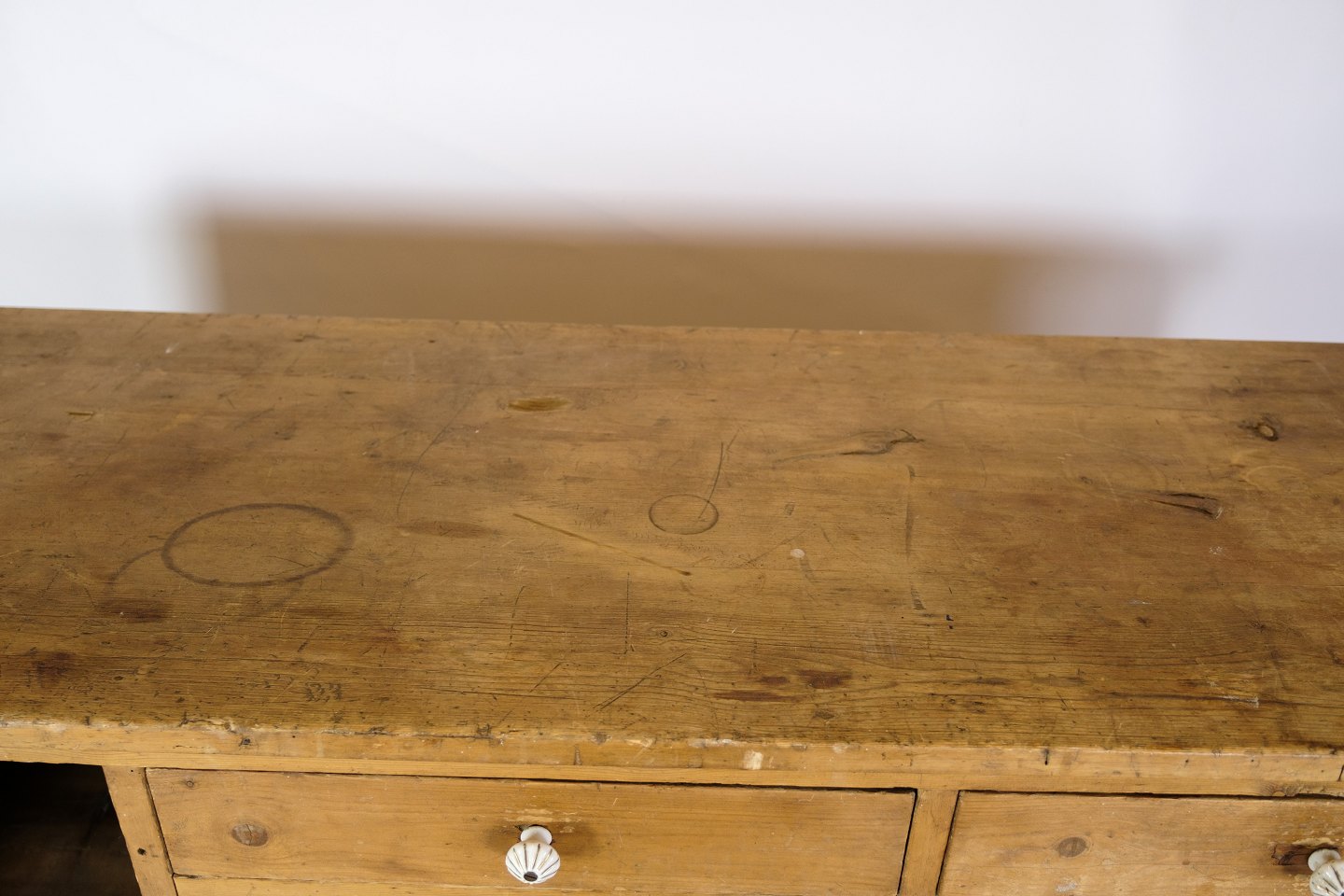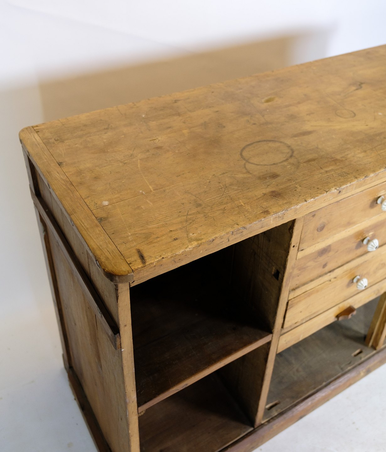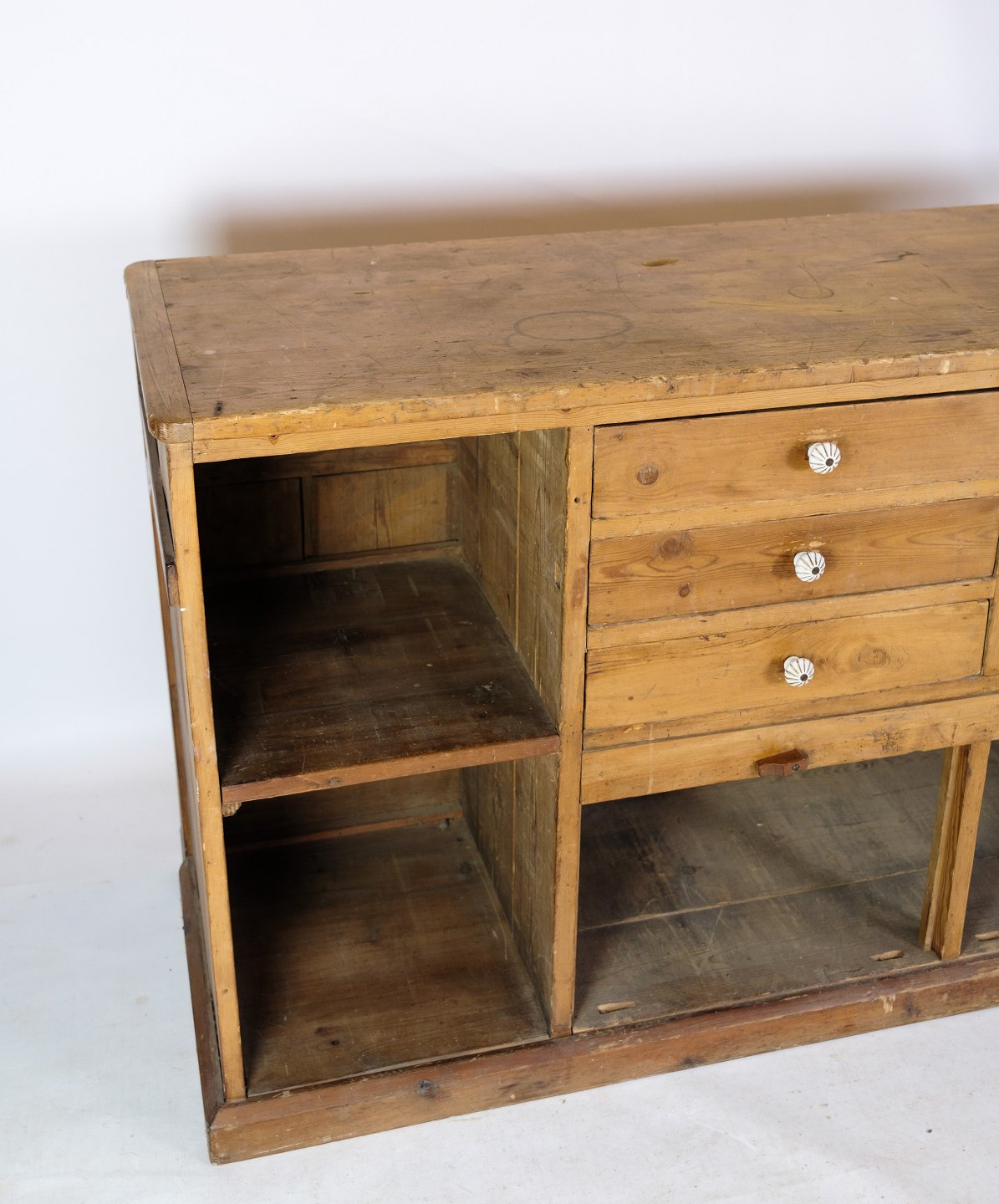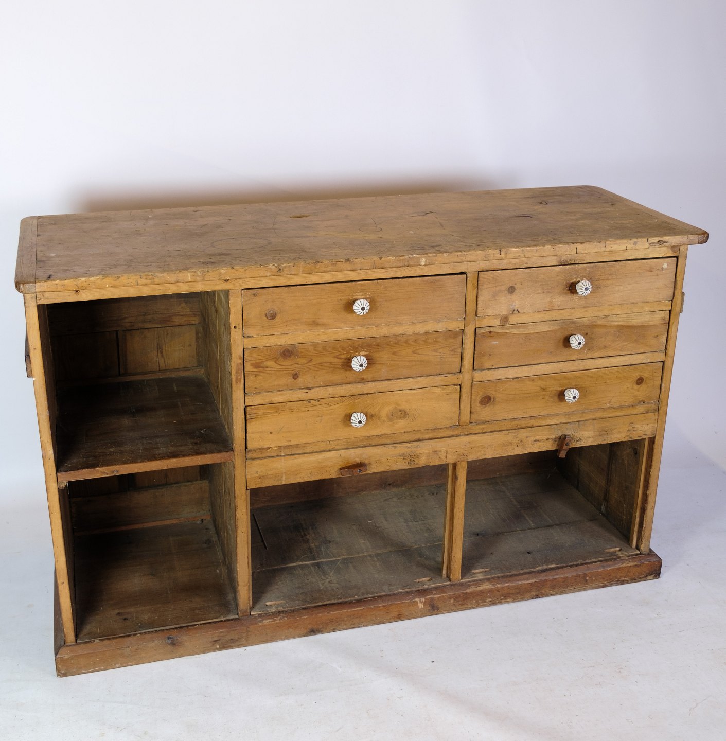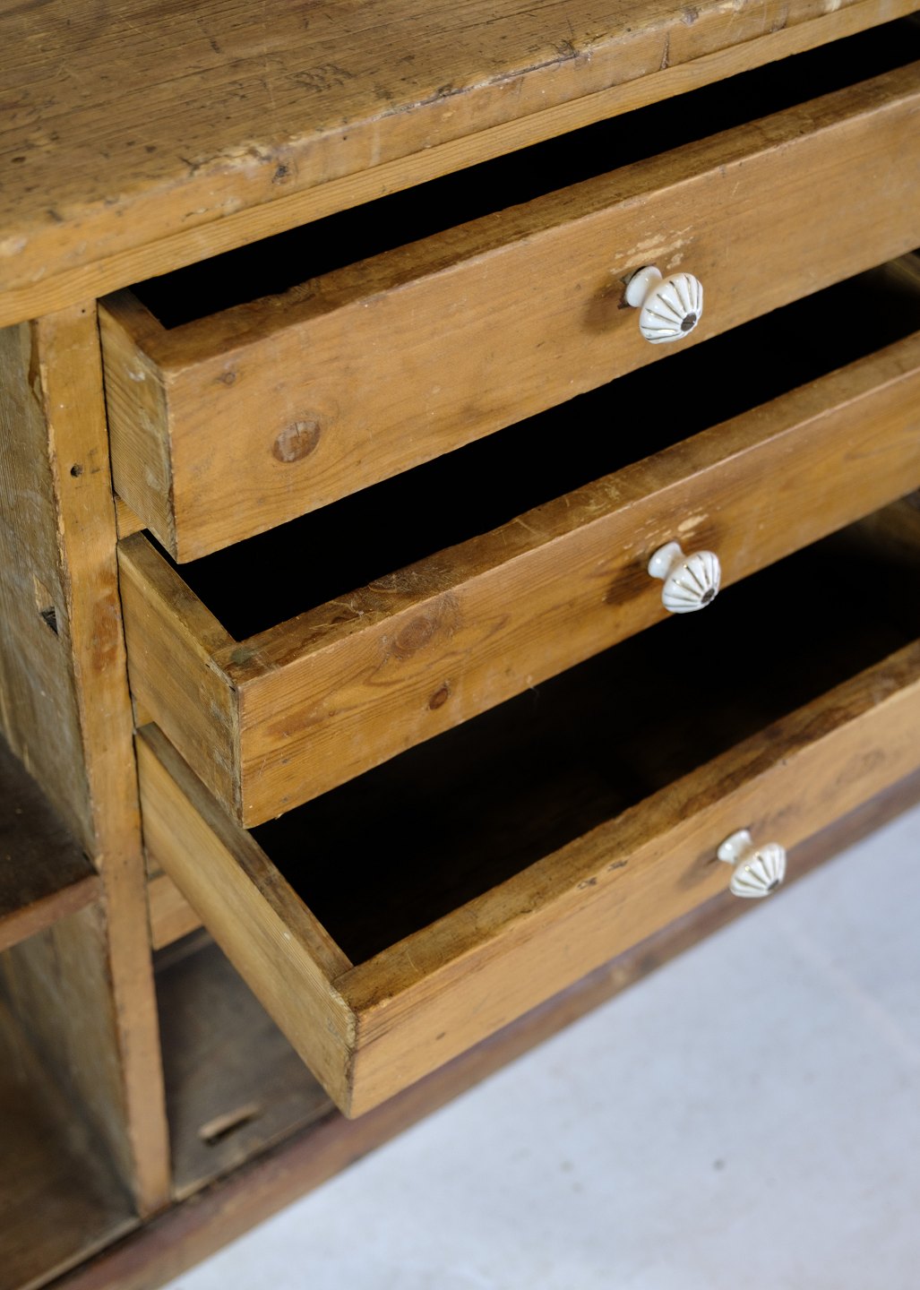 SolgtAntik købmandsdisk i lys fyrretræ med hylder og skuffer i let patinering fra omkring 1910.