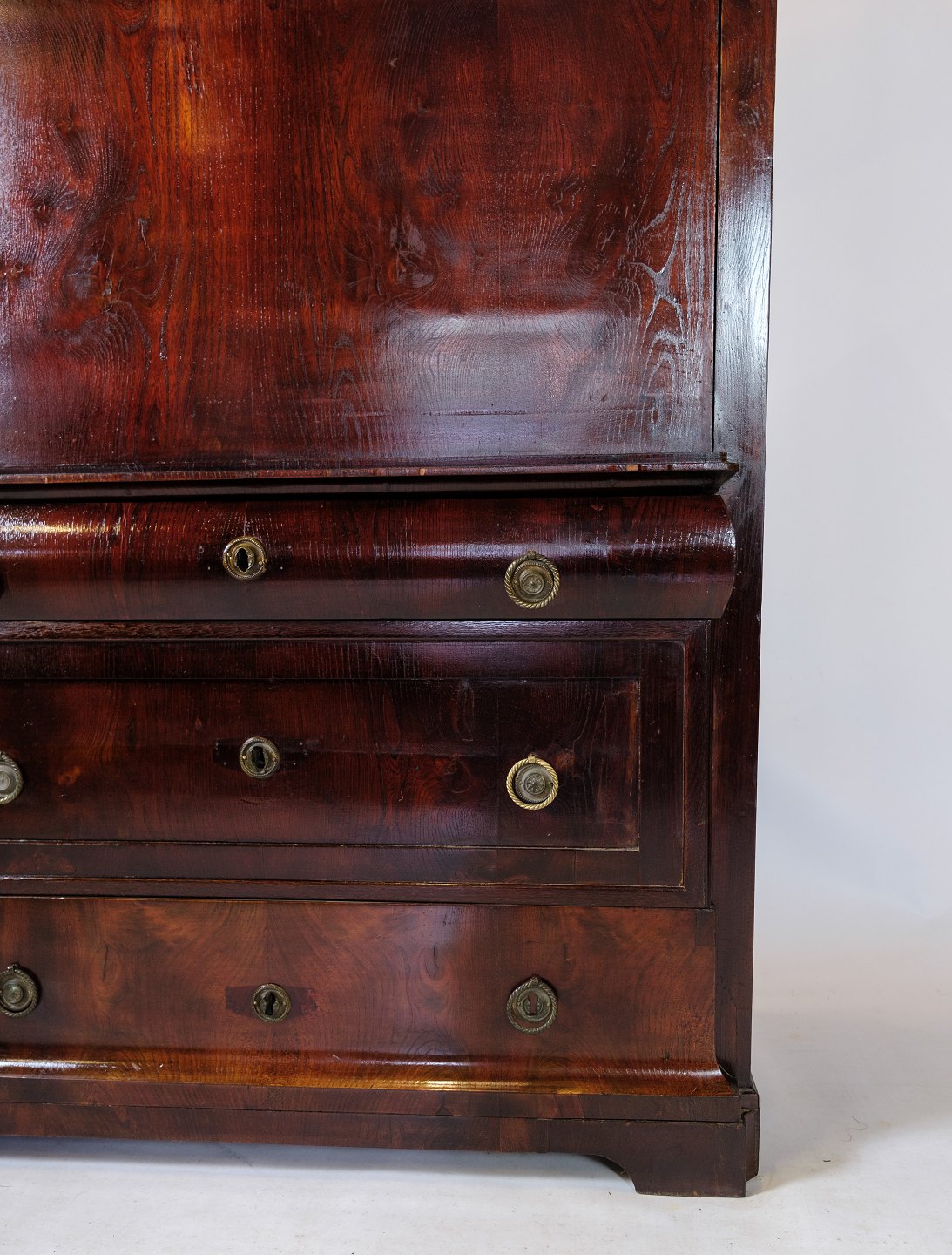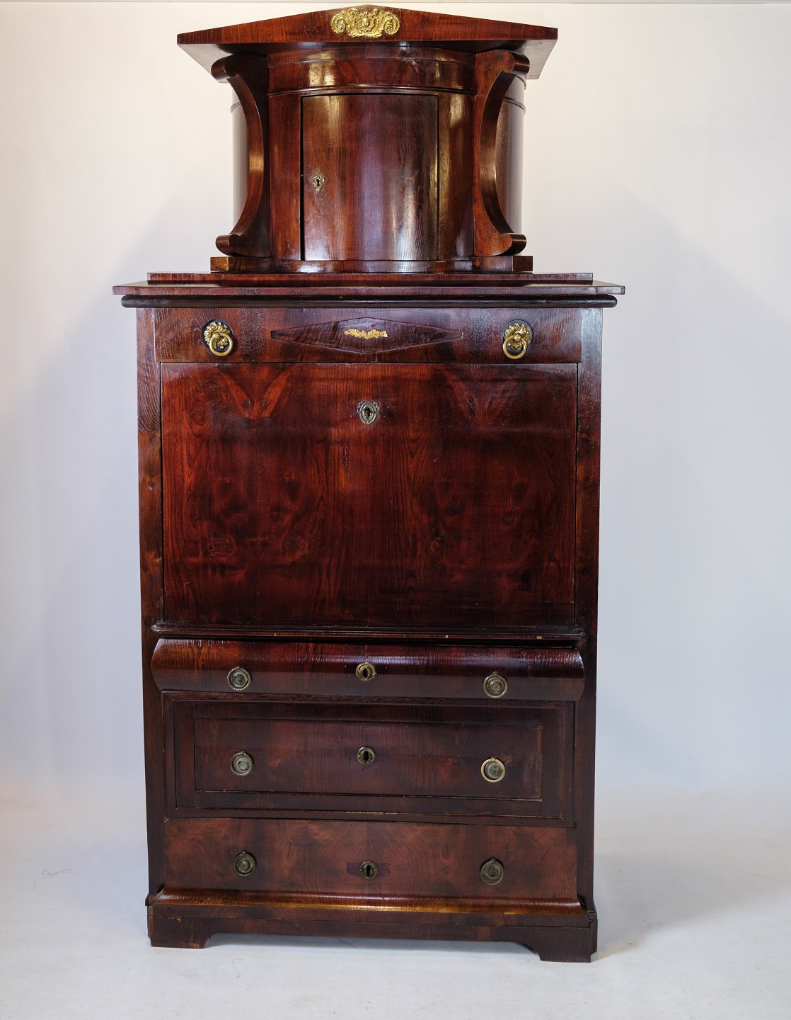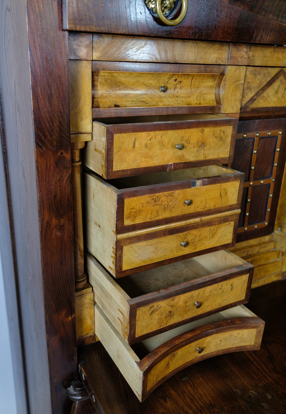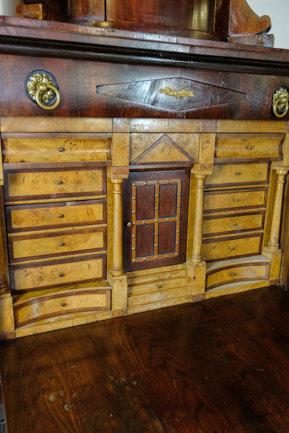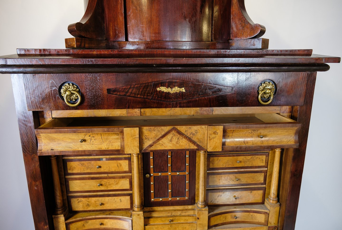 Kontakt os vedrørende prisTysk sekretær af patineret elmetræ med top og messing beslag udsmykket med intarsia fra Berlin omkring 1840'erne.