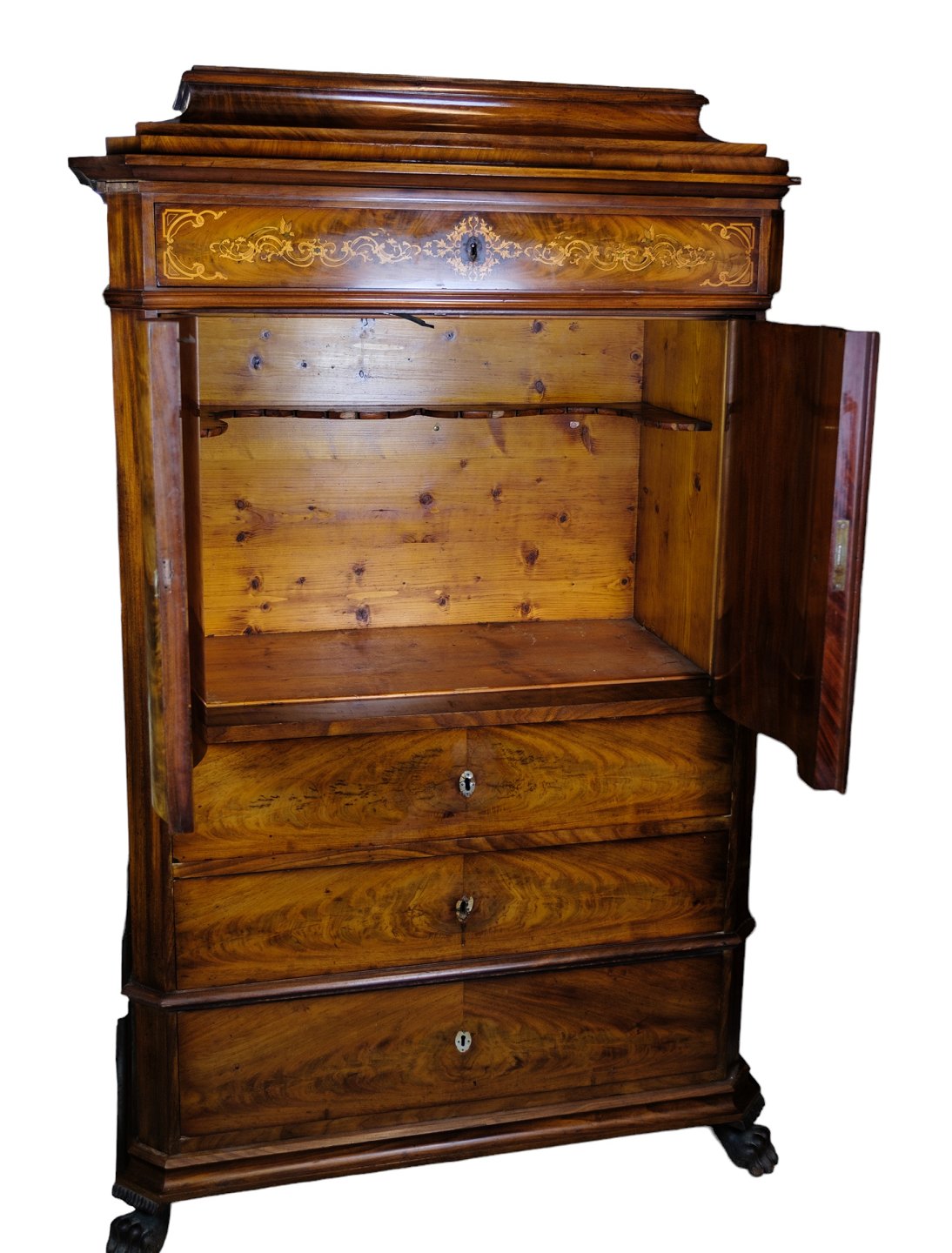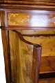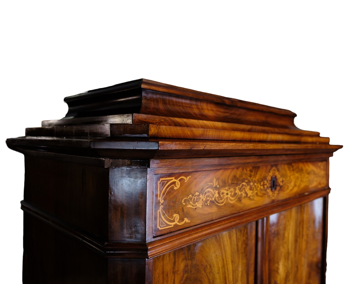 Stort skab af poleret mahogni og valnød udsmykket med intarsia hertil skuffer i bunden og låger med indvendig hylde fra omkring år 1880'erne.