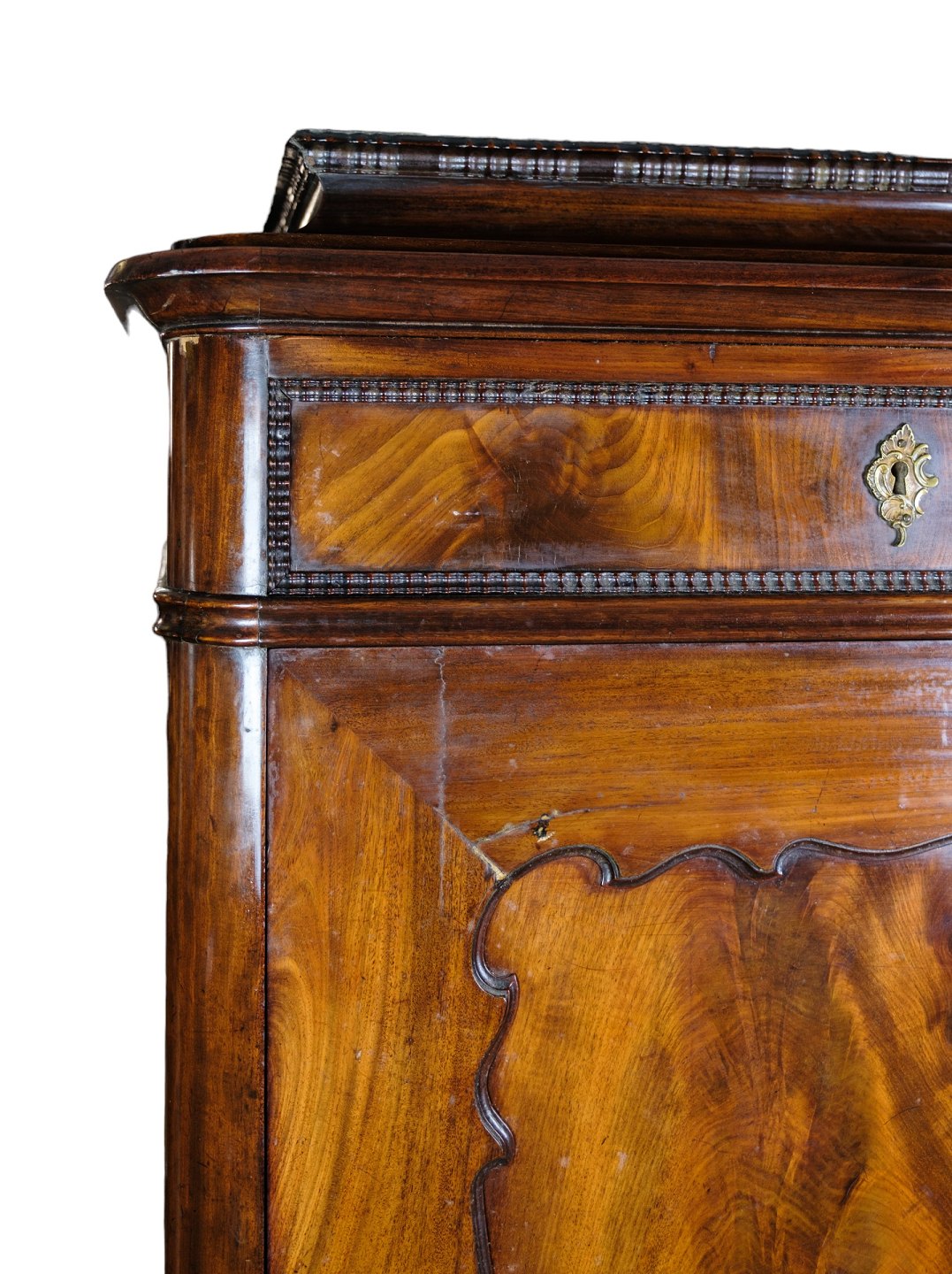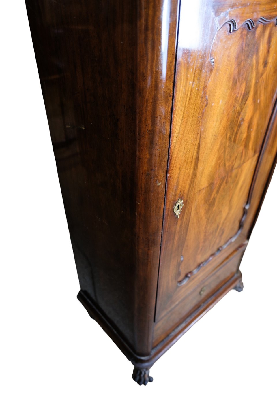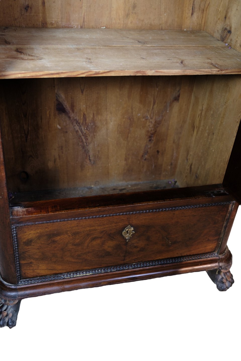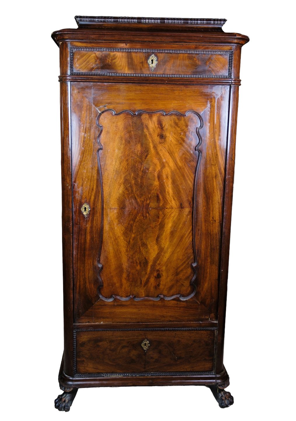 Højt skab af poleret mahogni i flot antik stand med 2 skuffer og en låge med hylder fra 1850erne.