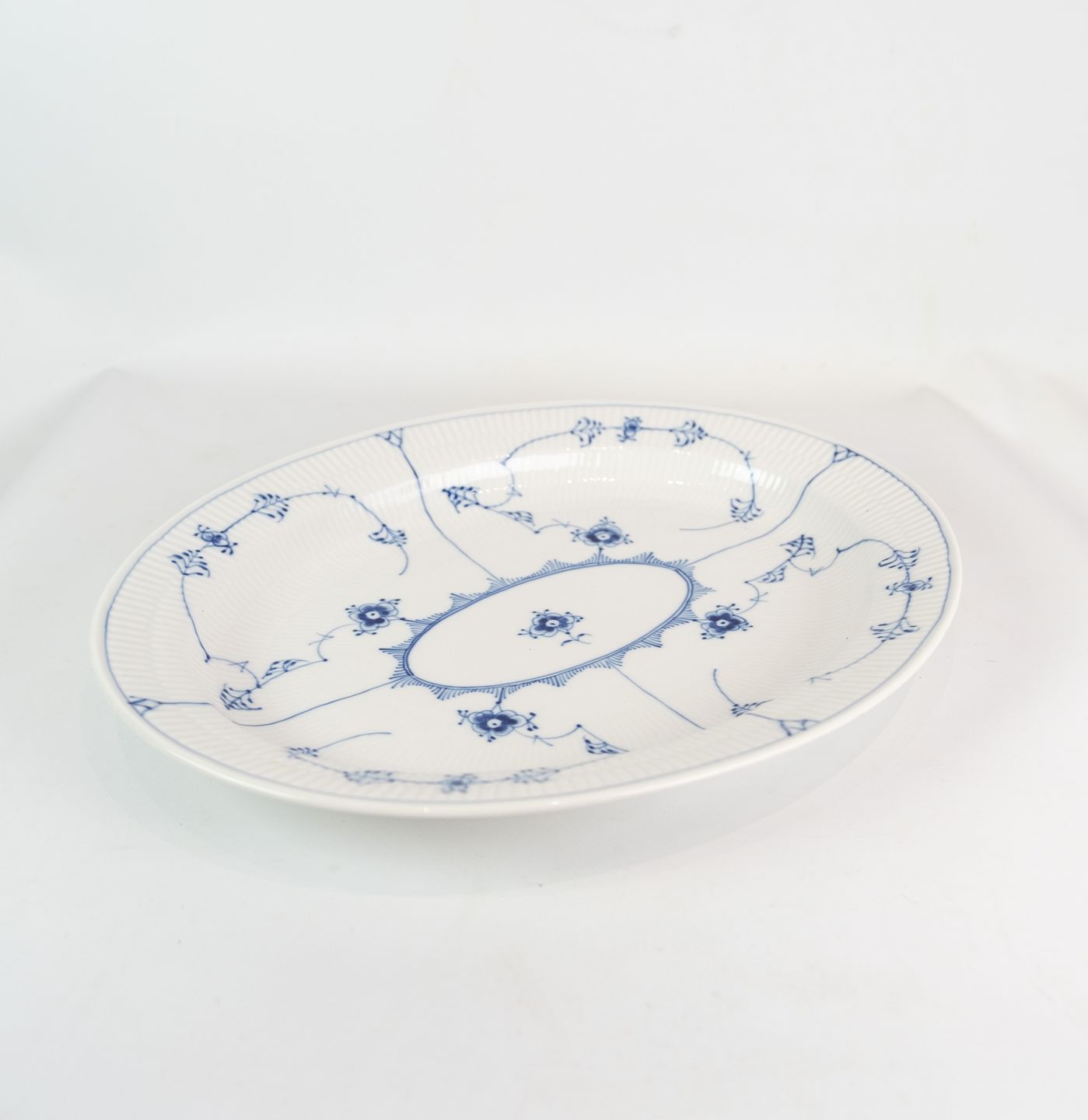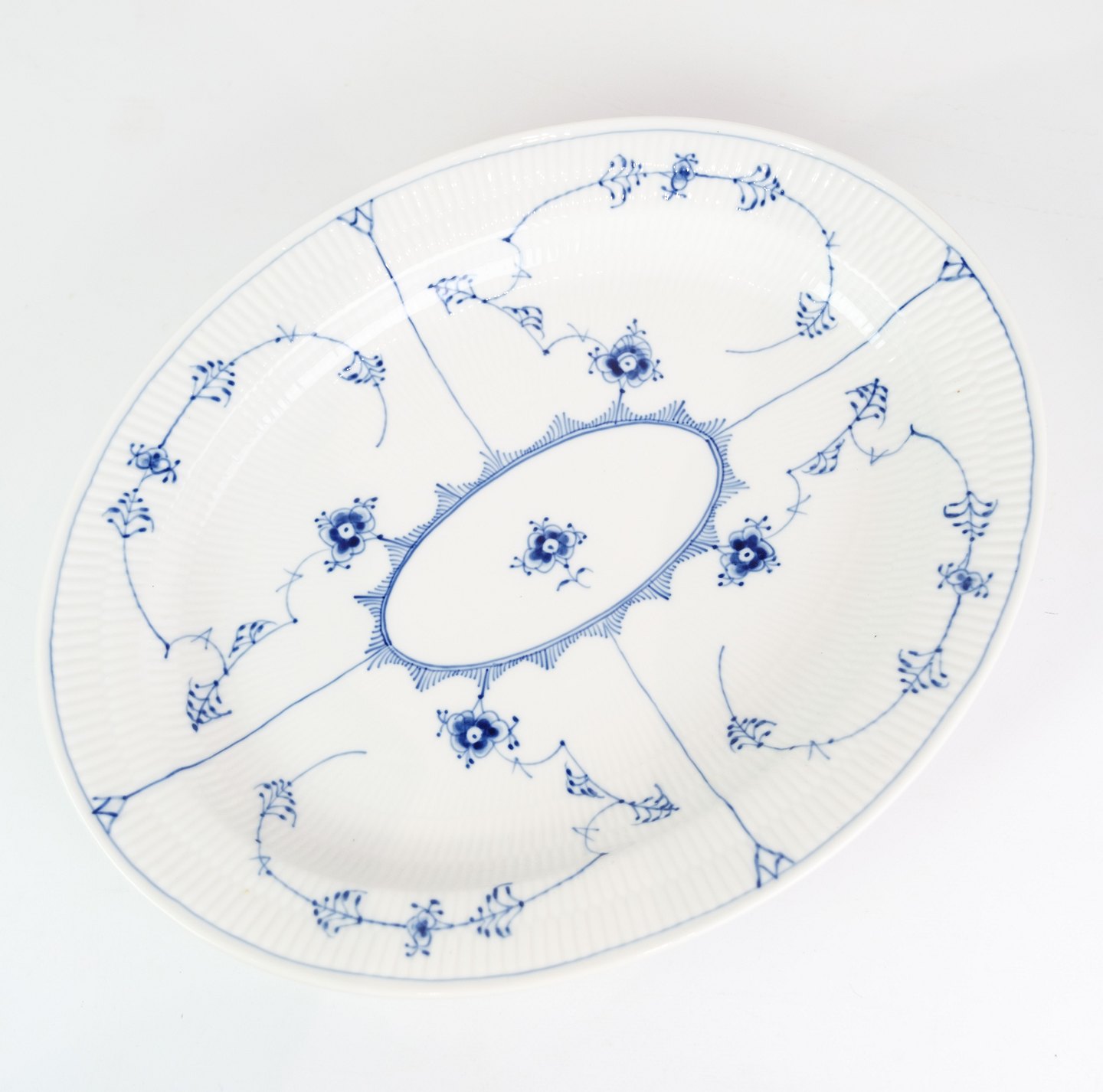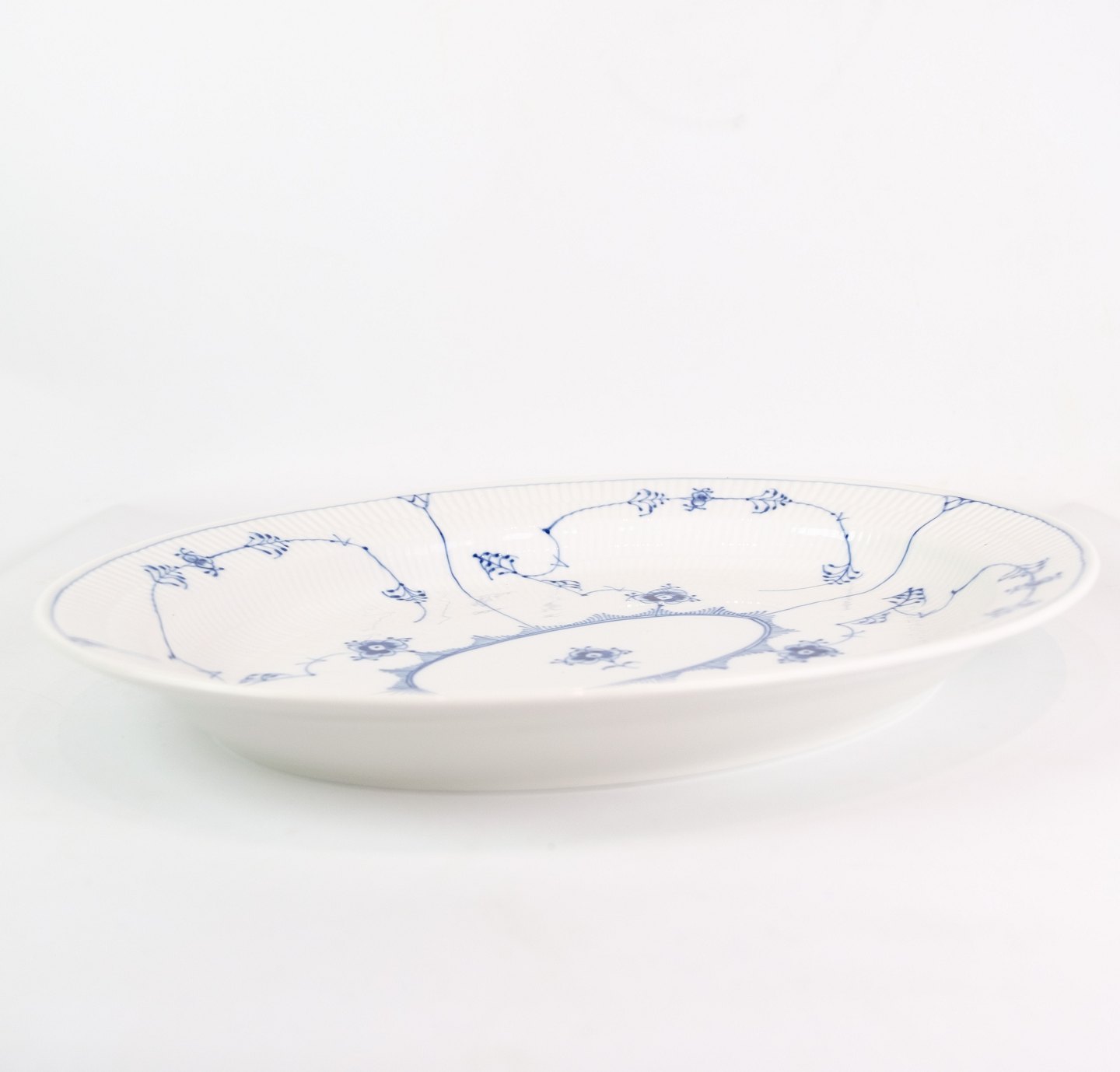 Dette serveringsfad er en del af den ikoniske Musselmalet Riflet-serie, der er kendt for sit karakteristiske Riflet-mønster. Mønsteret består af delikate blåmønstre, der pryder fadets overflade og giver det et klassisk og sofistikeret udseende.